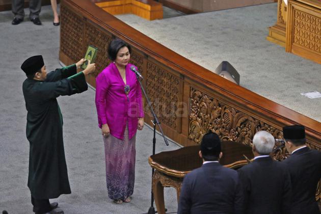 Anggota PAW Alfia Reziani mengikuti jalannya sidang usai di lantik pada penutupan sidang Paripurna ke-22 masa sidang III Tahun 2015-2016 di Komplek Parlemen Senayan, Jakarta, Kamis (17/3). Penutupan Masa Persidangan III Tahun Sidang 2015-2016. Didahului dengan Pelantikan Anggota Pengganti Antar Waktu DPR RI Alfia Reziani menggantikan Politikus PDI Perjuangan Puan Maharani yang saat ini menjabat sebagai Menko Pembangunan Manusia dan Kebudayaan. FOTO: AKTUAL/JUNAIDI MAHBUB