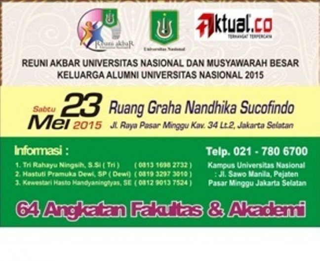 “Alumni perlu mengetahui hal ini sehingga dapat membangkitkan kebanggaan sebagai lulusan UNAS. Acara ini kami selenggarakan atas kerjasama dengan Aktual.co sebagai media partner kami,” ungkap Tri Rahayuningsih, selaku panitia pengumpulan data yang dapat dihubungi di nomor kontak 081316982732.