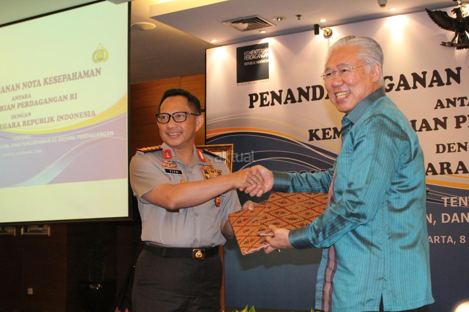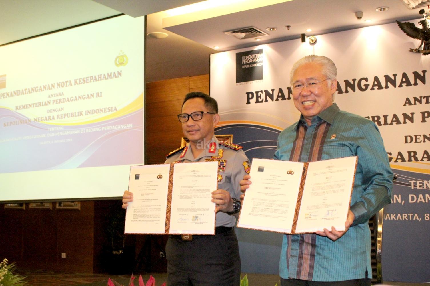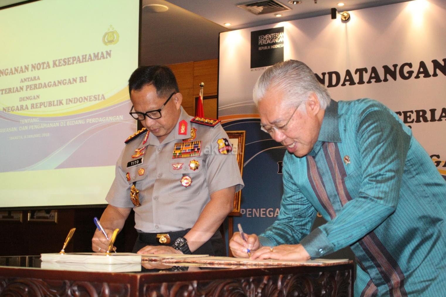 Menteri Perdagangan (Mendag) Enggartiasto Lukita (kanan) Kapolri Jenderal Polisi Tito Karnavian (kiri) menandatangani nota kesepahaman (MoU) tentang penegakan hukum, pengawasan, dan pengamanan di bidang perdagangan di Jakarta. Senin (8/1/2018). MoU ini merupakan perpanjangan dari perjanjian sebelumnya yang ditandatangani pada 4 Januari 2013 dan telah berakhir pada 4 Januari 2018. Dengan demikian maka untuk terus bisa melindungi konsumen dalam kegiatan perdagangan, MoU tersebut diperpanjang. AKTUAL/Tino Oktaviano