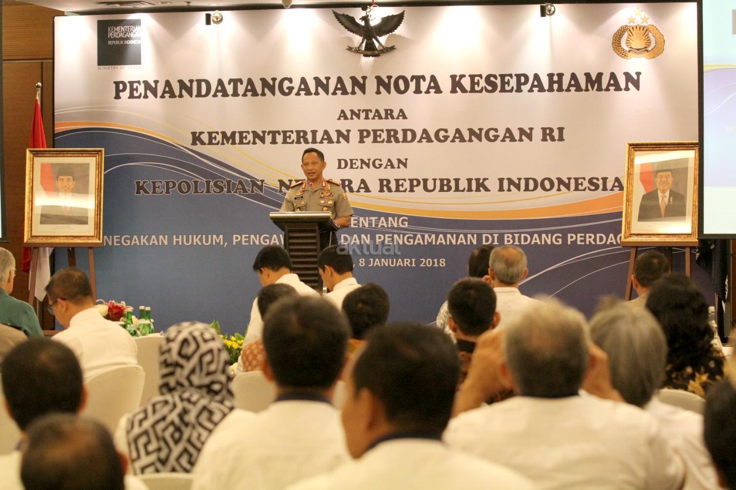 Kapolri Jenderal Polisi Tito Karnavian memberikan sambutan saat acara penandatanganan nota kesepahaman (MoU) tentang penegakan hukum, pengawasan, dan pengamanan di bidang perdagangan di Jakarta. Senin (8/1/2018). MoU ini merupakan perpanjangan dari perjanjian sebelumnya yang ditandatangani pada 4 Januari 2013 dan telah berakhir pada 4 Januari 2018. Dengan demikian maka untuk terus bisa melindungi konsumen dalam kegiatan perdagangan, MoU tersebut diperpanjang. AKTUAL/Tino Oktaviano