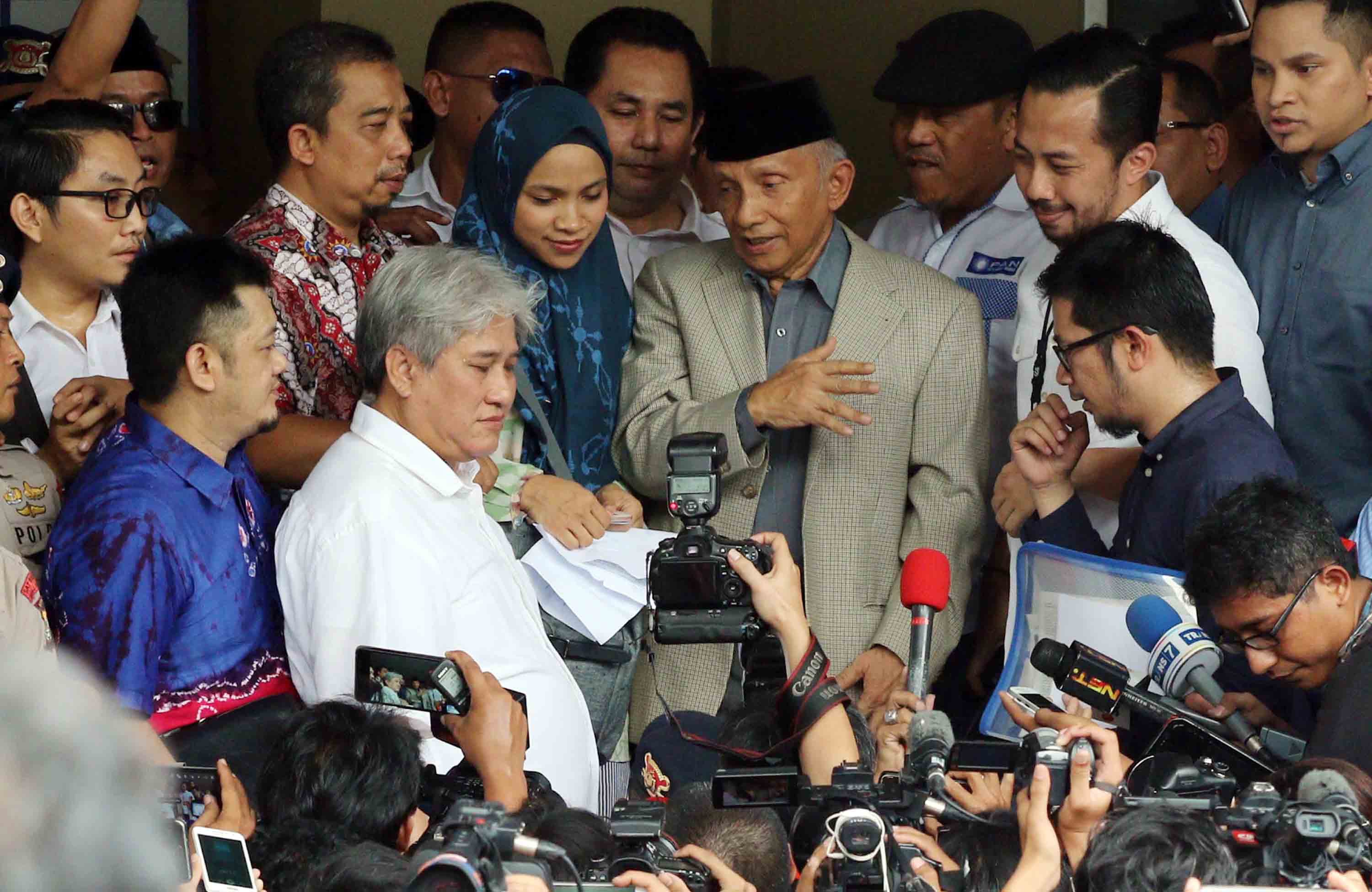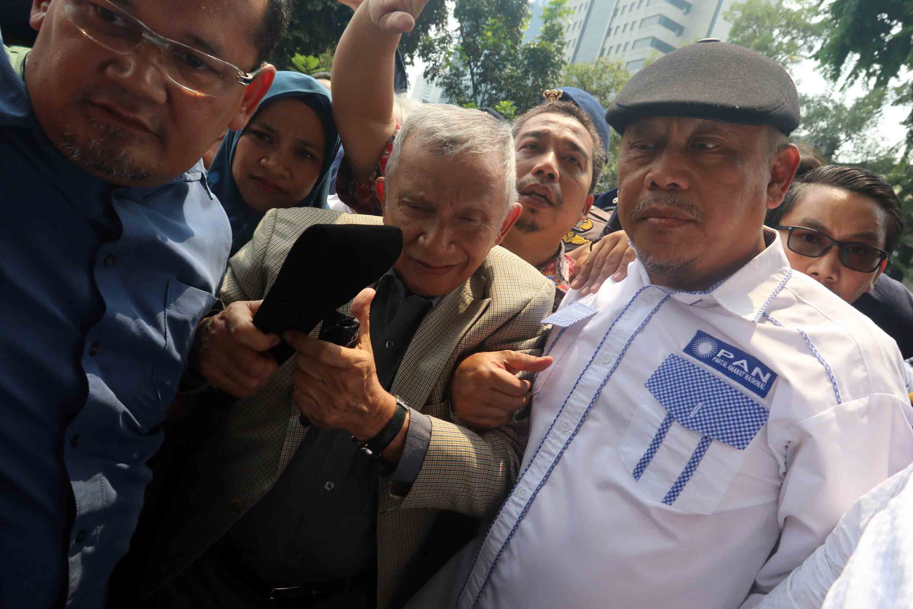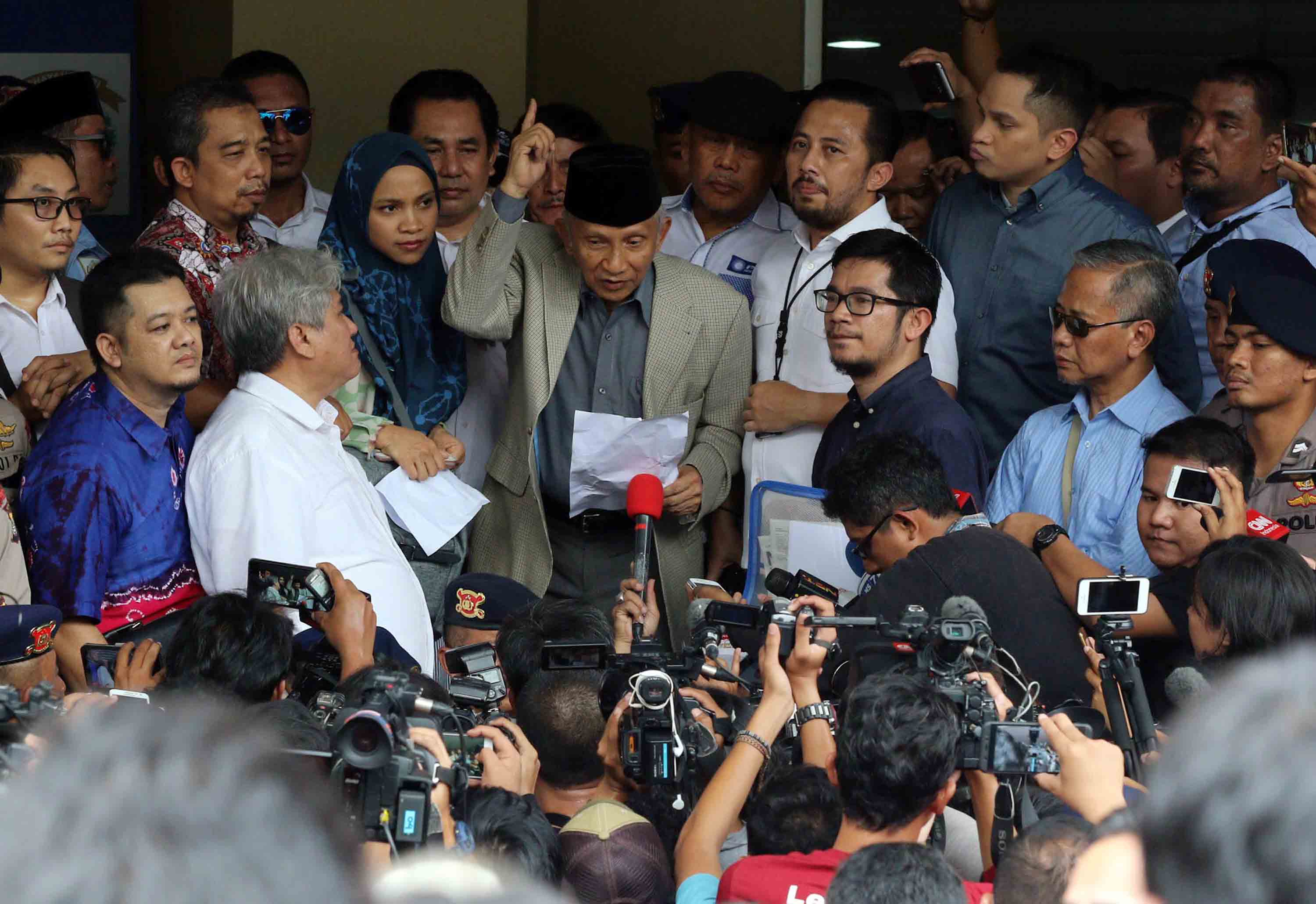 Ketua Dewan Kehormatan Partai Amanat Nasional (PAN) Amien Rais saat akan menjalani pemeriksaan di Direktorat Kriminal Umum Polda Metro Jaya, Jakarta, Rabu (10/10). Penyidik Direktorat Kriminal Umum melakukan pemeriksaan terhadap Amien Rais sebagai saksi terkait kasus berita bohong untuk tersangka Ratna Sarumpaet. AKTUAL/Tino Oktaviano