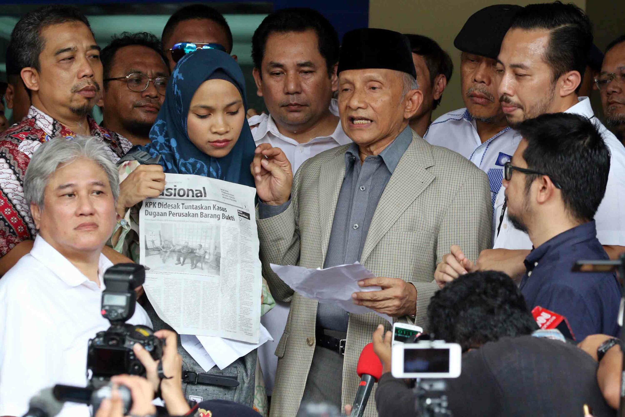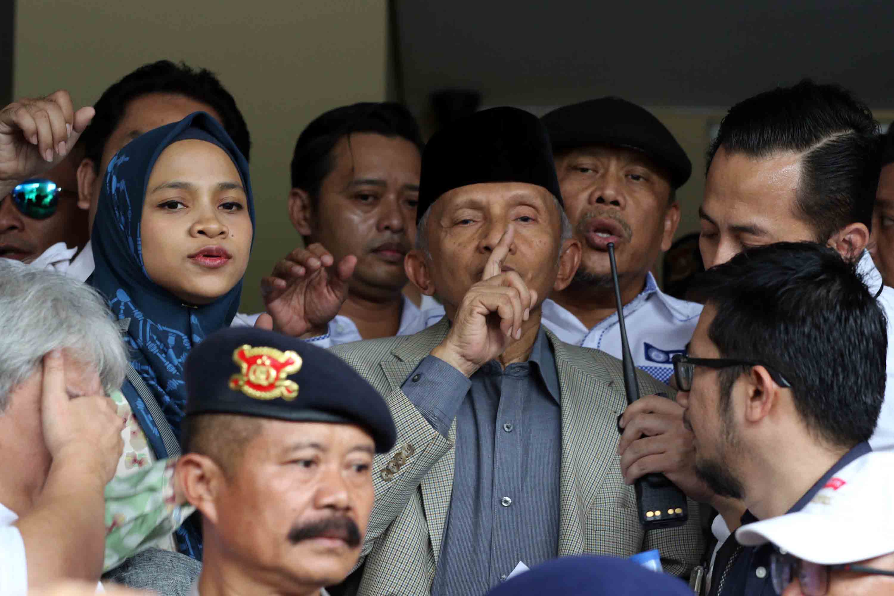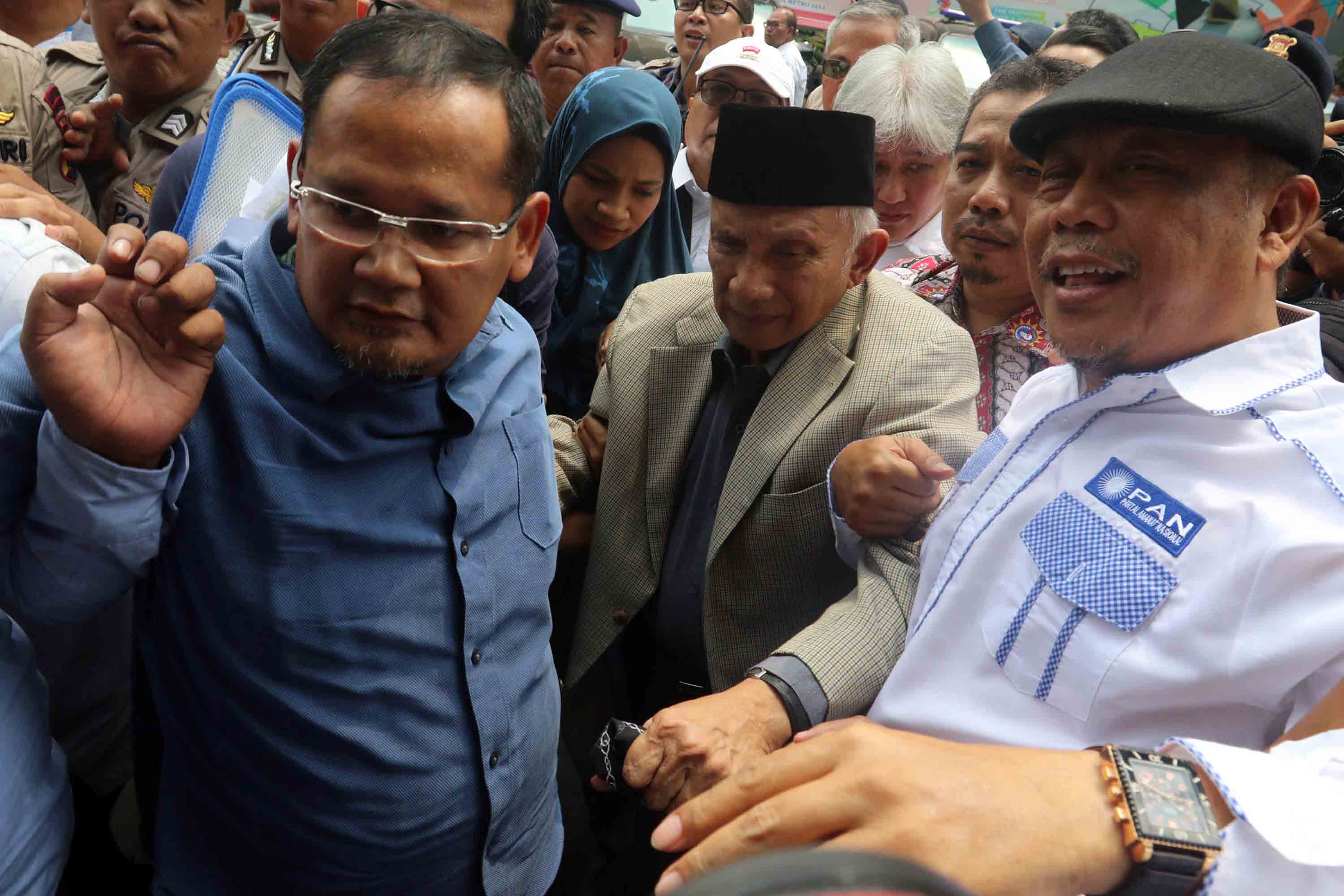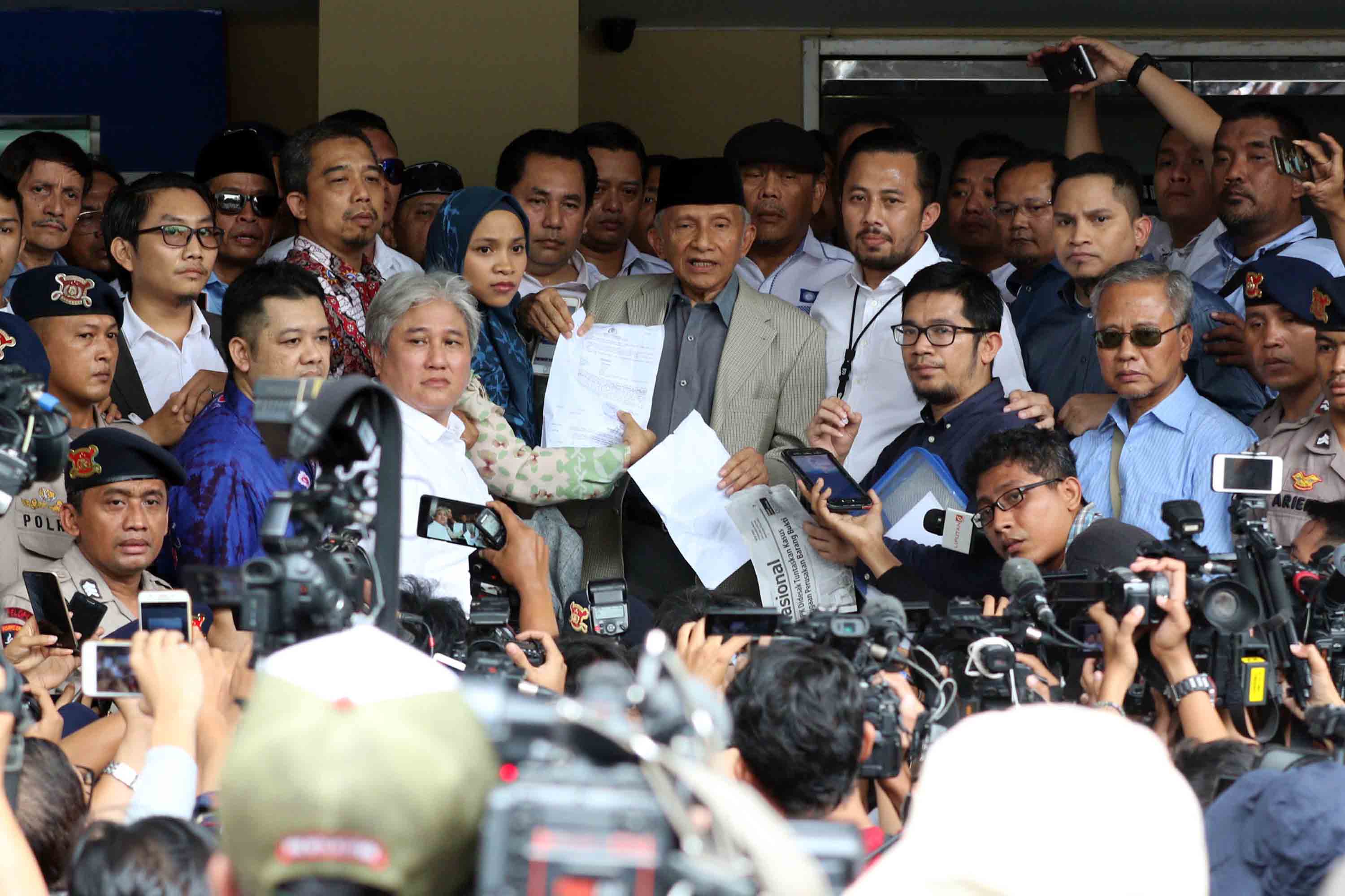 Ketua Dewan Kehormatan Partai Amanat Nasional (PAN) Amien Rais saat akan menjalani pemeriksaan di Direktorat Kriminal Umum Polda Metro Jaya, Jakarta, Rabu (10/10). Penyidik Direktorat Kriminal Umum melakukan pemeriksaan terhadap Amien Rais sebagai saksi terkait kasus berita bohong untuk tersangka Ratna Sarumpaet. AKTUAL/Tino Oktaviano
