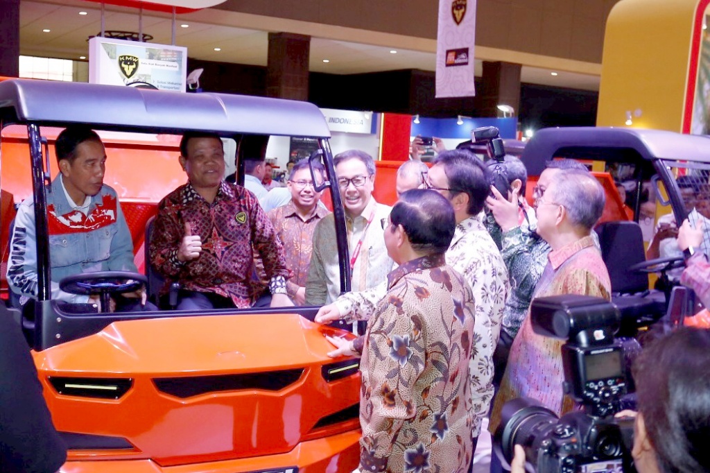 Presiden Republik Indonesia Joko Widodo (kiri) mencoba pre-prototype Alat Mekanis Multiguna Pedesaan (AMMDes) Kiat Mahesa Wintor didampingi oleh Direktur Utama PT Kiat Inovasi Indonesia Sukiyat (kedua kiri) disaksikan oleh Presiden Direktur PT Astra International Tbk Prijono Sugiarto (keempat kiri) pada acara pembukaan Indonesia International Motor Show (IIMS) 2018 di Jakarta, Kamis (19/4). Astra mempertontonkan jenis kendaraan baru yaitu AMMDes. Dan ini 100 persen desain dan menggunakan komponen dari dalam negeri. AKTUAL/Eko S Hilman