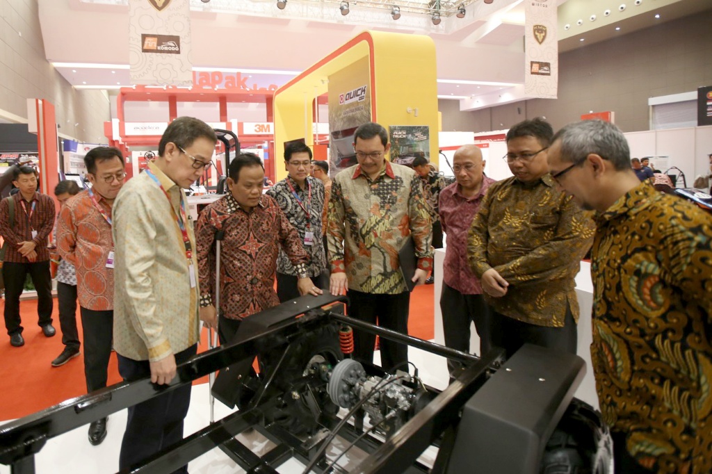 Direktur PT Velasto Indonesia Reiza Treistanto (kedua kanan) didampingi Operation Division Head Velasto Indonesia Plant Cikarang Muhammad Yasin (kanan) menjelaskan bagian sasis yang digunakan pre-prototypeAMMDes Kiat Mahesa Wintor kepada Presiden Direktur PT Astra International Tbk Prijono Sugiarto (kedua kiri) beserta direktur dan eksekutif Astra di IIMS 2018, Jakarta, Kamis (19/4). Astra mempertontonkan jenis kendaraan baru yaitu AMMDes. Dan ini 100 persen desain dan menggunakan komponen dari dalam negeri. AKTUAL/Eko S Hilman