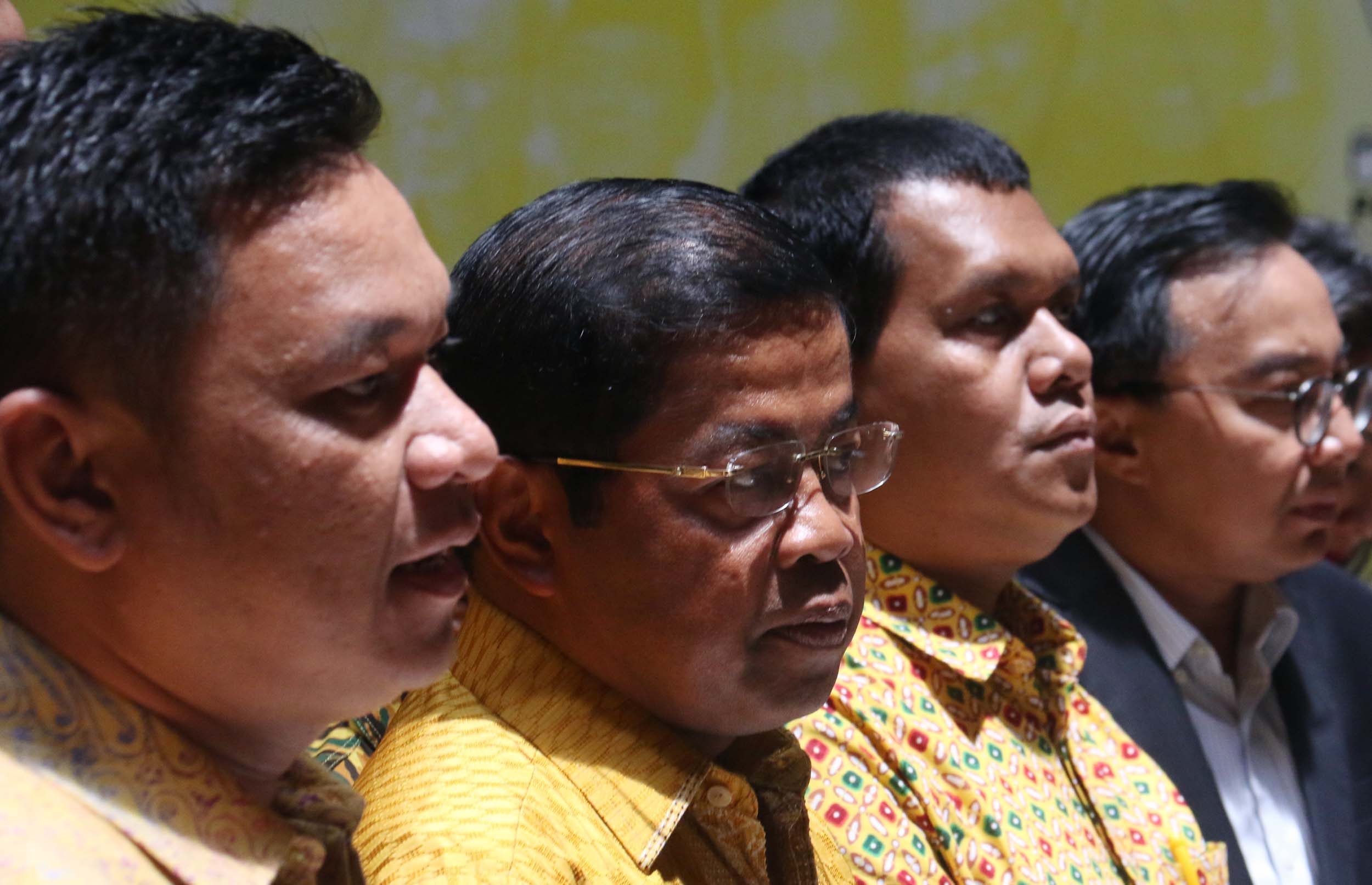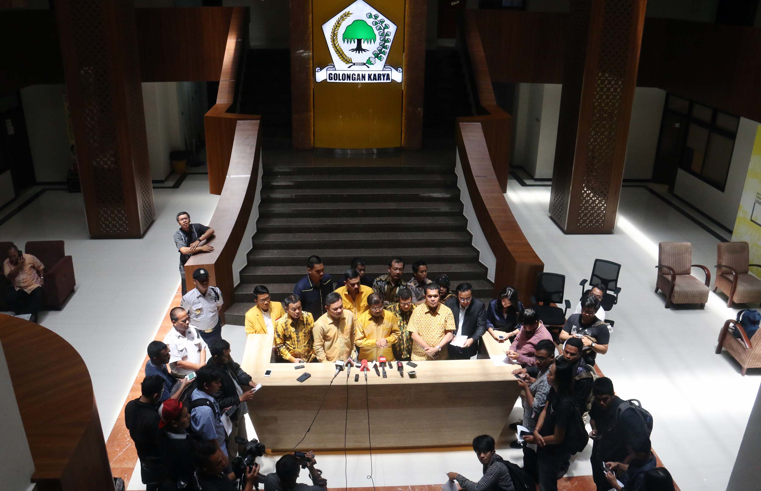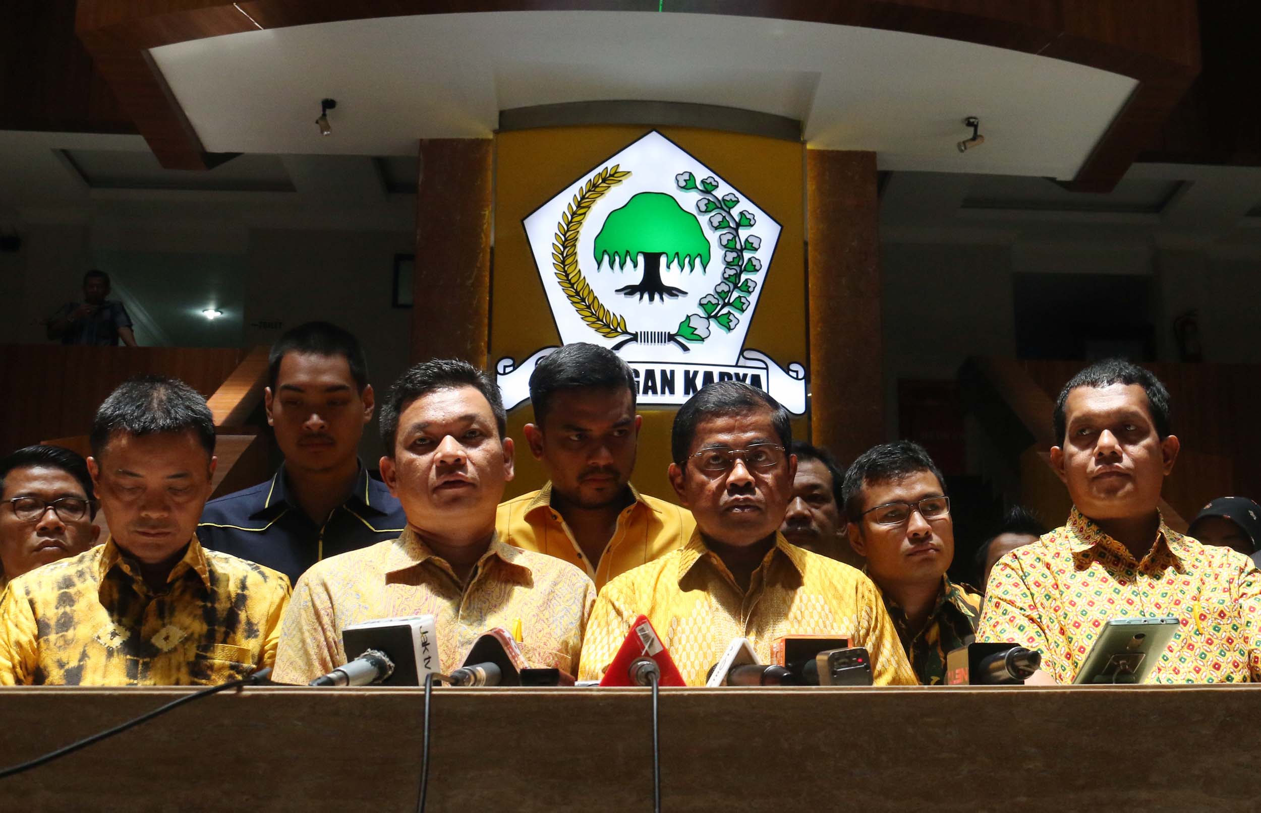 Sekjen DPP Partai Golkar Idrus Marham (tengah) di dampingi para pengurus DPP Partai Golkar, saat menggelar jumpa pers terkait hasil Rapimnas II AMPG di Makasar belom lama ini, yang merekomendasikan mendukung Ketua Umum DPP Partai Gokar Setya Novanto sebagai Cawapres pada Pilpres 2019, di kantor DPP Partai Golkar, Jakarta, Senin (3/4/2017). Dalam jumpa persnya Sekjen DPP Partai Golkar Idrus Marham menjelaskan bahwa hasil Rapimnas II AMPG tidak pernah memutuskan rekomendasi dukungan kepada Ketua Umum DPP Partai Golkar Setya Novanto untuk dicalonkan sebagai cawapres pada Pilpres 2019 dan Rapimnas II AMPG sama sekali tidak pernah memberikan pernyataan semacam itu. AKTUAL/Munzir
