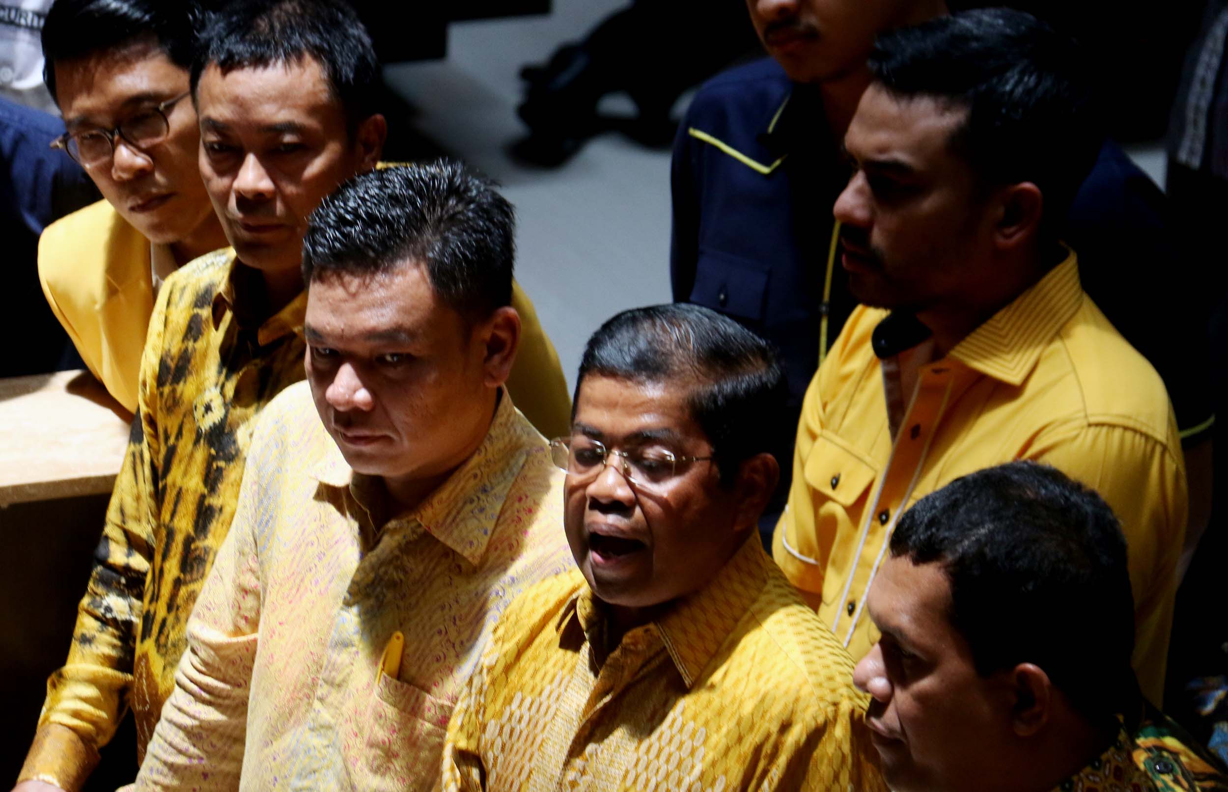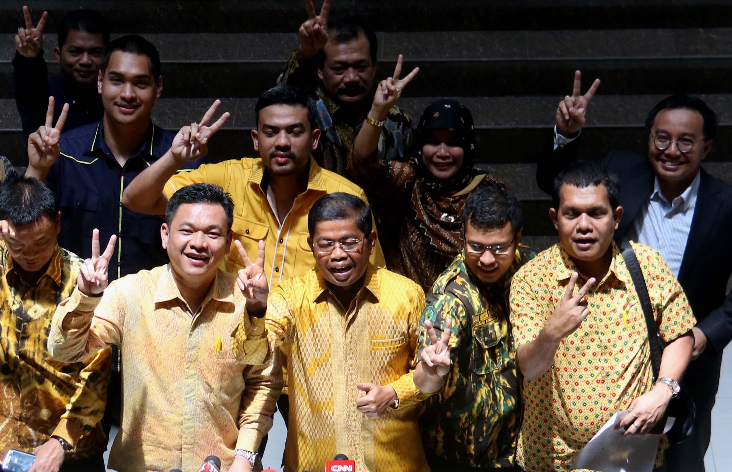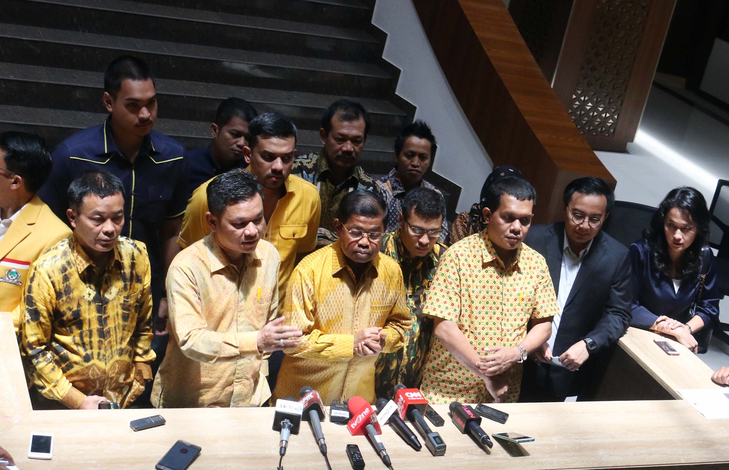Sekjen DPP Partai Golkar Idrus Marham (tengah) di dampingi para pengurus DPP Partai Golkar, saat menggelar jumpa pers terkait hasil Rapimnas II AMPG di Makasar belom lama ini, yang merekomendasikan mendukung Ketua Umum DPP Partai Gokar Setya Novanto sebagai Cawapres pada Pilpres 2019, di kantor DPP Partai Golkar, Jakarta, Senin (3/4/2017). Dalam jumpa persnya Sekjen DPP Partai Golkar Idrus Marham menjelaskan bahwa hasil Rapimnas II AMPG tidak pernah memutuskan rekomendasi dukungan kepada Ketua Umum DPP Partai Golkar Setya Novanto untuk dicalonkan sebagai cawapres pada Pilpres 2019 dan Rapimnas II AMPG sama sekali tidak pernah memberikan pernyataan semacam itu. AKTUAL/Munzir