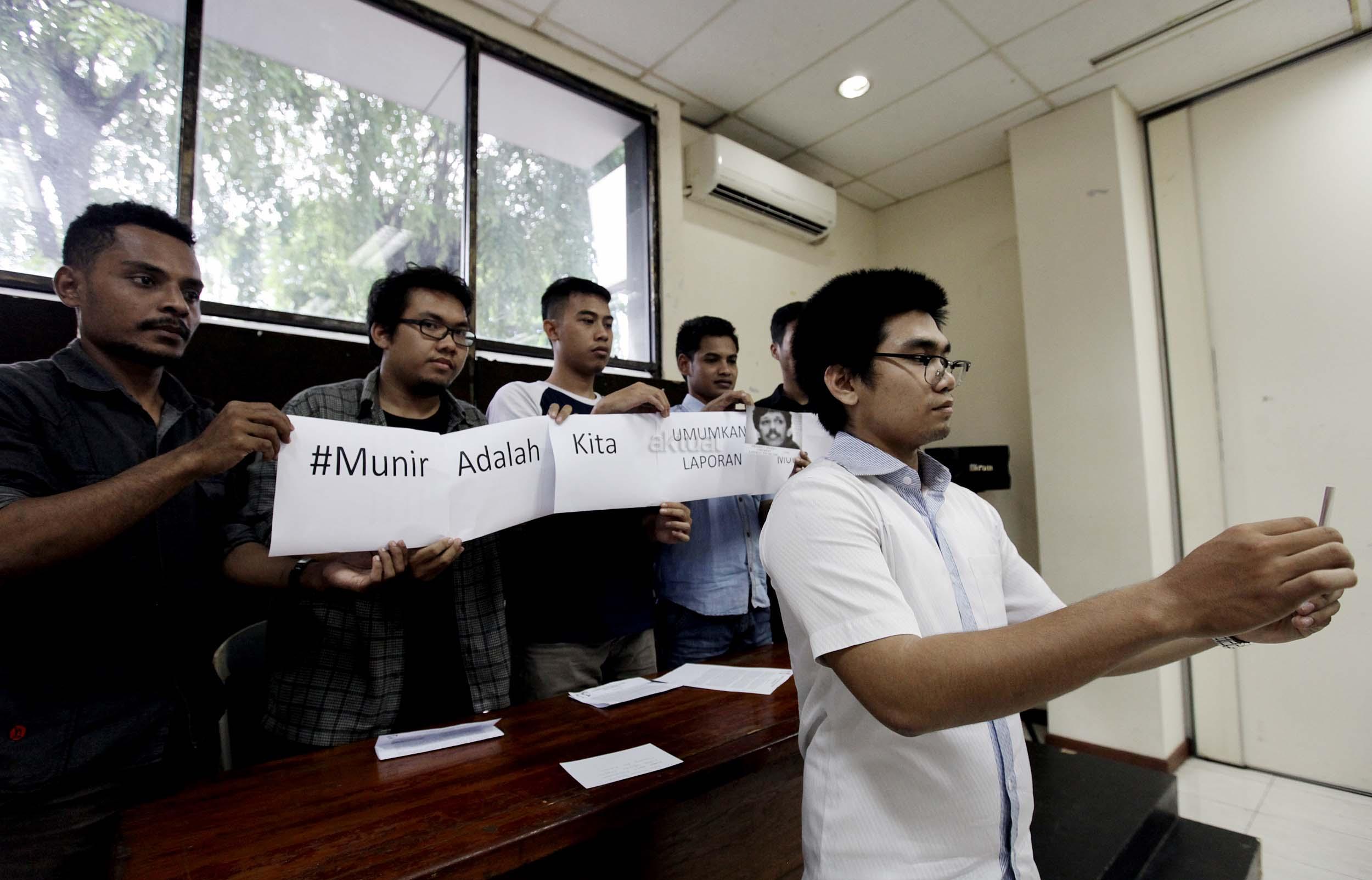Sejumlah mahasiswa yang tergabung dalam Aliansi Muda Untuk (Amuk) Munir menggelar jumpa persnya di gedung YLBHI Jakarta, Selasa (25/10/2016). Dalam jumpa persnya Amuk Munir mendesak Presiden Jokowi membuka TPF Munir kepada publik dan menyelesaikan kematian Munir hingga tuntas.