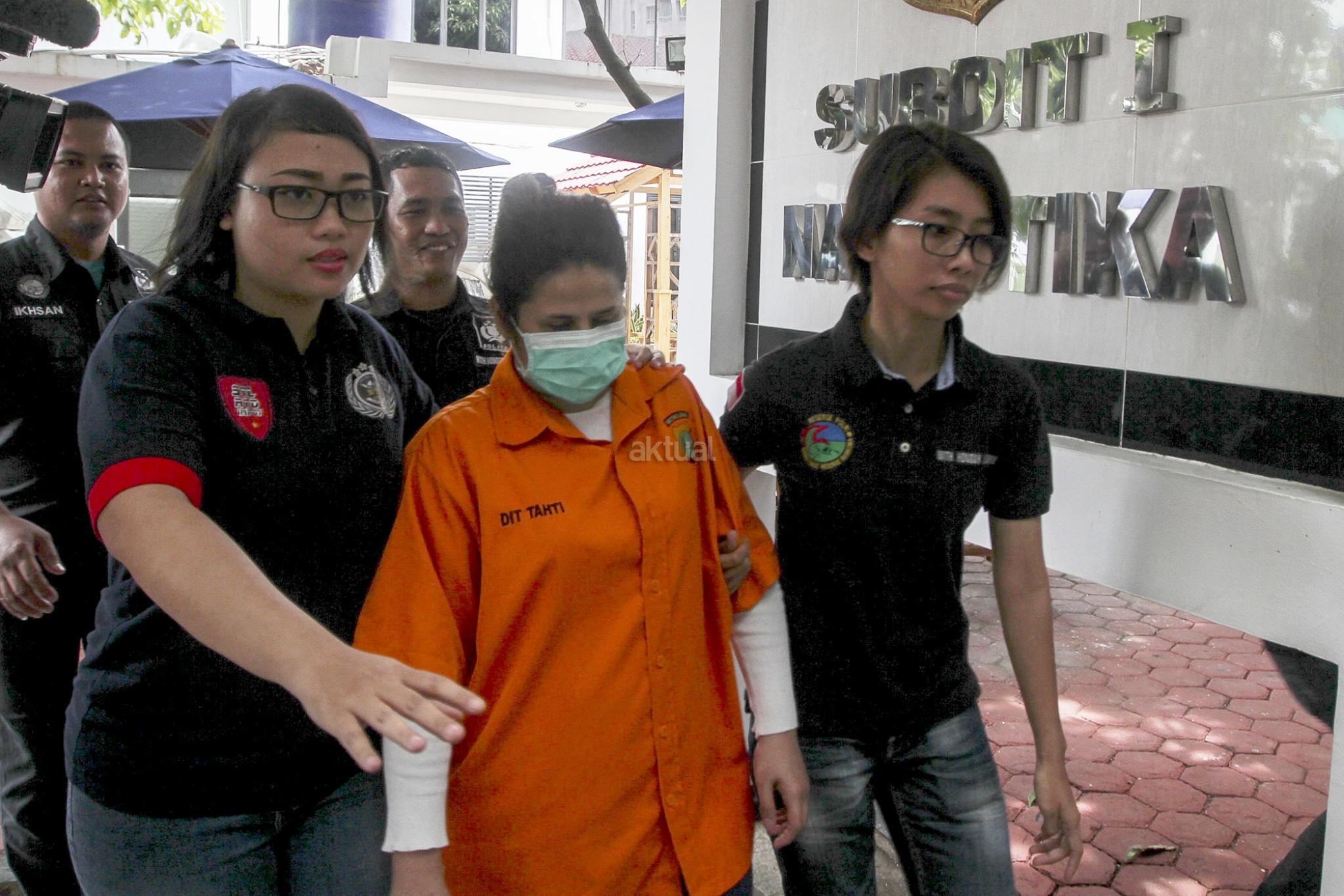 Dhawiya Zaida dikawal petugas saat dihadirkan dalam rilis di Polda Metro Jaya, Jakarta, Sabtu (17/2). Polisi juga menyita 2 alat hisab sabu, 9 cangklong kaca, 4 selang plastik, 4 telepon seluler, dan 1 timbangan digital. AKTUAL/Tino Oktaviano