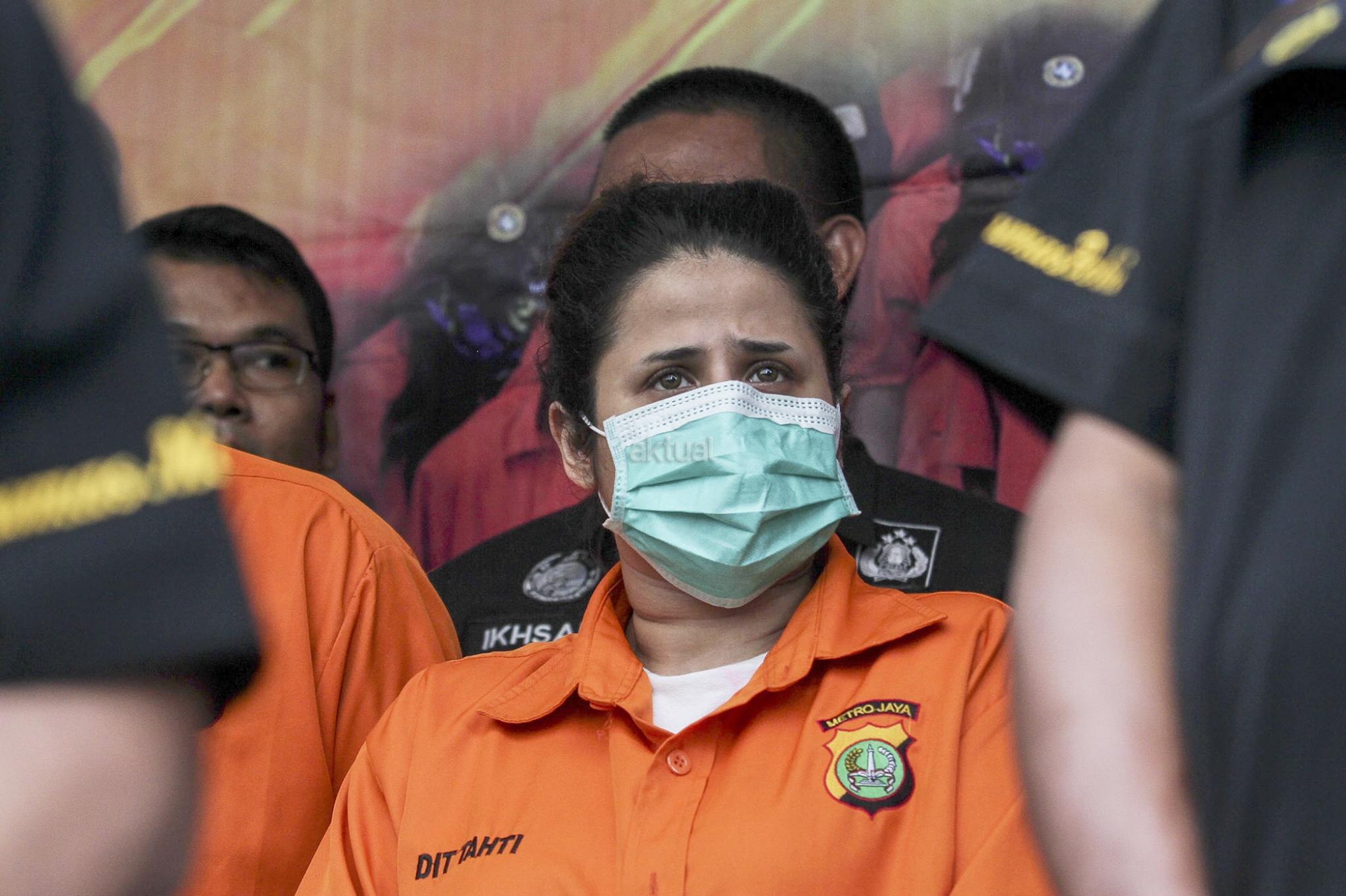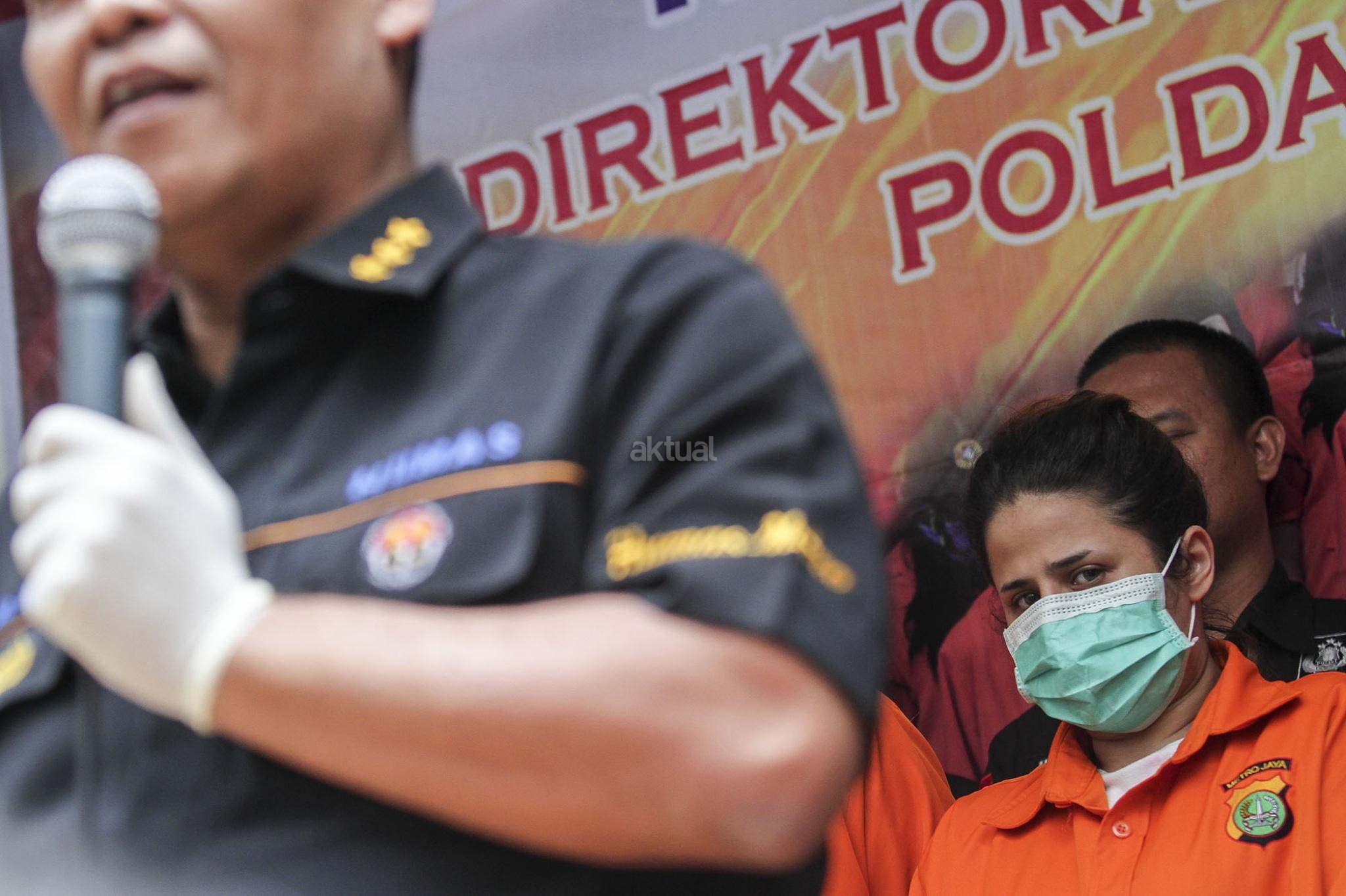 Ekspresi Dhawiya Zaida dihadirkan dalam rilis pengungkapan kasus narkoba di Polda Metro Jaya, Jakarta, Sabtu (17/2). Tiga anak Elvy sekaligus dijaring polisi, yakni Dhawiya dan dua orang kakaknya, Syehan dan Ali Zaenal Abidin. AKTUAL/Tino Oktaviano