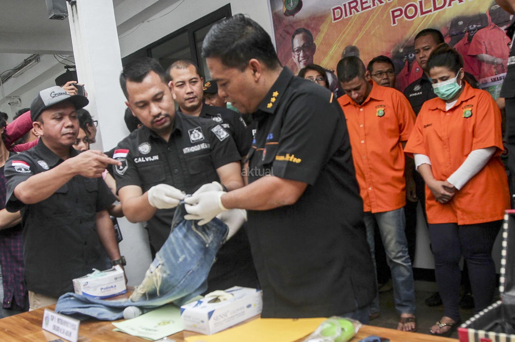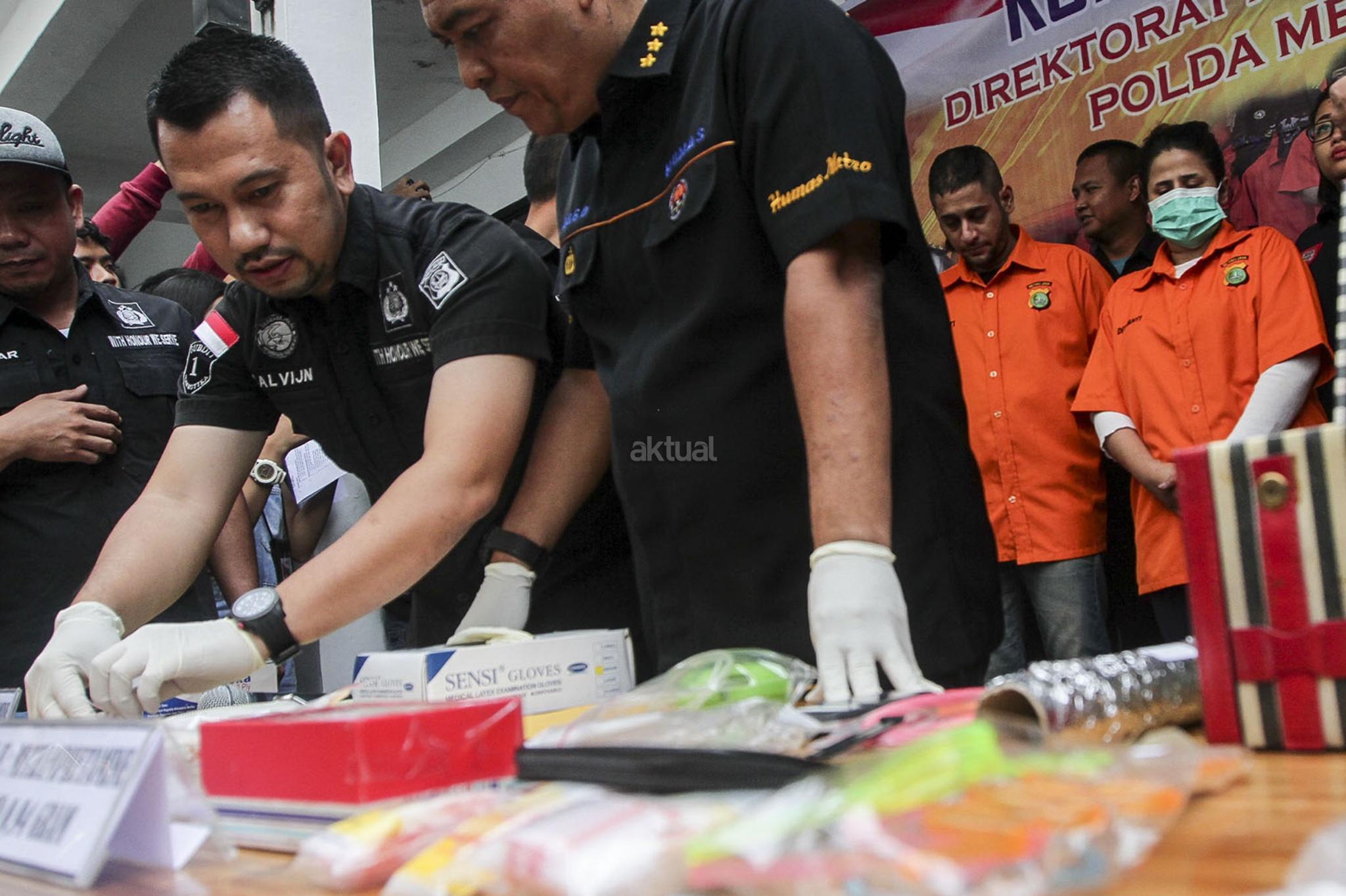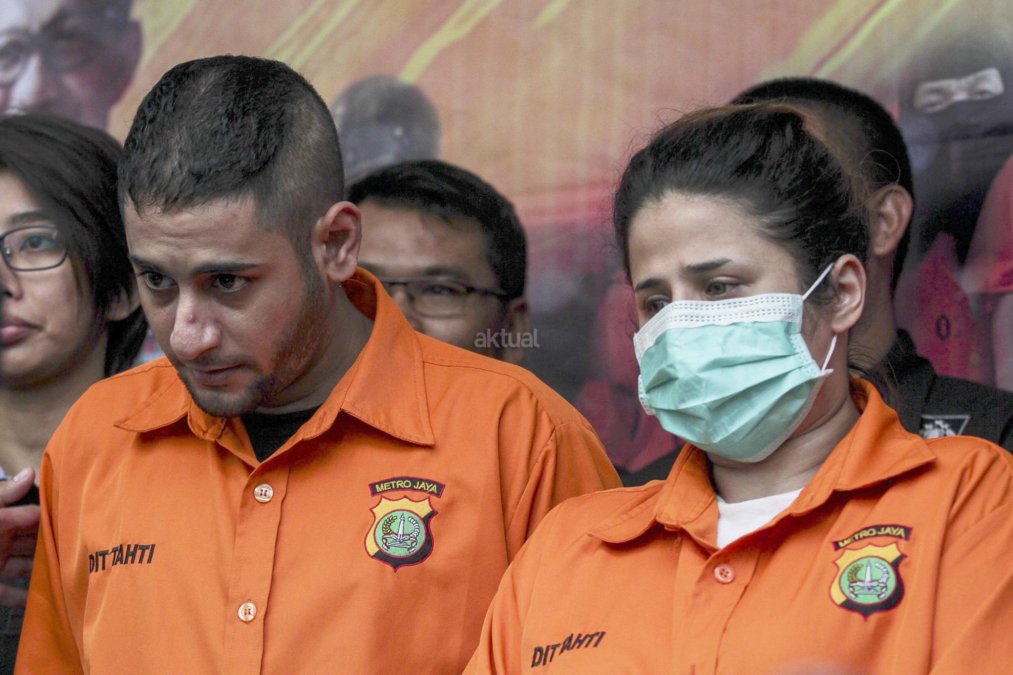 Dhawiya Zaida bersama tunangannya Muhammad dihadirkan polisi saat rilis pengungkapan kasus narkoba di Polda Metro Jaya, Jakarta, Sabtu (17/2). AKTUAL/Tino Oktaviano