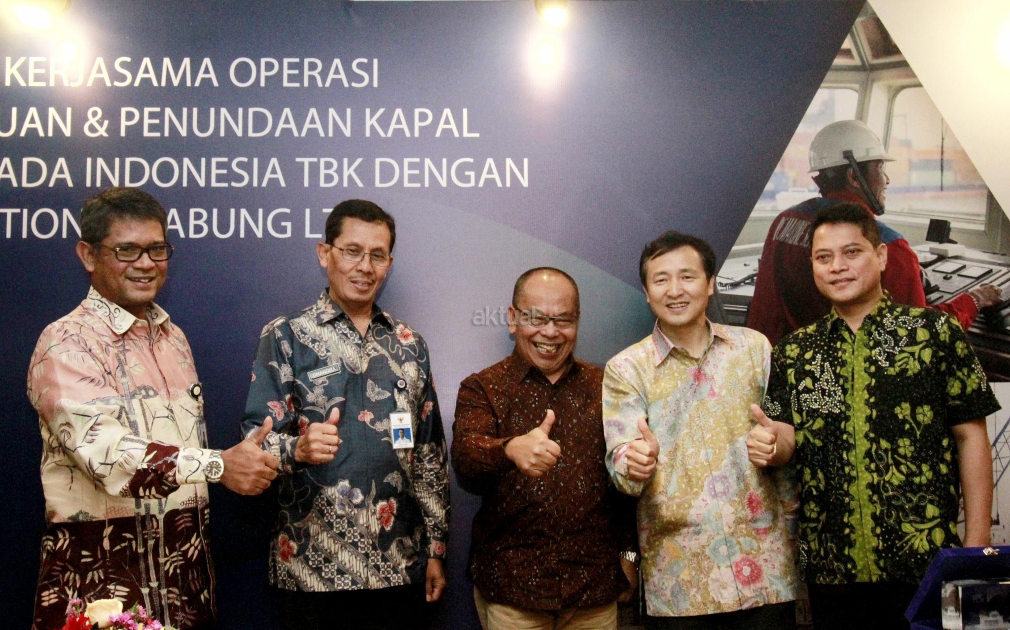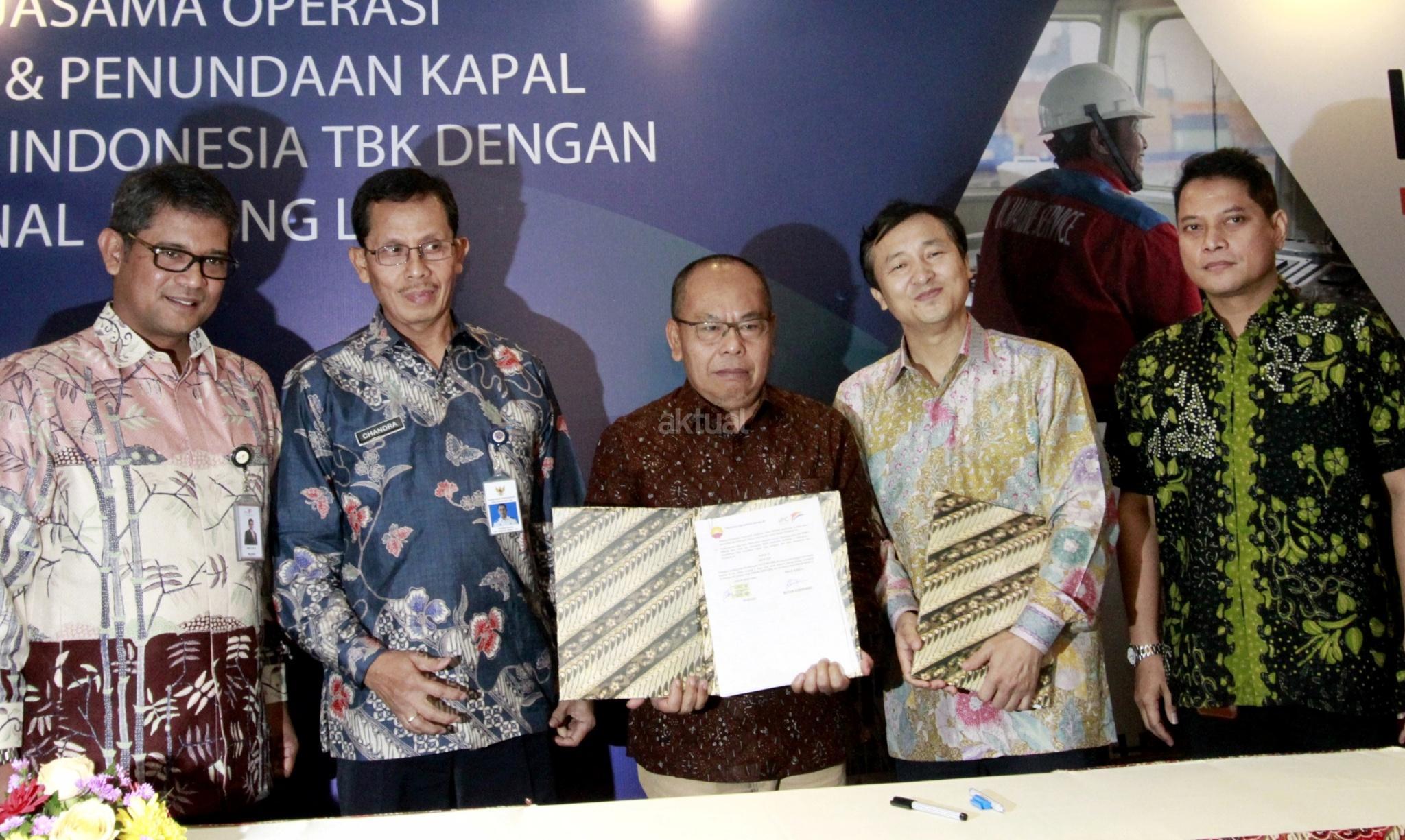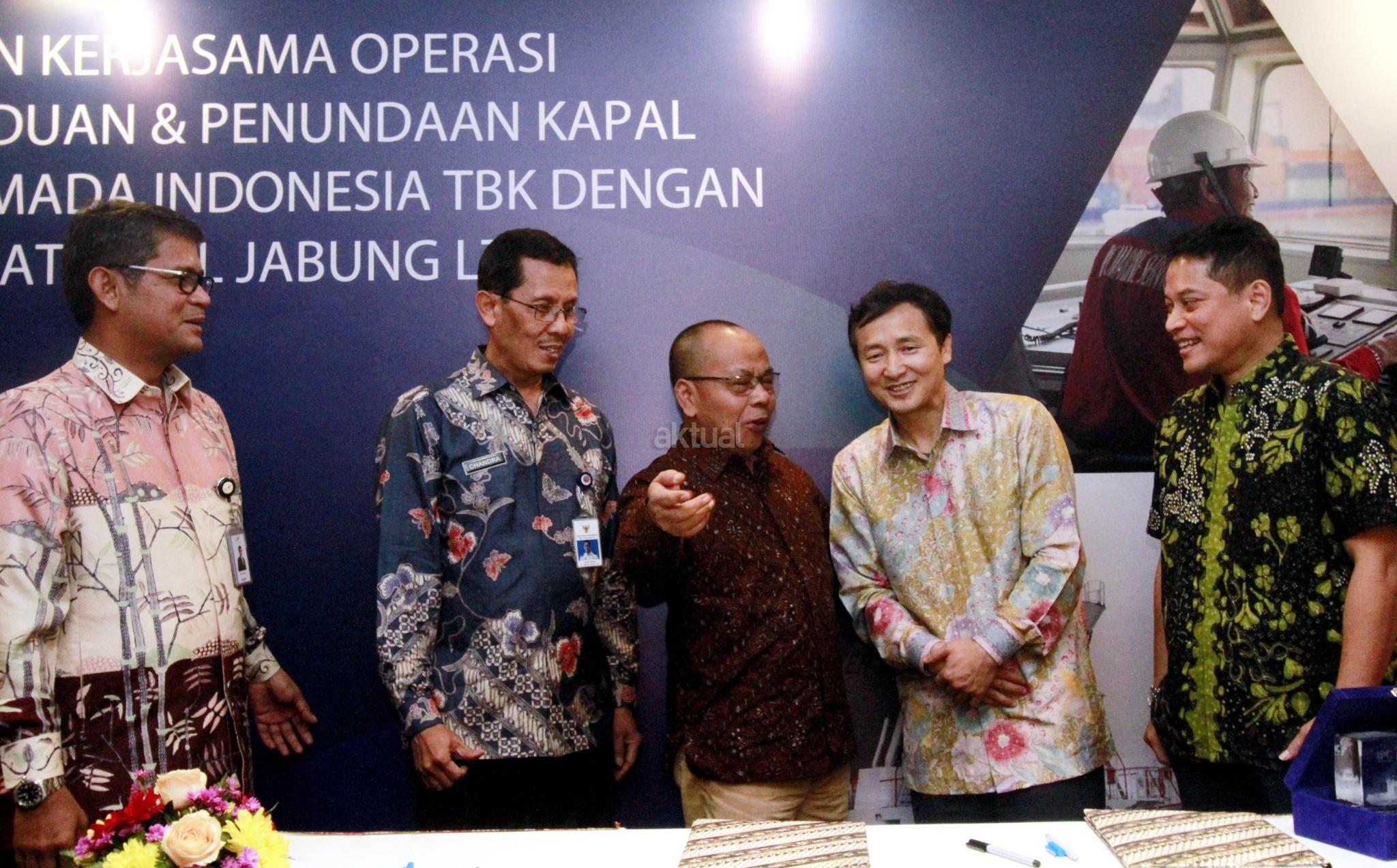 Direktur Utama PT Jasa Armada Indonesia Tbk Dawam Atmosudiro (tengah) bersama General Manager PetroChina International Jabung Ltd Yu Guoyi (kedua kanan), Direktur pengelolaan anak perusahaan PT Pelabuhan Indonesia II (Persero) Riry Syeried Jetta (kiri), Direktur Kepelabuhan Kemenhub Chandra Irawan (kedua kiri) dan Kadiv Penunjang Operasi dan Keselamatan Migas SKK Migas Bagus B Edvantoro menunjukan nota kesepahaman usai penandatanganan kerja sama antara Jasa Armada Indonesia dengan PetroChina International Jabung di Jakarta, Jumat (19/1). PT Jasa Armada Indonesia Tbk (JAI) melakukan kerja sama dengan PetroChina International Jabung Ltd dalam operasi pelayanan pemanduan dan penundaan kapal di wilayah perairan Pandu Luar Biasa TUKS PetroChina Marine Terminal, Tanjung Jabung, Jambi. AKTUAL/Eko S Hilman