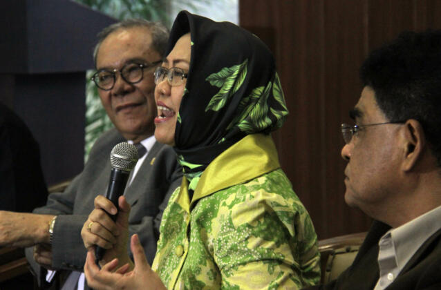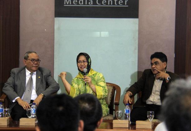 Pengamat Politik LIPI Siti Zuhro (tengah) berbicara dialektika demokrasi dengan tema 'Ancaman Baru Deparpolisasi' di Gedung Parlemen Senayan, Jakarta, Kamis (10/3). Diskusi tersebut membahas terkait keputusan dari Basuki Tjahaja Purnama (Ahok) untuk memilih maju di Pilgub 2017 mendatang secara Independen karena 'restu' PDIP tak kunjung didapat. Deparpolisasi adalah gejala psikologis masyarakat yang menghilangkan kepercayaan terhadap partai politik, dan enggan untuk mengidentifikasikan diri pada partai politik tertentu. AKTUAL/JUNAIDI MAHBUB