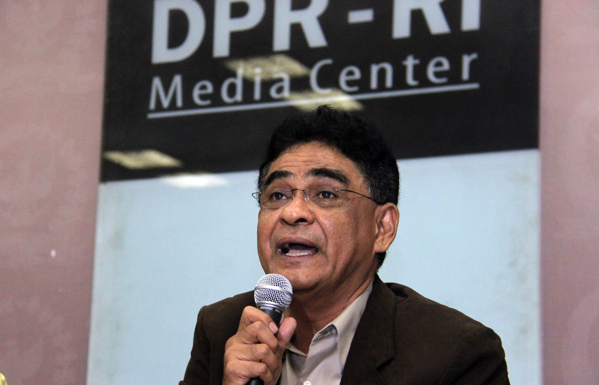 Ketua DPP PDI Perjuangan Andreas Pereira berbicara dialektika demokrasi dengan tema 'Ancaman Baru Deparpolisasi' di Gedung Parlemen Senayan, Jakarta, Kamis (10/3). Diskusi tersebut membahas terkait keputusan dari Basuki Tjahaja Purnama (Ahok) untuk memilih maju di Pilgub 2017 mendatang secara Independen karena 'restu' PDIP tak kunjung didapat. Deparpolisasi adalah gejala psikologis masyarakat yang menghilangkan kepercayaan terhadap partai politik, dan enggan untuk mengidentifikasikan diri pada partai politik tertentu. AKTUAL/JUNAIDI MAHBUB