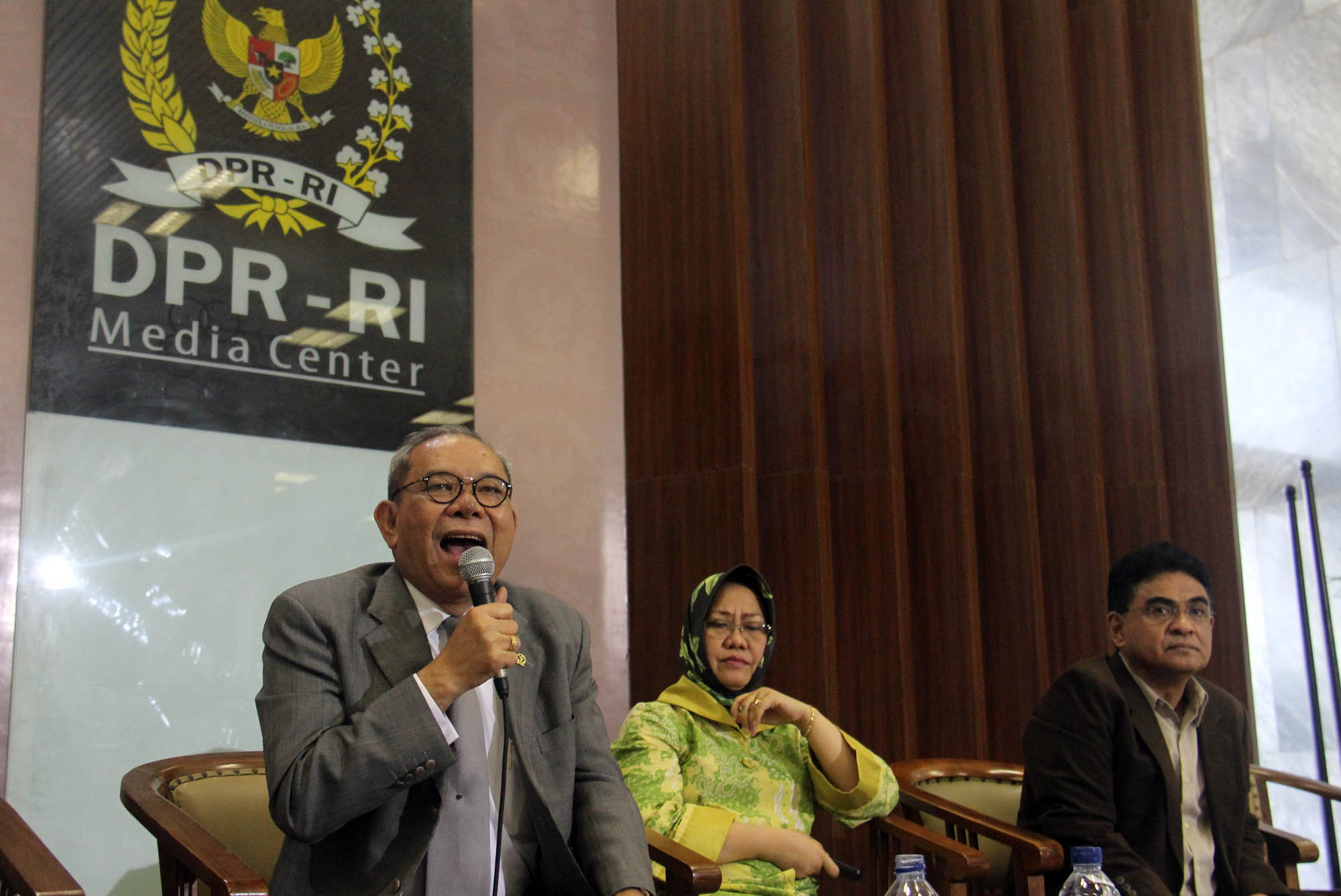 Ketua Komisi II DPR Rambe Kamarul Zaman (kiri) bersama Pengamat Politik LIPI Siti Zuhro (tengah) dan Ketua DPP PDI Perjuangan Andreas Pereira (kanan) menjadi pembicara dialektika demokrasi dengan tema 'Ancaman Baru Deparpolisasi' di Gedung Parlemen Senayan, Jakarta, Kamis (10/3). Diskusi tersebut membahas terkait keputusan dari Basuki Tjahaja Purnama (Ahok) untuk memilih maju di Pilgub 2017 mendatang secara Independen karena 'restu' PDIP tak kunjung didapat. Deparpolisasi adalah gejala psikologis masyarakat yang menghilangkan kepercayaan terhadap partai politik, dan enggan untuk mengidentifikasikan diri pada partai politik tertentu. AKTUAL/JUNAIDI MAHBUB