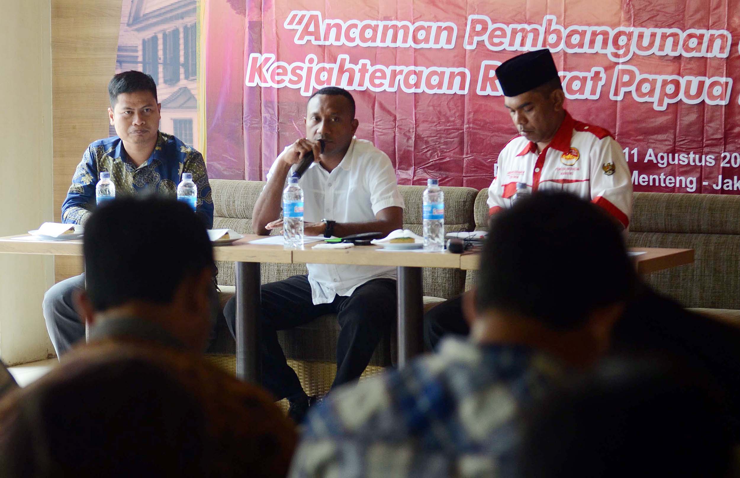 Ketua Pansus Pajak Freeport sekaligus Ketua Fraksi Hanura Papua dan Ketua DPD Hanura Papua, Yan P Mandenas (tengah), Ketua Umum Kebangkitan Pradaban Pancasila, Djafar Ngabalin (kanan) dan Moderator Rasminto (kiri) saat menjadi pembicara diskusi publik Gerakan Mahasiswa Indonesia di Jakarta, kamis (11/8/2016). diskusi tersebut dengan tema “Ancaman Percepatan Peningkatan Kesejahtrean Rakyat Papua Sebagai bagian dari NKRI”.