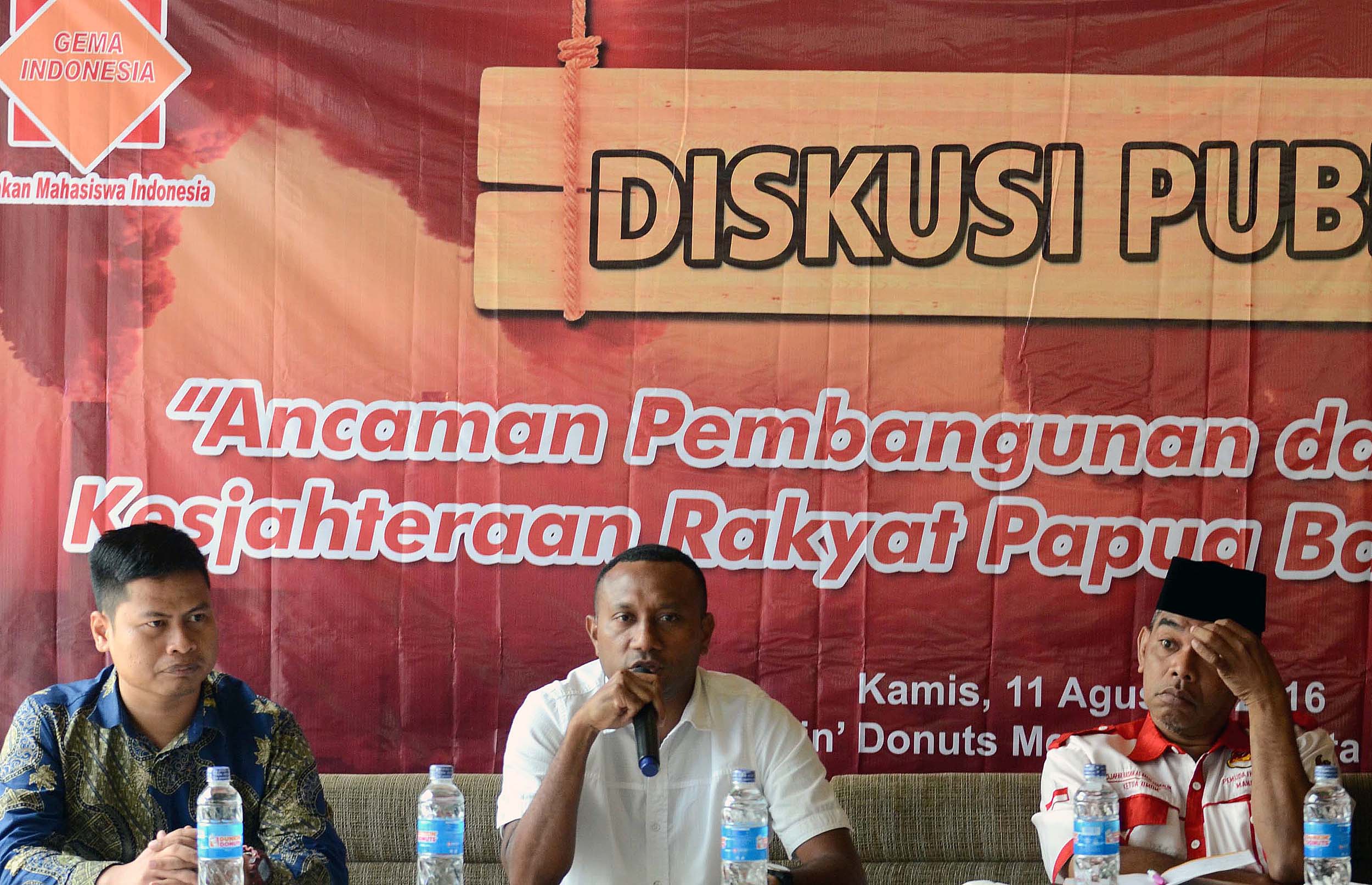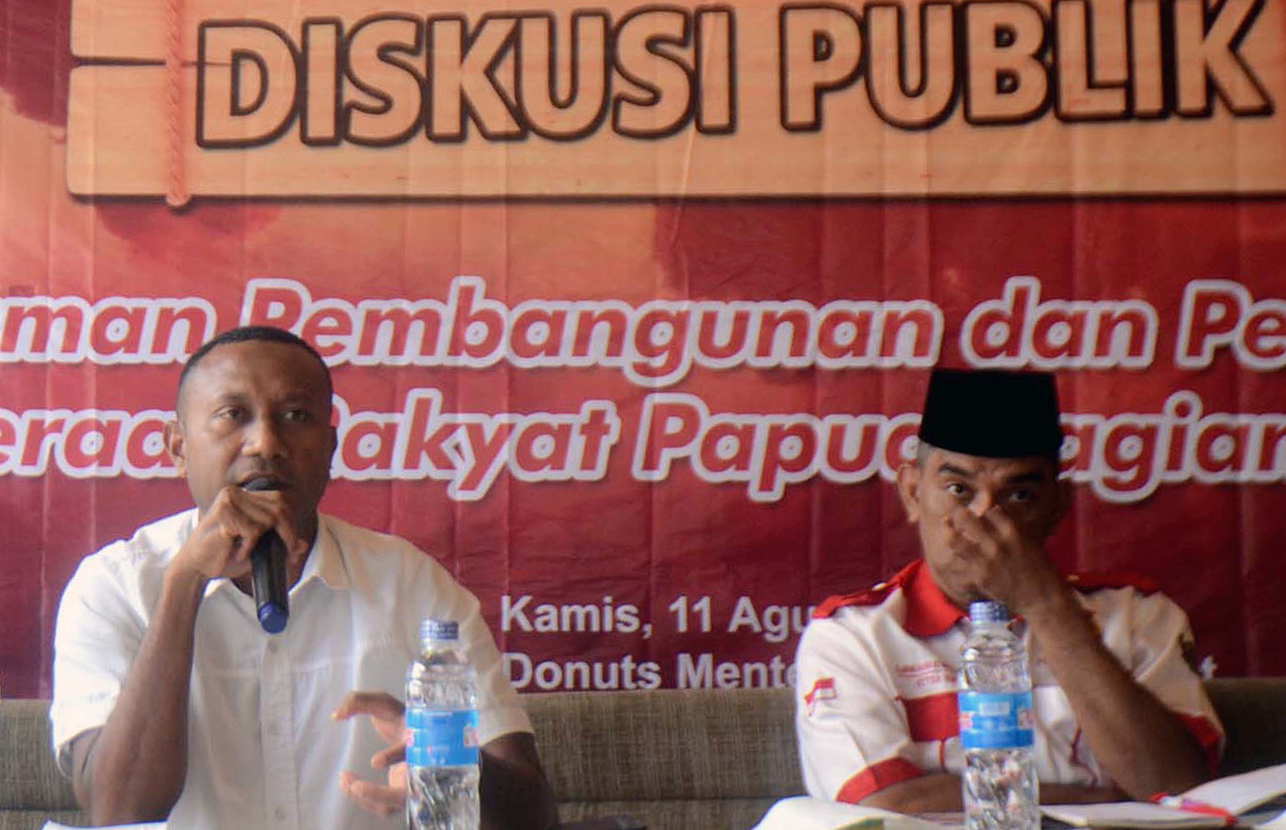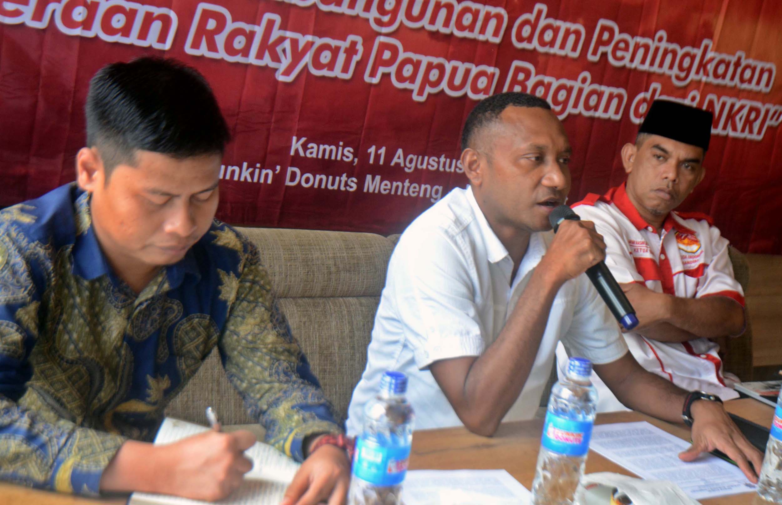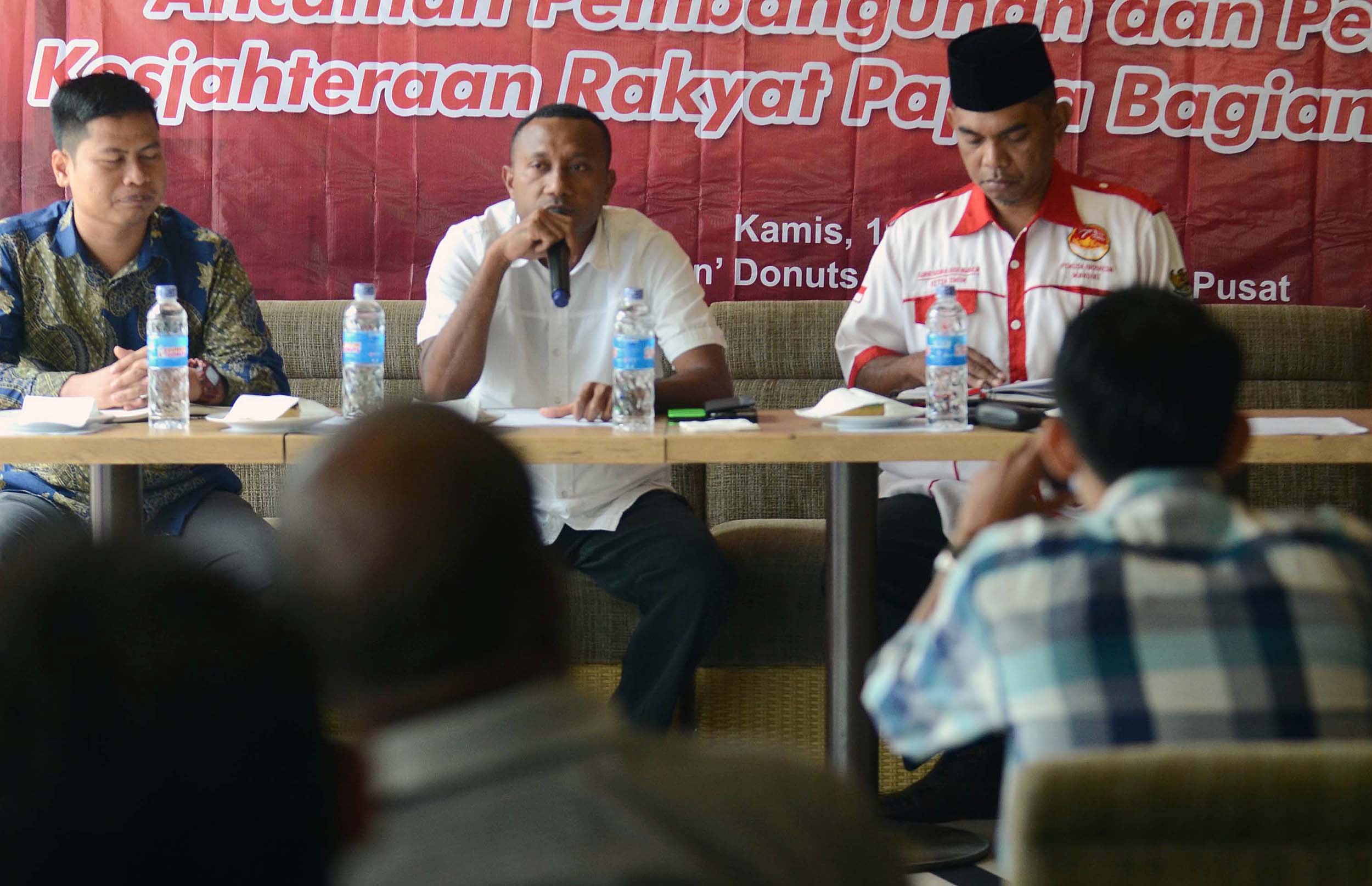 Ketua Pansus Pajak Freeport sekaligus Ketua Fraksi Hanura Papua dan Ketua DPD Hanura Papua, Yan P Mandenas (tengah), Ketua Umum Kebangkitan Pradaban Pancasila, Djafar Ngabalin (kanan) dan Moderator Rasminto (kiri) saat menjadi pembicara diskusi publik Gerakan Mahasiswa Indonesia di Jakarta, kamis (11/8/2016). diskusi tersebut dengan tema "Ancaman Percepatan Peningkatan Kesejahtrean Rakyat Papua Sebagai bagian dari NKRI".