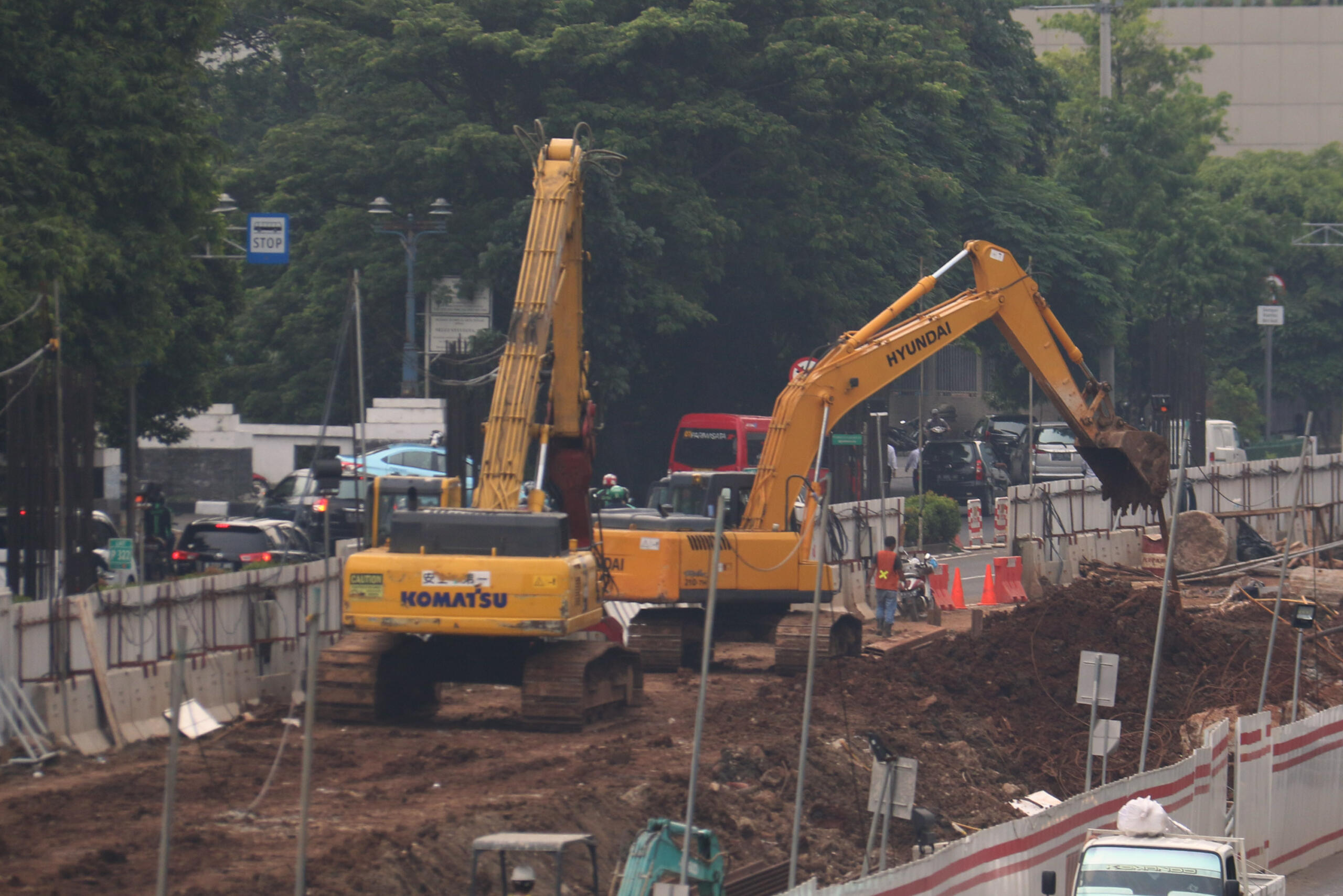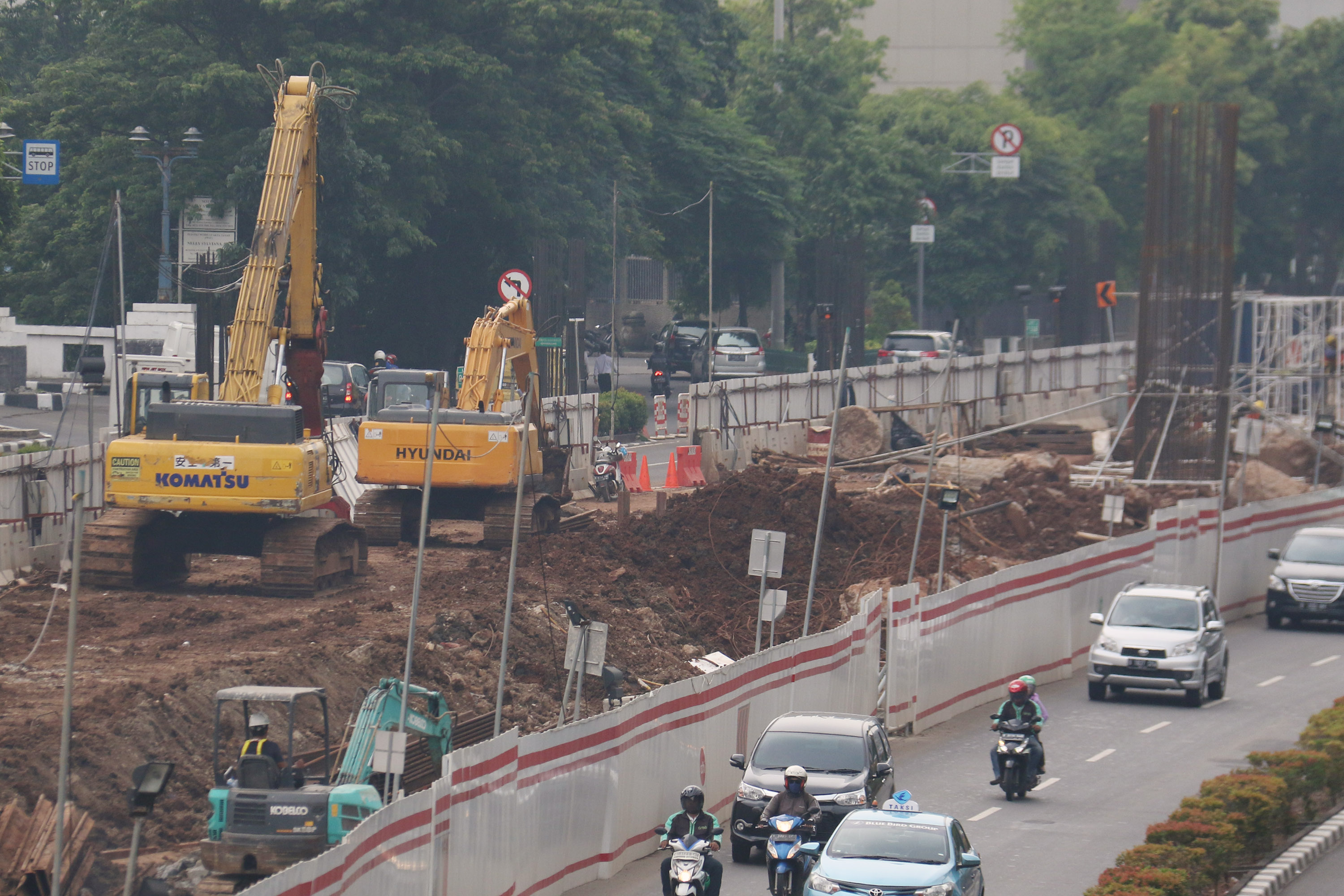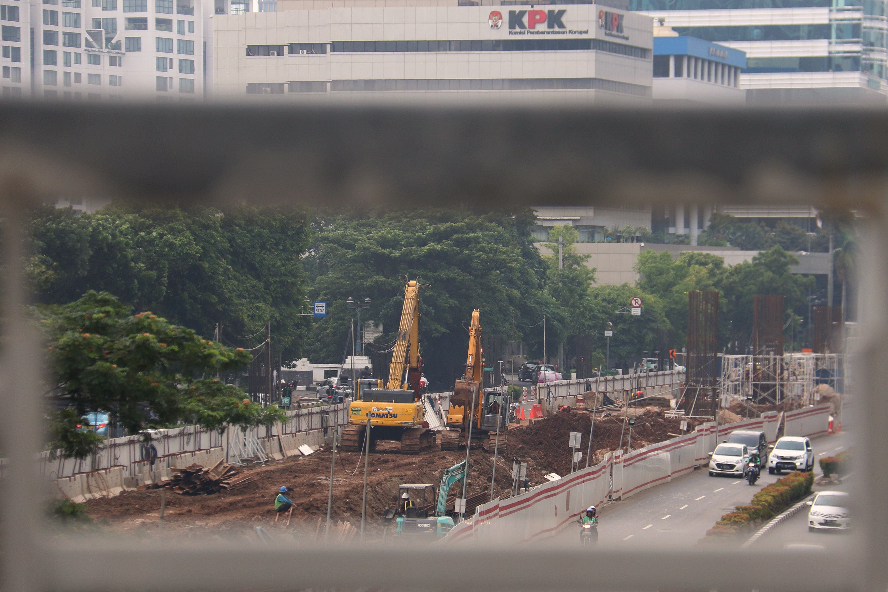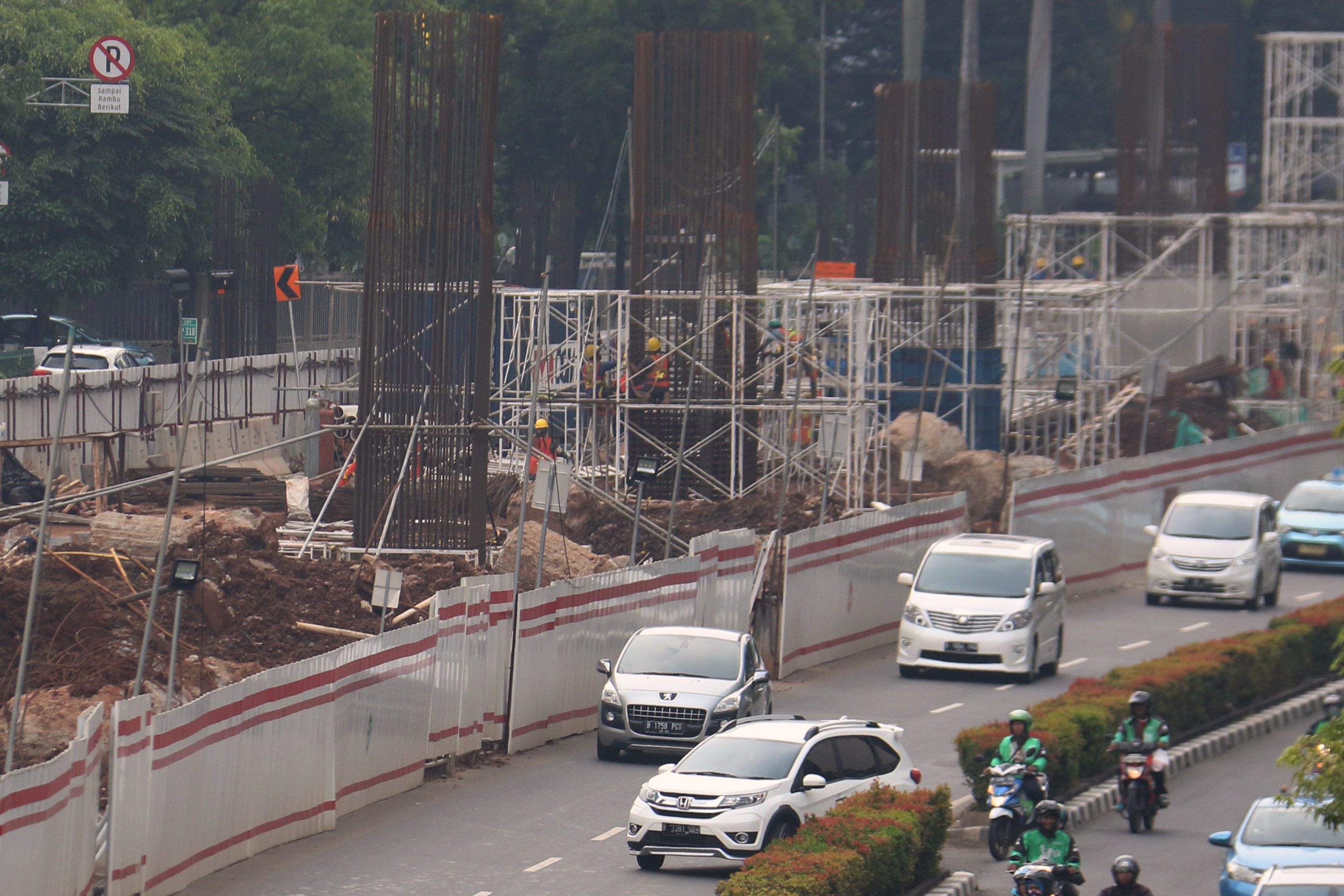 Sejumlah pekerja menyelesaikan pembangunan Light Rail Transit (LRT) Jabodebek di Jalan. HR Rasuna Said, Kuningan, Jakarta, Selasa (21/11/2017). Menteri Koordinator bidang Kemaritiman, Luhut Binsar Pandjaitan Anggaran mengatakan anggaran pembangunan Light Rail Transit (LRT) Jabodebek mengalami perubahan total investasi menjadi Rp 31 triliun, dari sebelumnya senilai Rp 26,7 triliun dan kenaikan sebesar Rp 5 triliun tersebut diakibatkan dua hal, pertama, adanya penambahan dua titik pemberhentian LRT. AKTUAL/Munzir