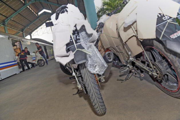 Pekerja memasukkan paket motor ke dalam gerbong kereta api di Stasiun Surabaya Gubeng, Surabaya, Jawa Timur, Sabtu (25/6). PT KAI akan menyediakan angkutan motor gratis pada masa Angkutan Lebaran 2016 guna mengurangi kepadatan dan tingkat kecelakaan di jalan raya yang disebabkan banyaknya pemudik bermotor pada mudik maupun balik Lebaran. ANTARA FOTO/Zabur Karuru/ama/16