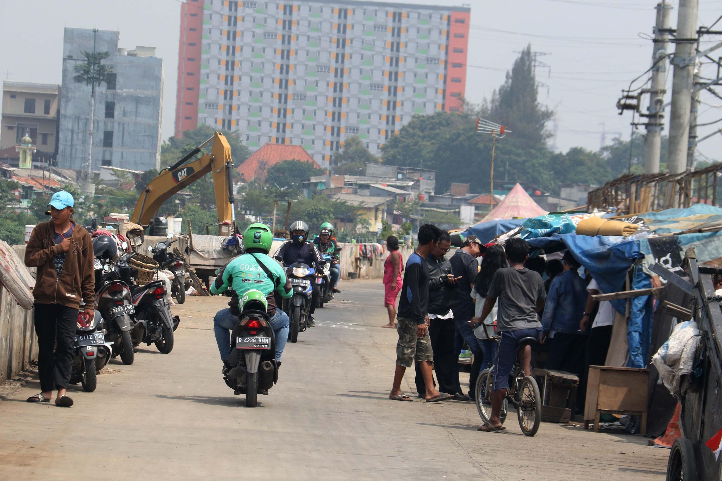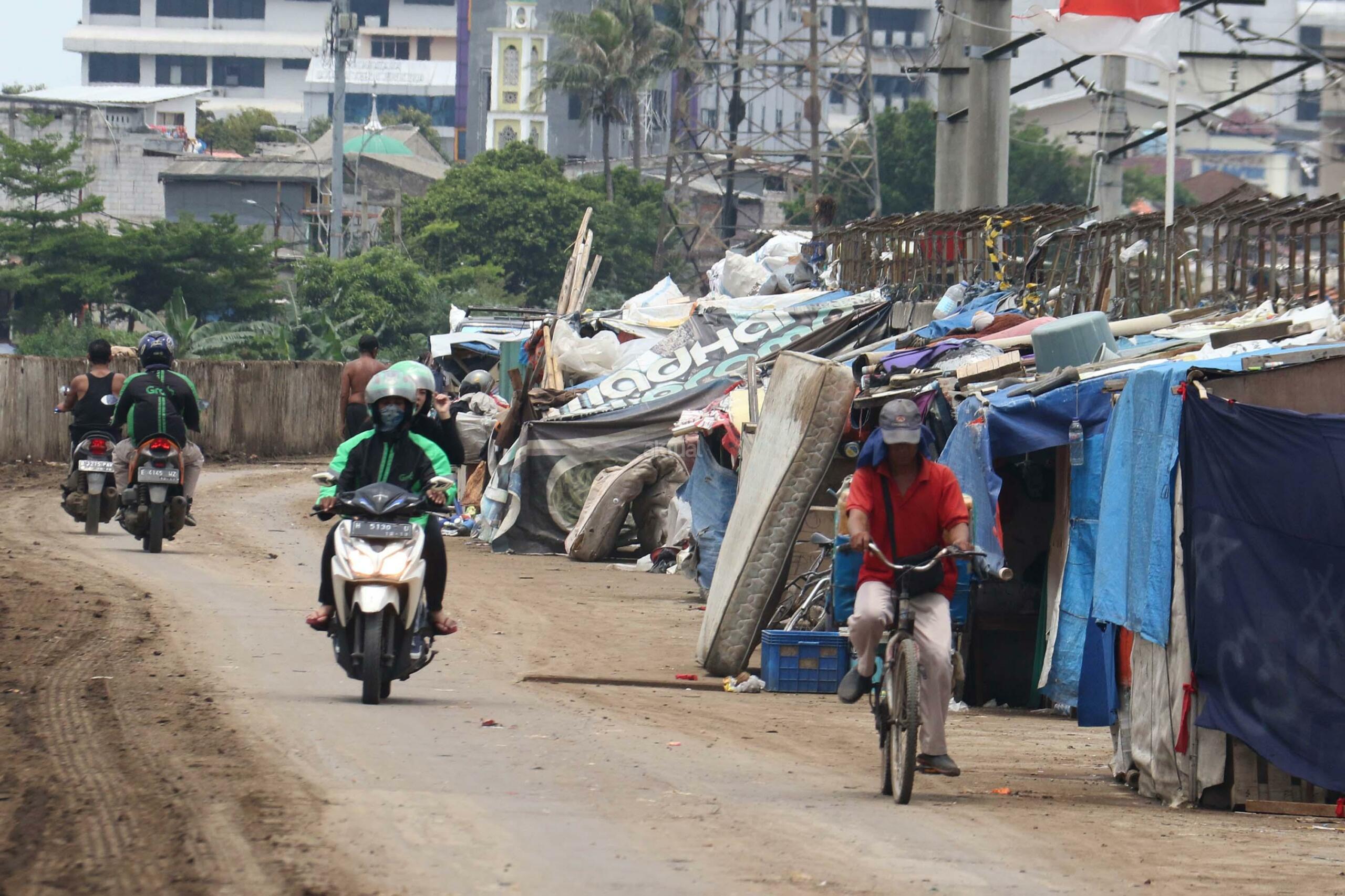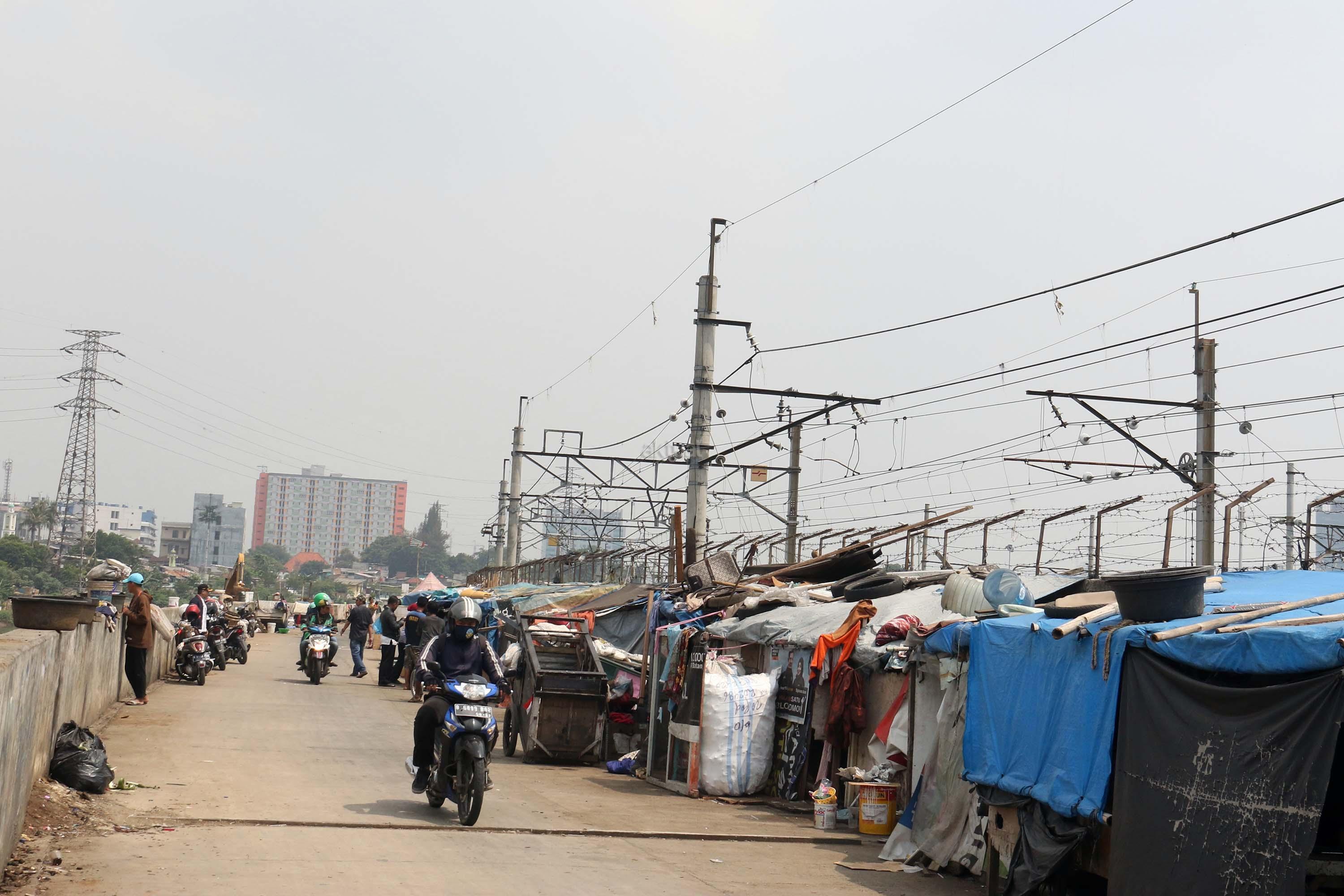 Pengendara sepeda motor melintasi gubuk liar yang berdiri di atas jalan inspeksi Kanal Banjir Barat (BKB) di kawasan Tanah Abang, Jakarta, Senin (6/11/2017). Gubernur DKI Jakarta Anies Baswedan mengatakan pemukiman liar yang membuat kesan kumuh itu juga mengganggu ketertiban umum, dikarenakan keberadaan gubuk liar tersebut membuat kawasan jalan inspeksi Kanal Banjir Barat (BKB) terlihat kumuh dan menggangangu kendaraan yang melewati kawasan tersebut. AKTUAL/Munzir