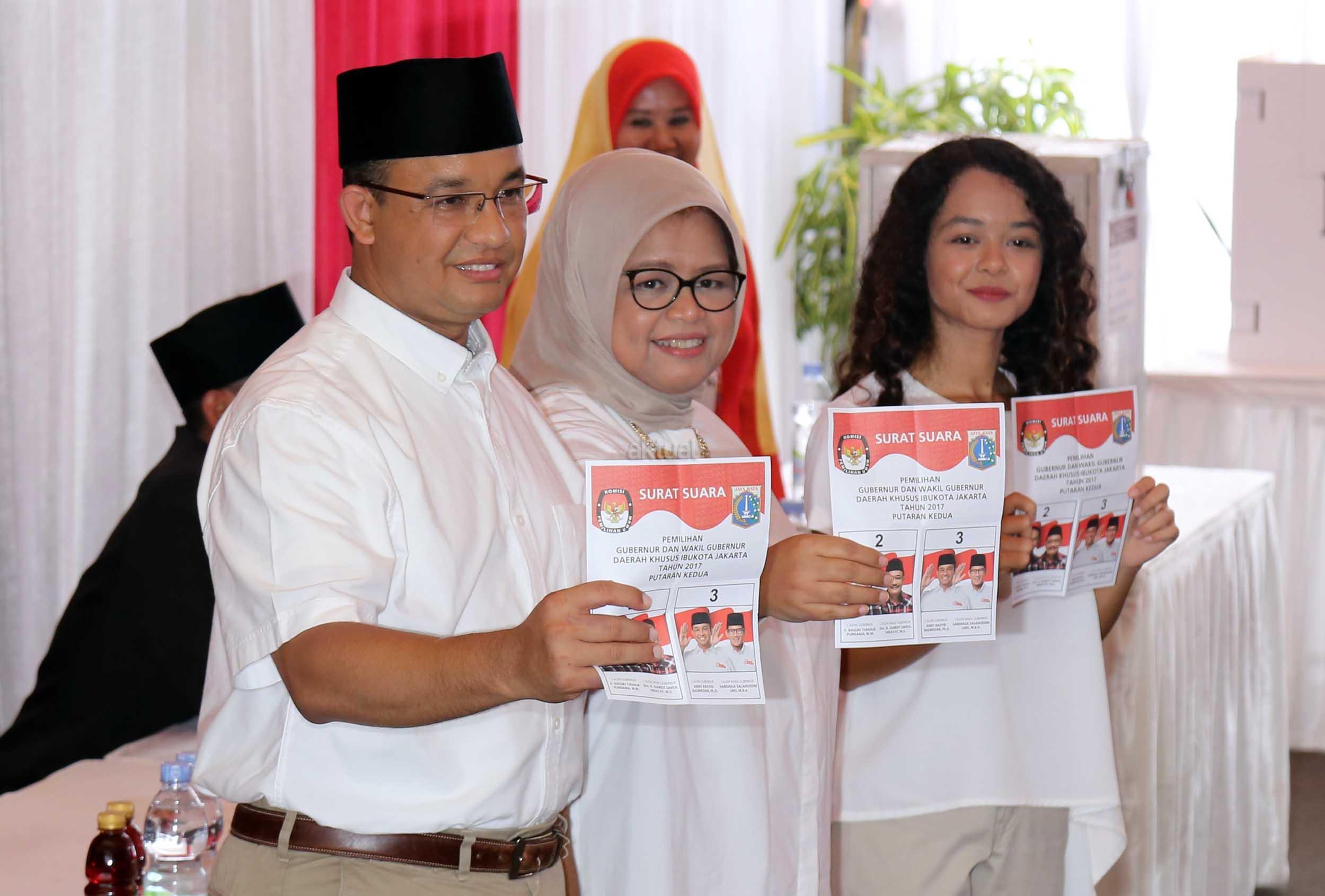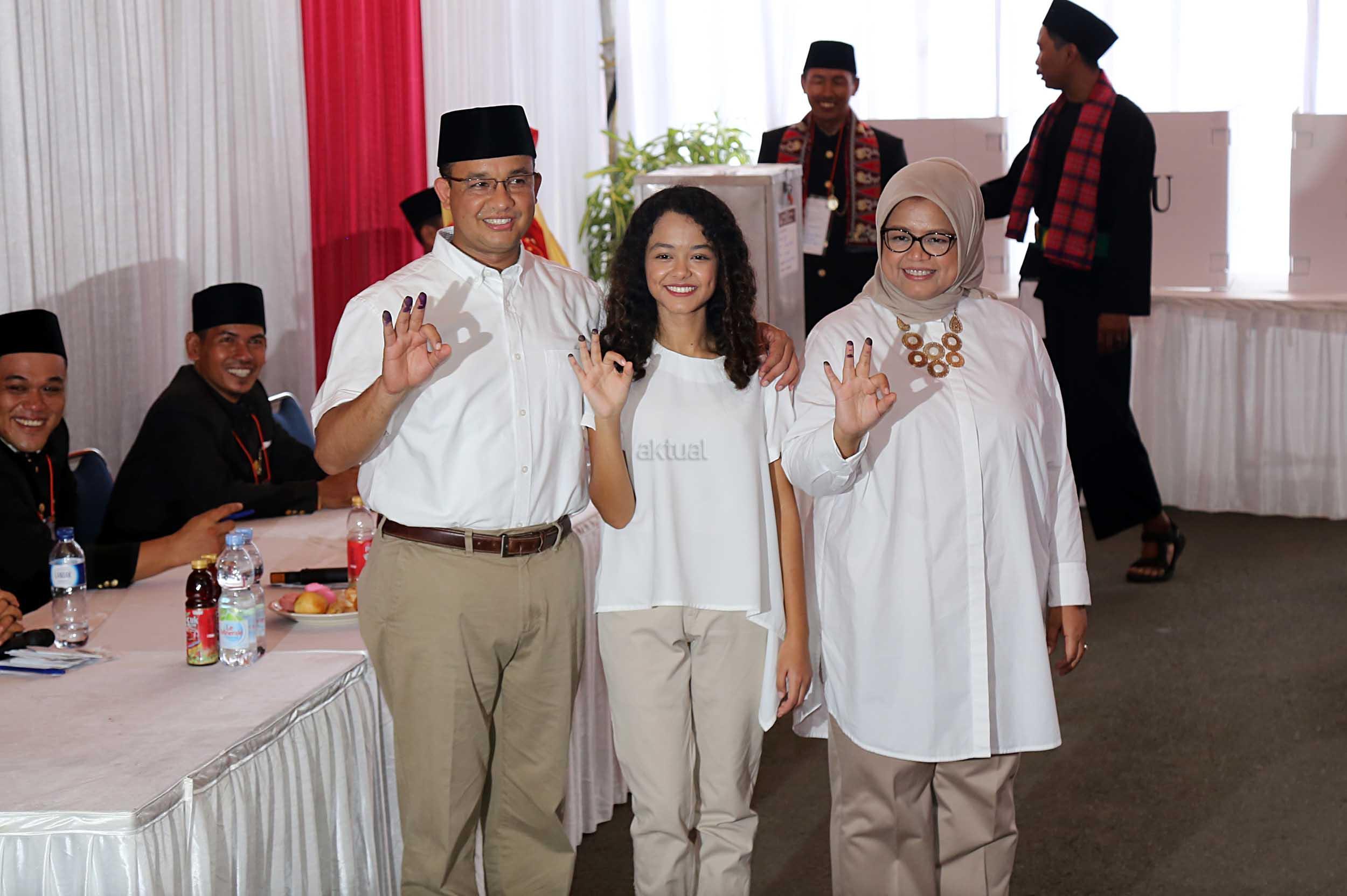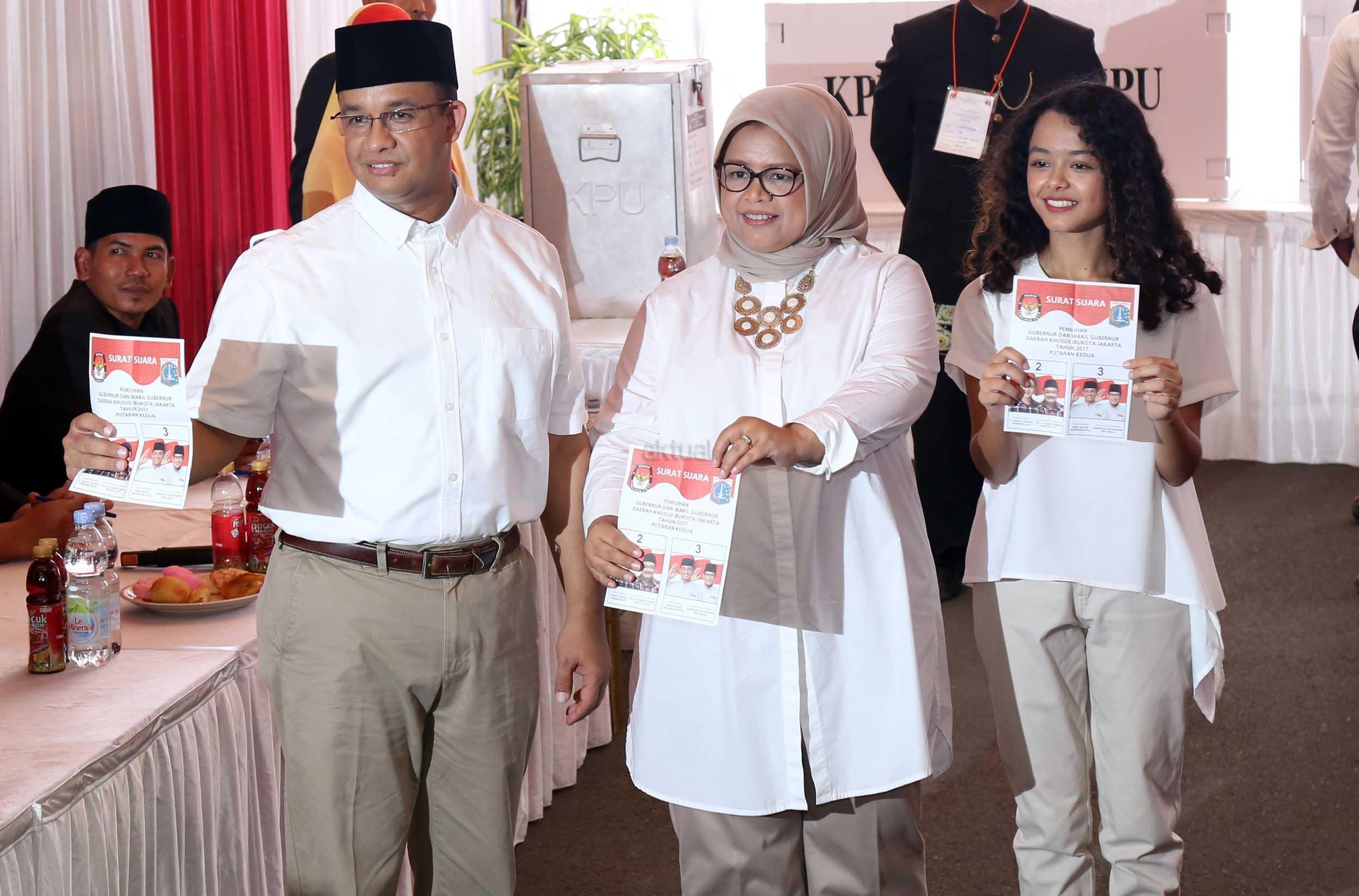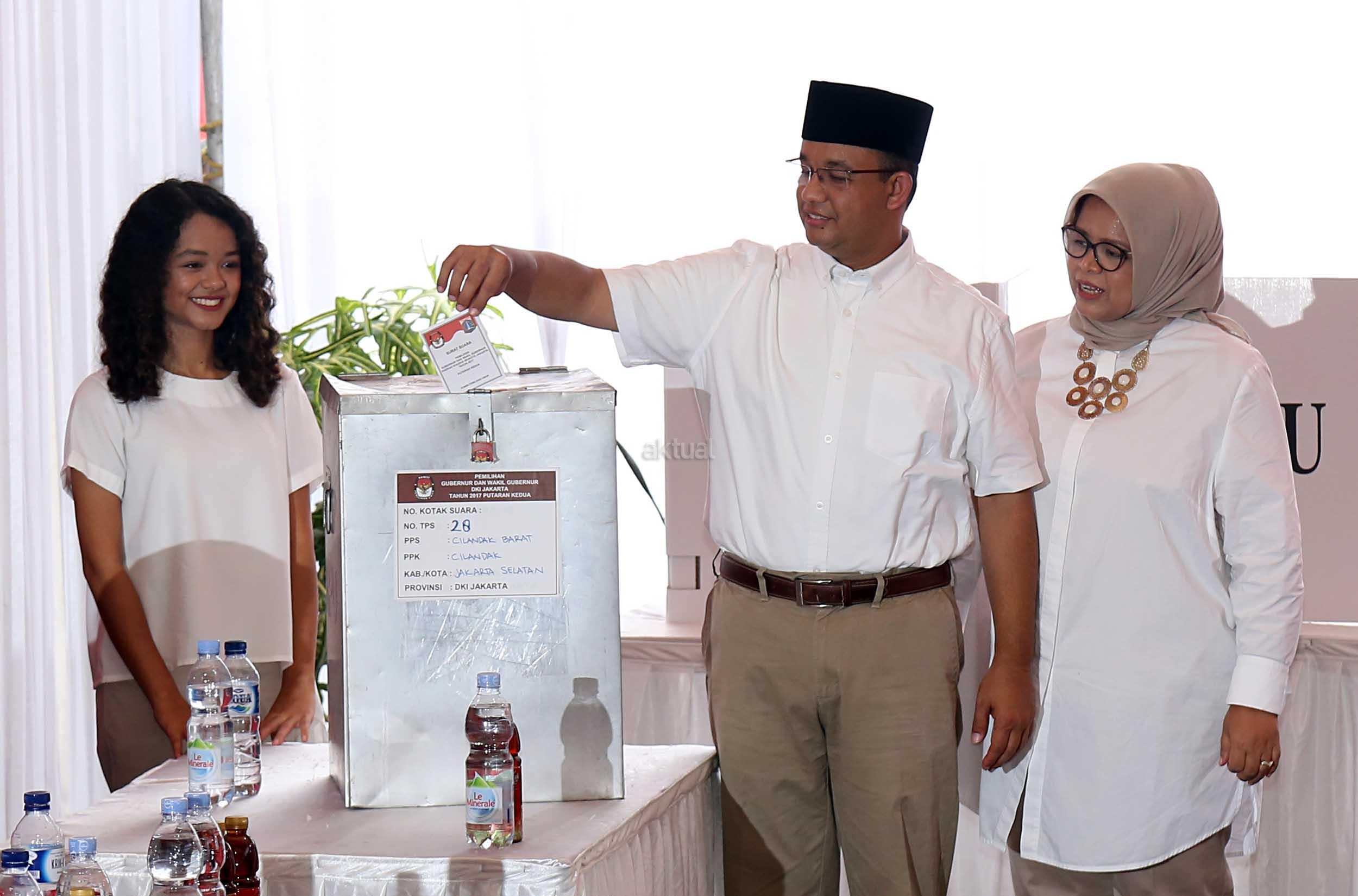 Calon Gubernur DKI Jakarta nomor urut tiga Anies Baswedan didampingi istri Fery Farhati Ganis dan anak Mutiara Annisa Baswedan saat memberikan hak pilih pada Pemilihan Gubernur di TPS 28 Cilandak Barat, Jakarta, Rabu (19/4). Pilkada putaran kedua yang diikuti dua pasang cagub dan cawagub DKI Jakarta periode 2017–2022 digelar serentak di seluruh wilayah Jakarta. AKTUAL/Tino Oktaviano