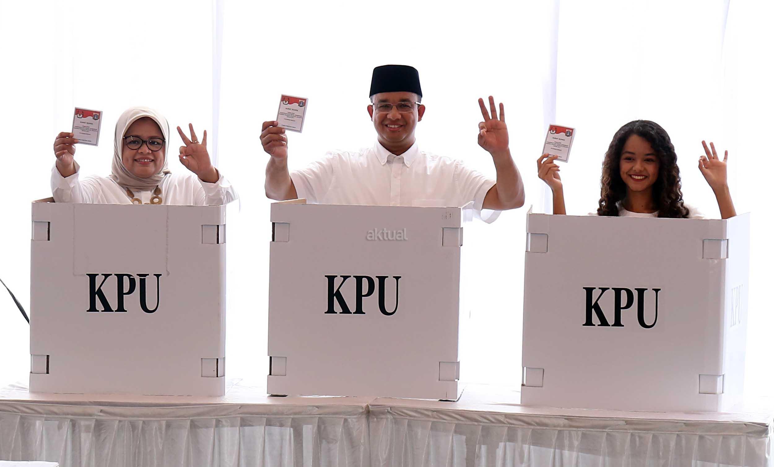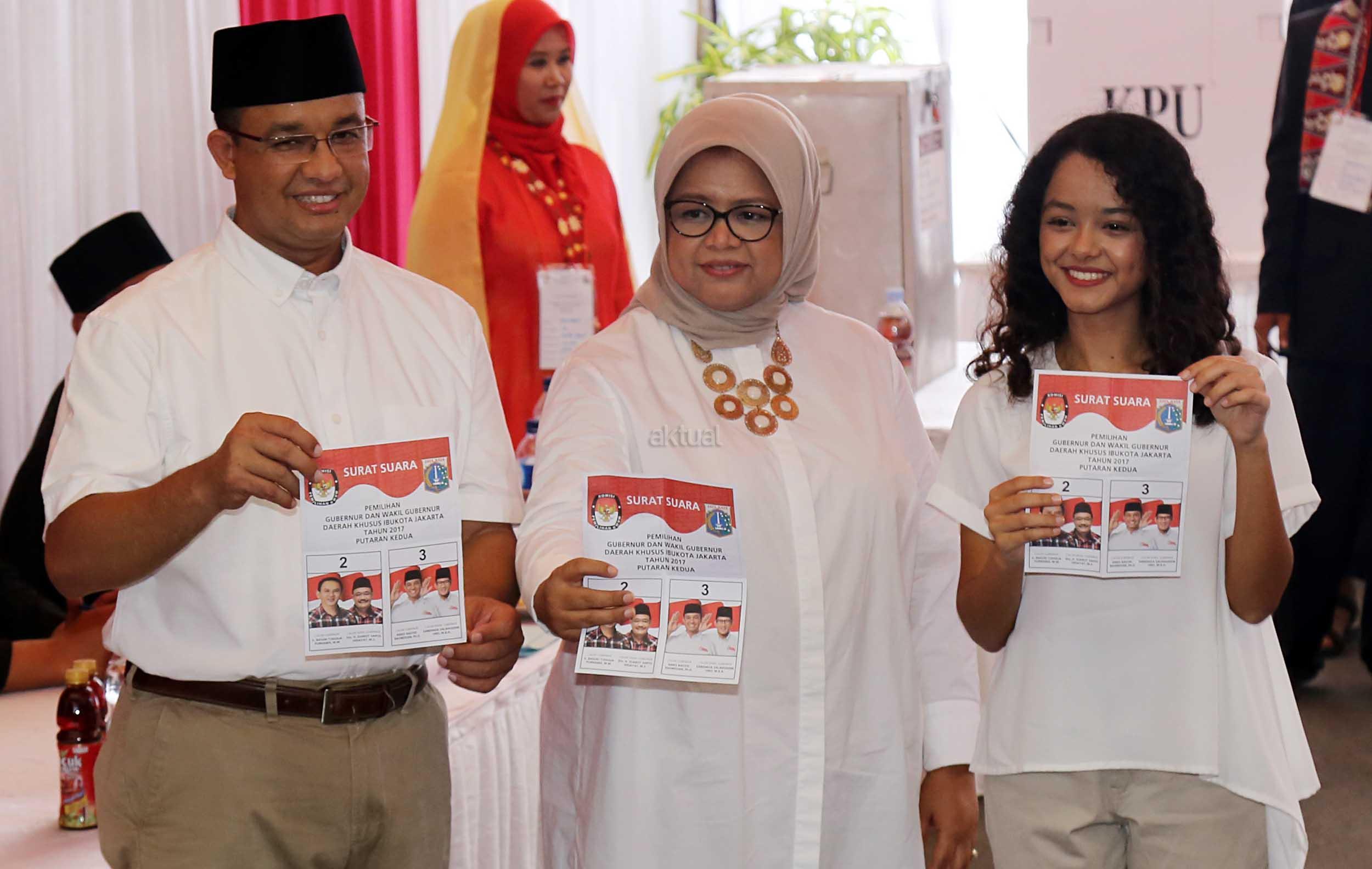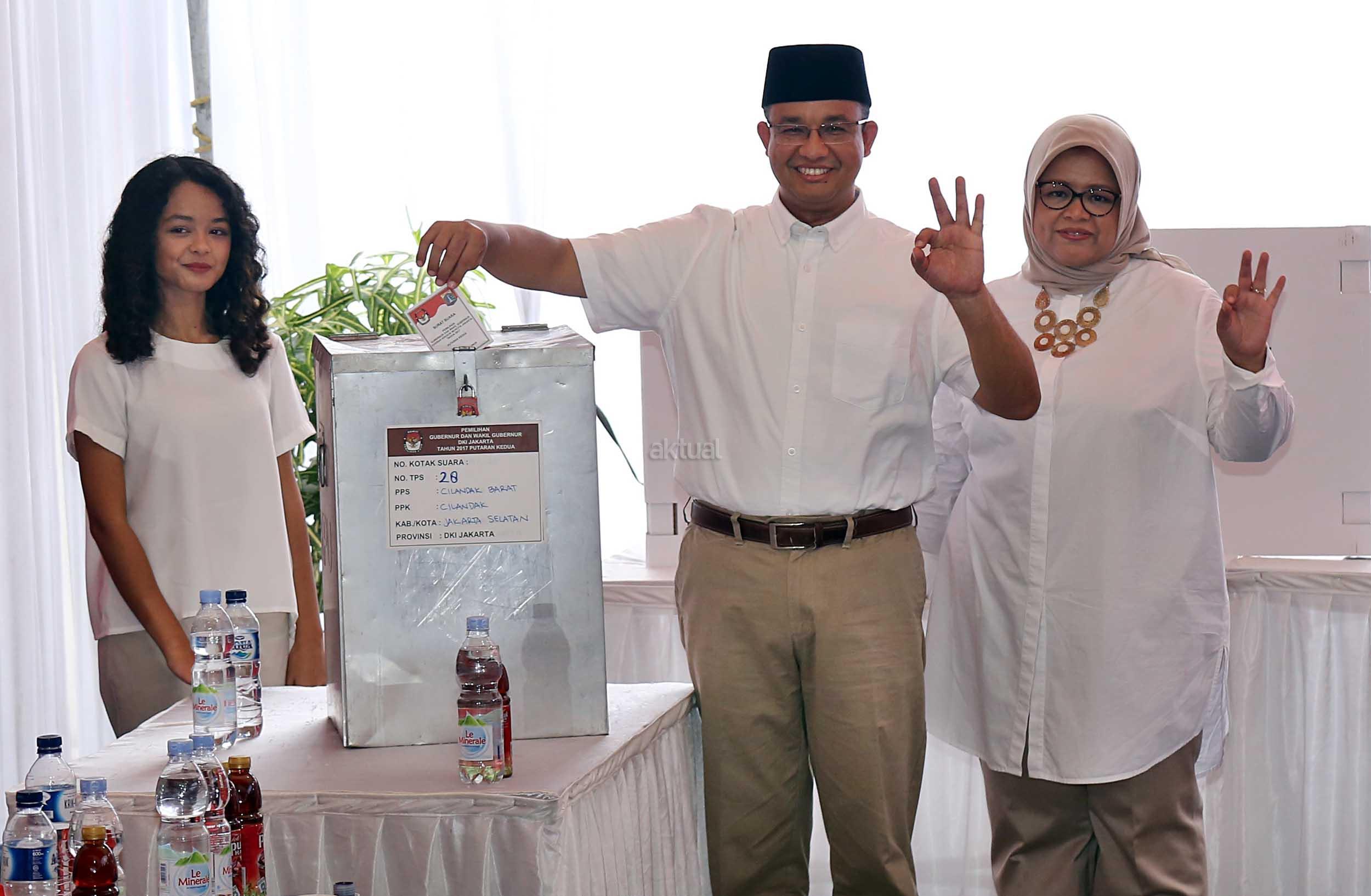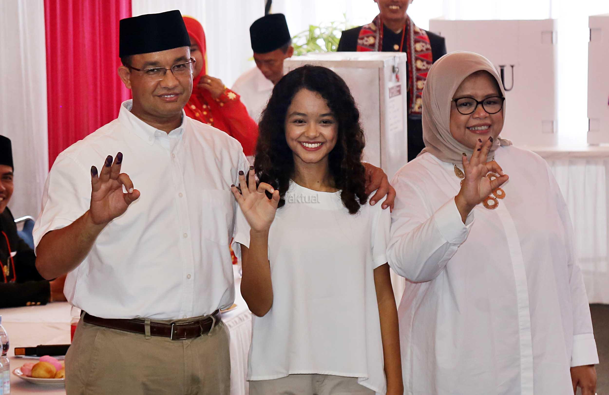 Calon Gubernur DKI Jakarta nomor urut tiga Anies Baswedan didampingi istri Fery Farhati Ganis dan anak Mutiara Annisa Baswedan saat memberikan hak pilih pada Pemilihan Gubernur di TPS 28 Cilandak Barat, Jakarta, Rabu (19/4). Pilkada putaran kedua yang diikuti dua pasang cagub dan cawagub DKI Jakarta periode 2017–2022 digelar serentak di seluruh wilayah Jakarta. AKTUAL/Tino Oktaviano