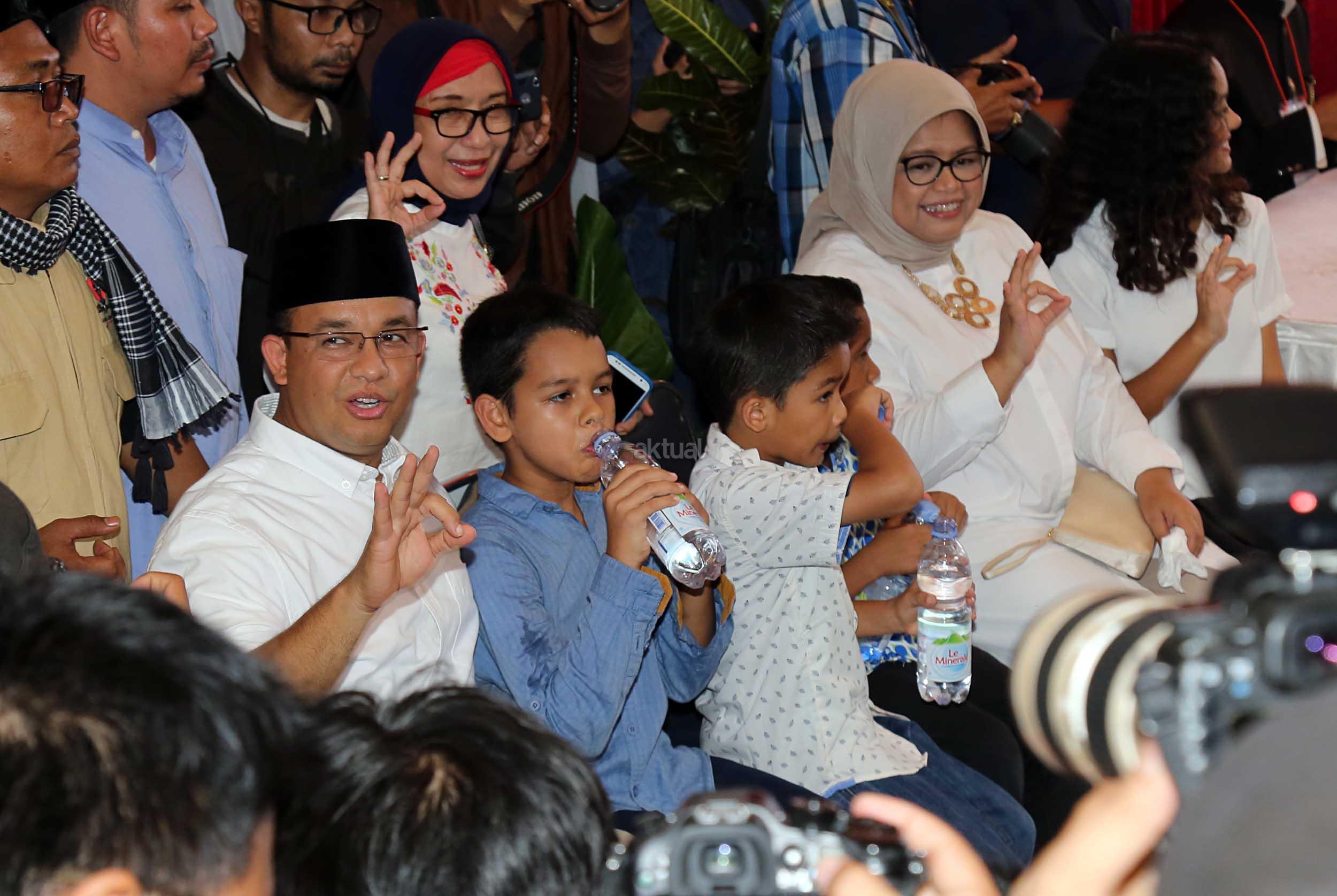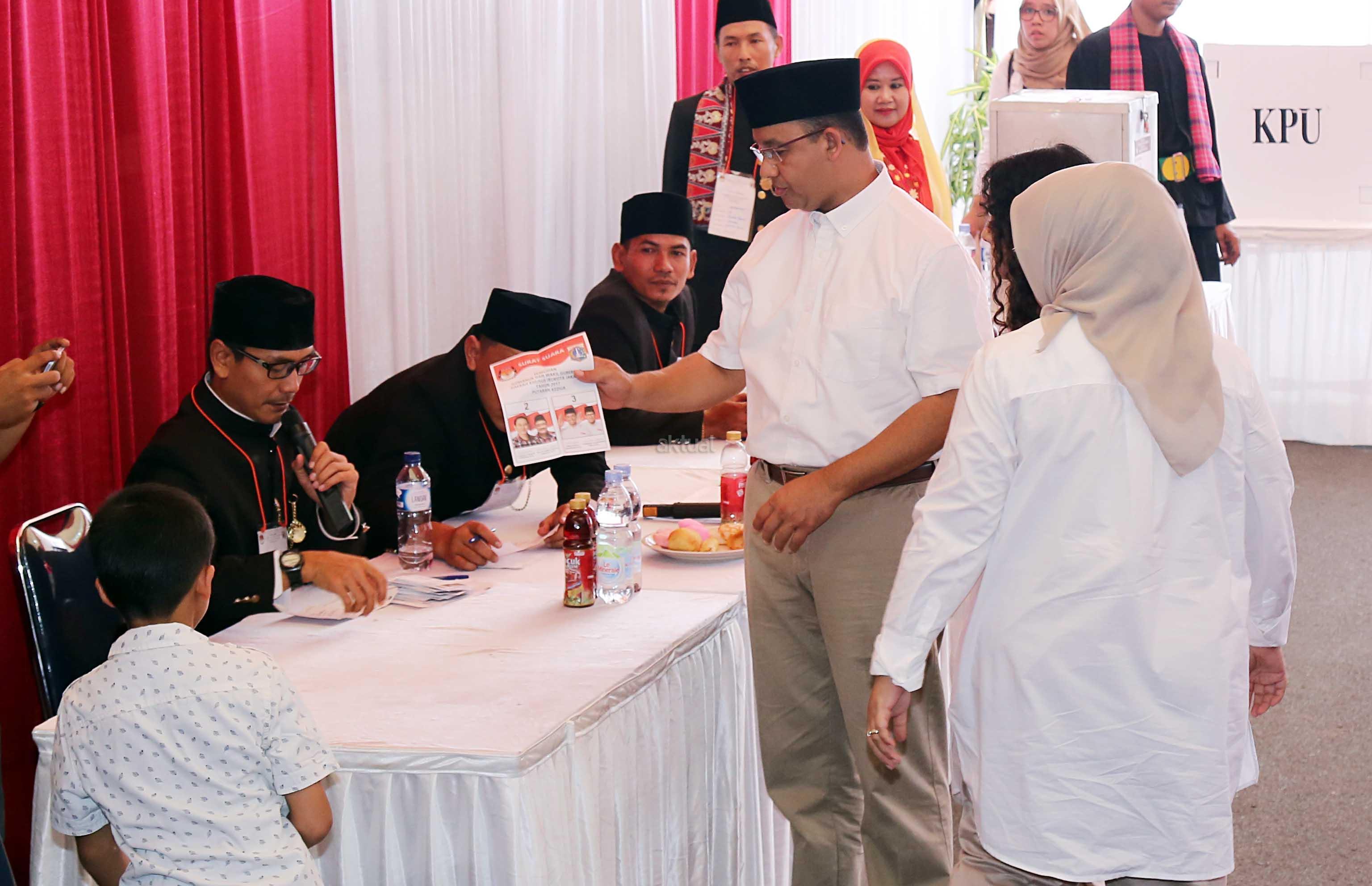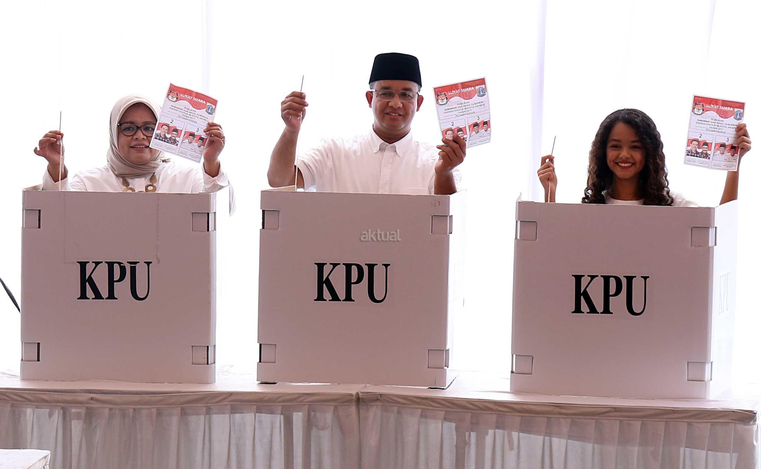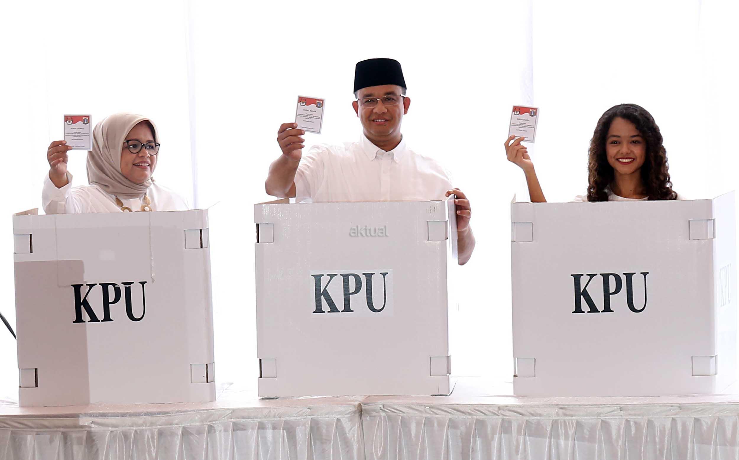 Calon Gubernur DKI Jakarta nomor urut tiga Anies Baswedan didampingi istri Fery Farhati Ganis dan anak Mutiara Annisa Baswedan saat memberikan hak pilih pada Pemilihan Gubernur di TPS 28 Cilandak Barat, Jakarta, Rabu (19/4). Pilkada putaran kedua yang diikuti dua pasang cagub dan cawagub DKI Jakarta periode 2017–2022 digelar serentak di seluruh wilayah Jakarta. AKTUAL/Tino Oktaviano