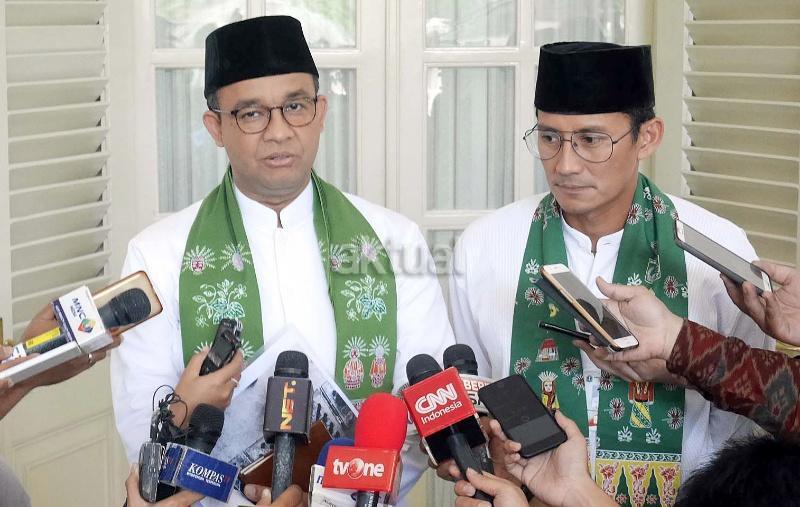 Pasangan Gubernur DKI Jakarta Anies Baswedan dan wakilnya, Sandiaga Uno ditanya wartawan usai bertemu Wapres Jusuf Kalla di Istana Wapres, Jakarta, Kamis (25/10). Dalam kunjungannya Anies dan Sandi berbagi pengalaman dengan JK dalam mempercepat proyek di ibu kota. Sama halnya seperti pertemuannya dengan Presiden Joko Widodo kemarin yang juga tak membahas soal reklamasi. AKTUAL/Tino Oktaviano