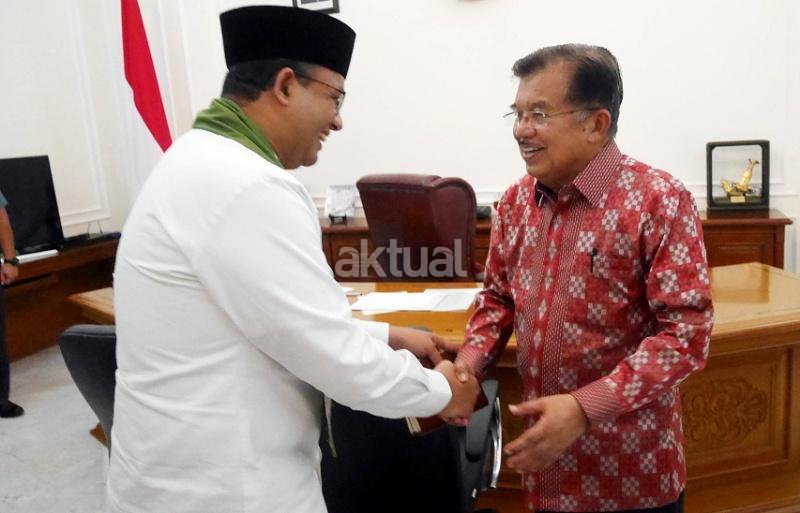 Wapres Jusuf Kalla menyalami Gubernur DKI Jakarta Anies Baswedan di Istana Wapres, Jakarta, Kamis (25/10). Dalam kunjungannya Anies dan Sandi berbagi pengalaman dengan JK dalam mempercepat proyek di ibu kota. Sama halnya seperti pertemuannya dengan Presiden Joko Widodo kemarin yang juga tak membahas soal reklamasi. AKTUAL/Tino Oktaviano