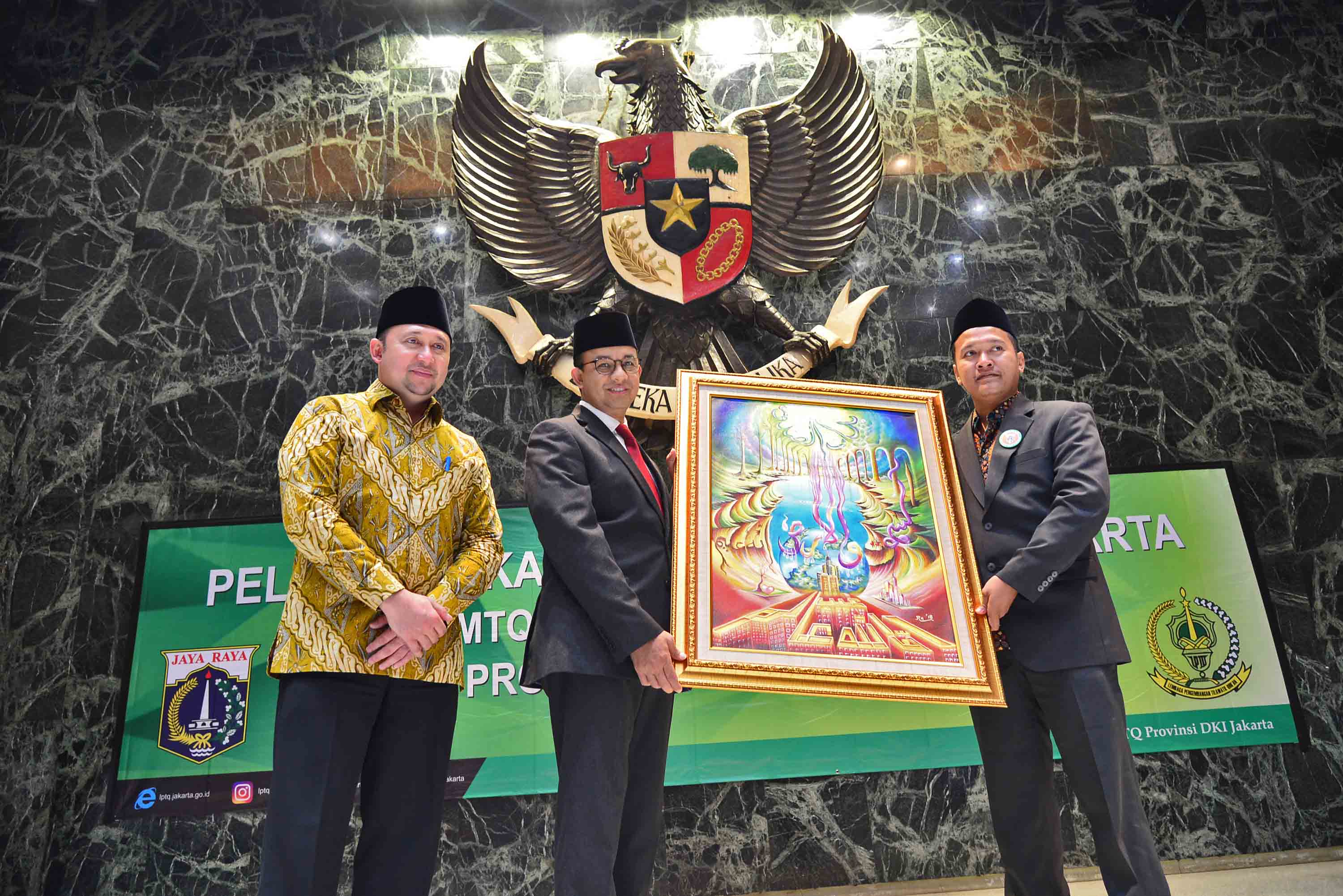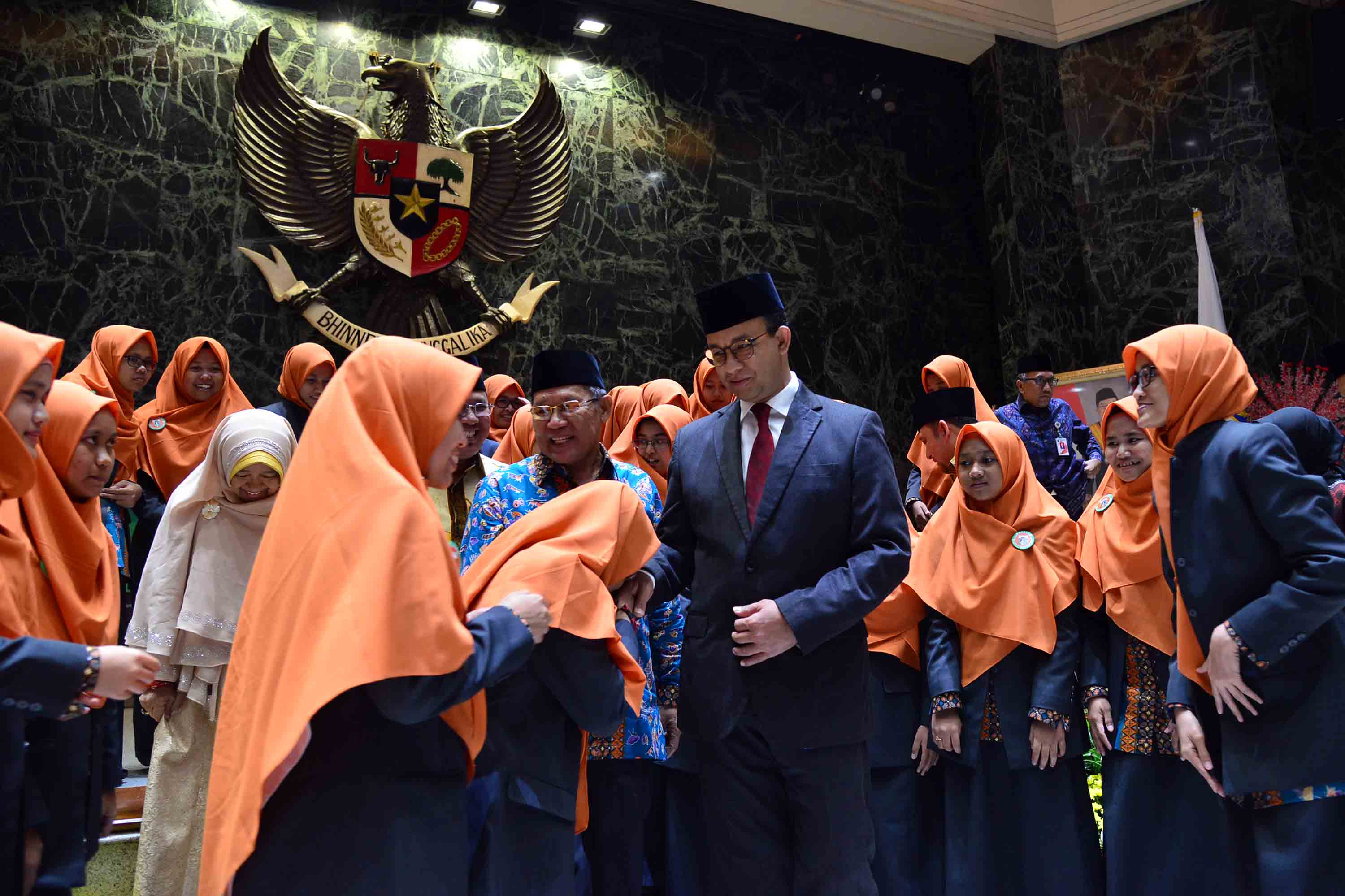 Gubernur DKI Jakarta Anies Baswedan (kiri) saat melepas Kafilah Provinsi DKI Jakarta untuk mengikuti Musabaqah Tilawatil Qur’an Tingkat Nasional XXVII di Balai Agung, Jakarta, Kamis (4/10). Anies berharap Kafilah Provinsi DKI Jakarta dapat meraih juara umum pada Musabaqah Tilawatil Quran (MTQ) tingkat Nasional XXVII yang akan digelar di Kota Medan dan Deli Serdang, Provinsi Sumatera Utara pada tanggal 4 hingga 13 Oktober 2018 mendatang. AKTUAL/Tino Oktaviano