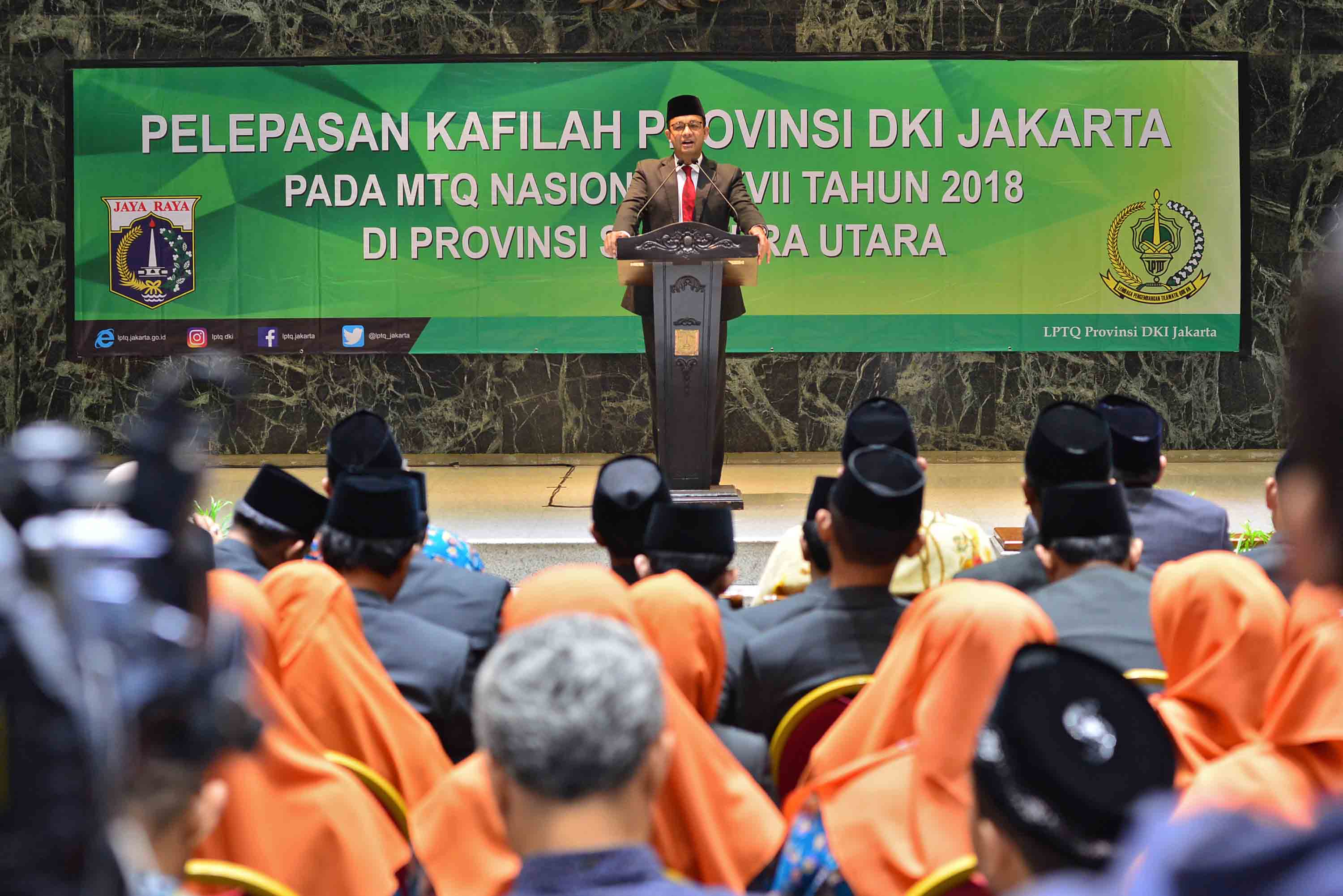 Gubernur DKI Jakarta Anies Baswedan saat melepas Kafilah Provinsi DKI Jakarta untuk mengikuti Musabaqah Tilawatil Qur'an Tingkat Nasional XXVII di Balai Agung, Jakarta, Kamis (4/10). Anies berharap Kafilah Provinsi DKI Jakarta dapat meraih juara umum pada Musabaqah Tilawatil Quran (MTQ) tingkat Nasional XXVII yang akan digelar di Kota Medan dan Deli Serdang, Provinsi Sumatera Utara pada tanggal 4 hingga 13 Oktober 2018 mendatang. AKTUAL/Tino Oktaviano