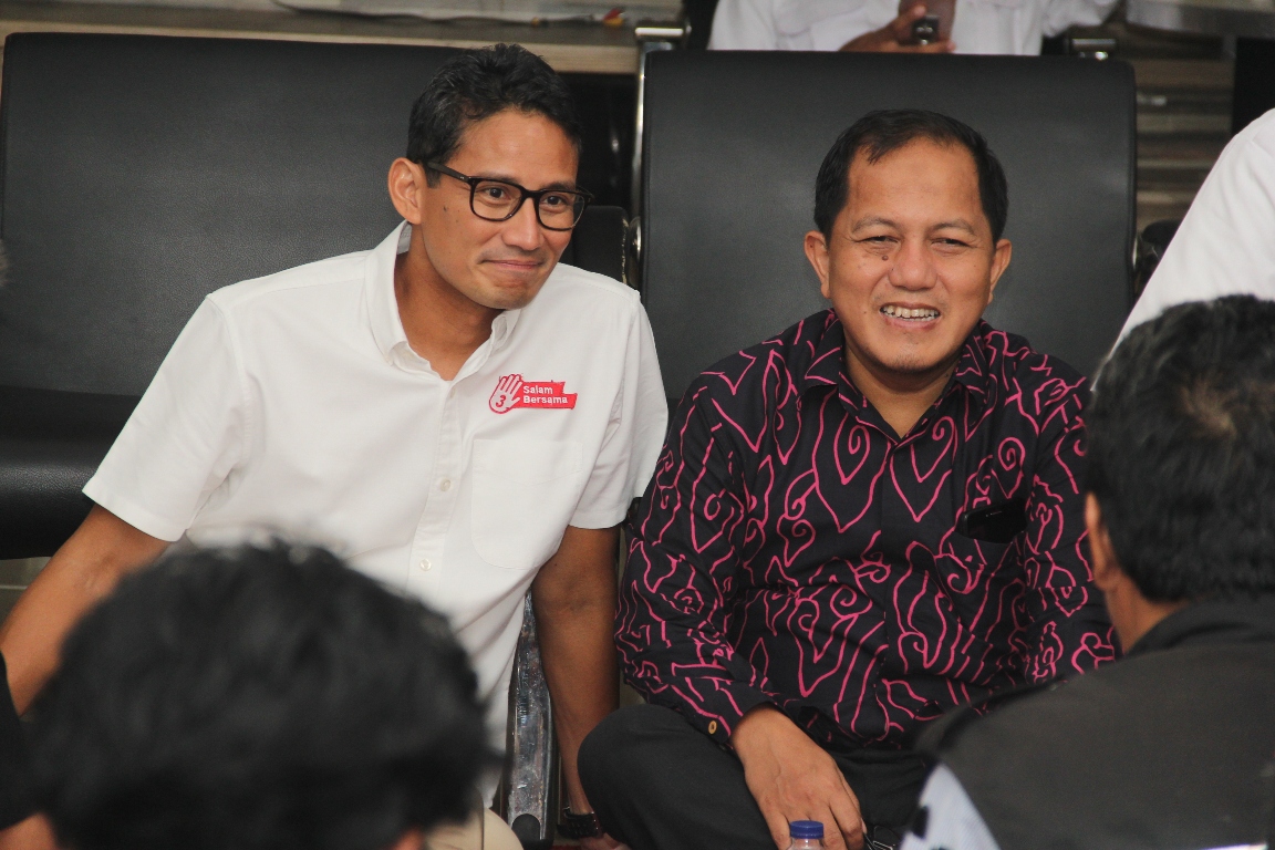 Cawagub DKI Jakarta Sandiaga Salahudin Uno (kiri) didampingi Anggota DPRD DKI Jakarta Fraksi PKS Tubagus Arif (kanan), dalam acara Silaturahim Tokoh Buruh dan Pekerja, yang tergabung dalam Koalisi Buruh Jakarta (KBJ), di Kantor DPTW PKS DKI Jakarta, Cempaka Baru, Kemayoran, Jakarta Pusat, Kamis (30/1/2017) malam.