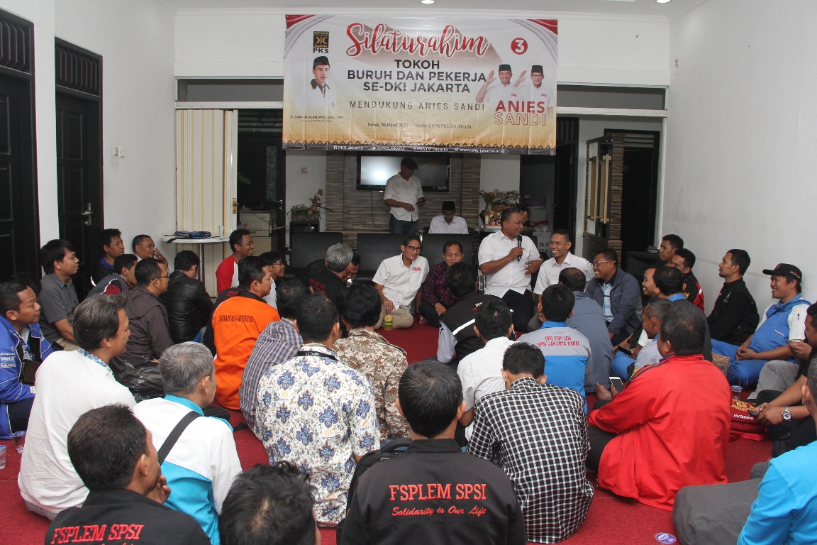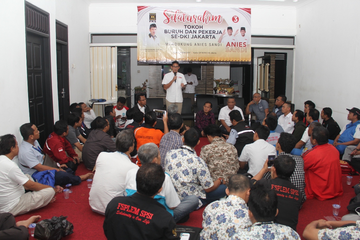 Calon Wakil Gubernur DKI Jakarta 2017-2022 Sandiaga Salahuddin Uno, berkomitmen untuk mensejahterakan Buruh dan Pekerja di Ibukota, bersama Anies Rasyid Baswedan. Demikian disampaikan Sandiaga setelah bersilaturahim dengan Tokoh dan Pimpinan Buruh Pekerja yang tergabung dalam Koalisi Buruh Jakarta (KBJ), di Kantor DPTW PKS DKI Jakarta, Cempaka Baru, Kemayoran, Jakarta Pusat, Kamis (30/1/2017) malam.