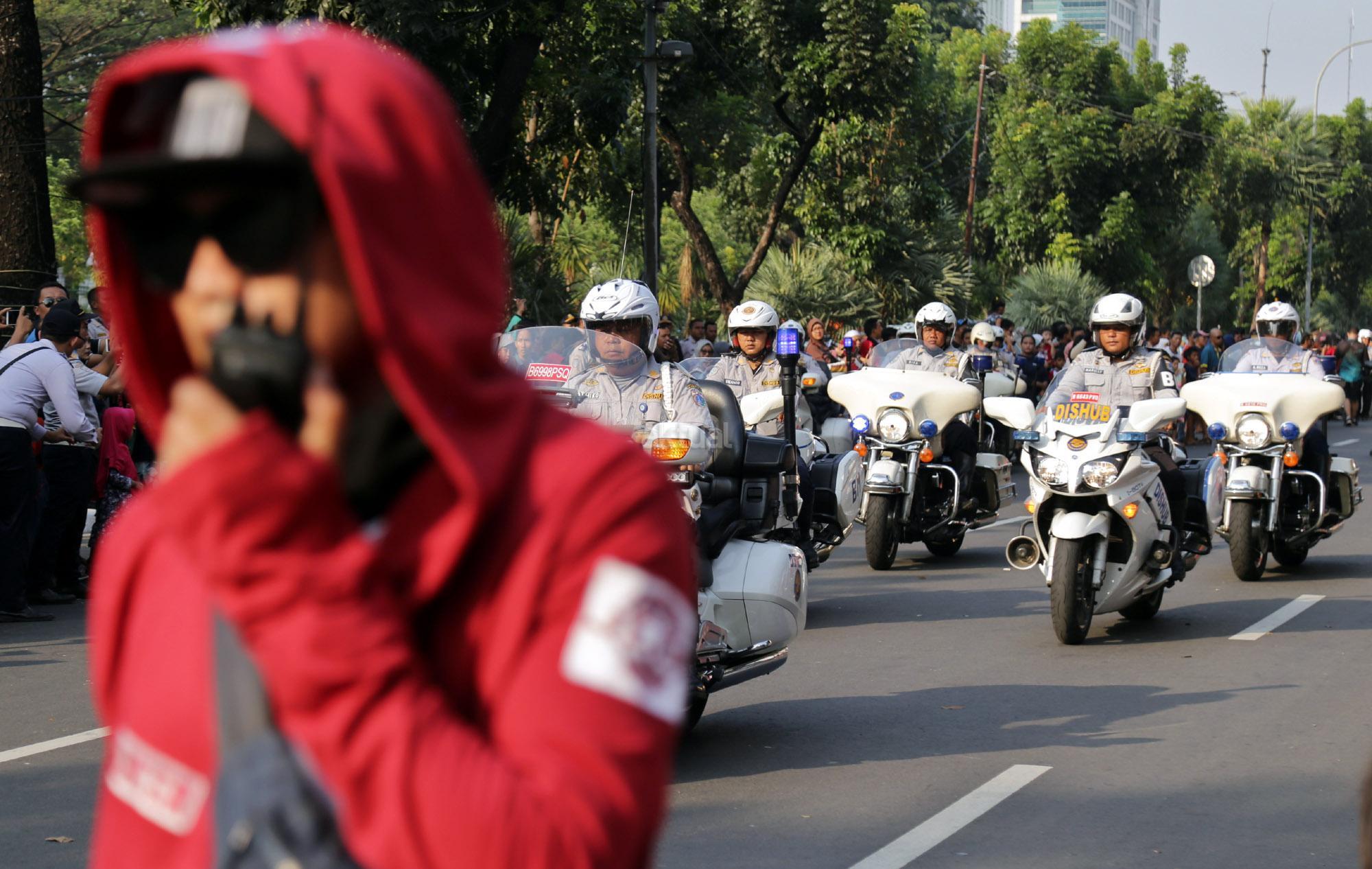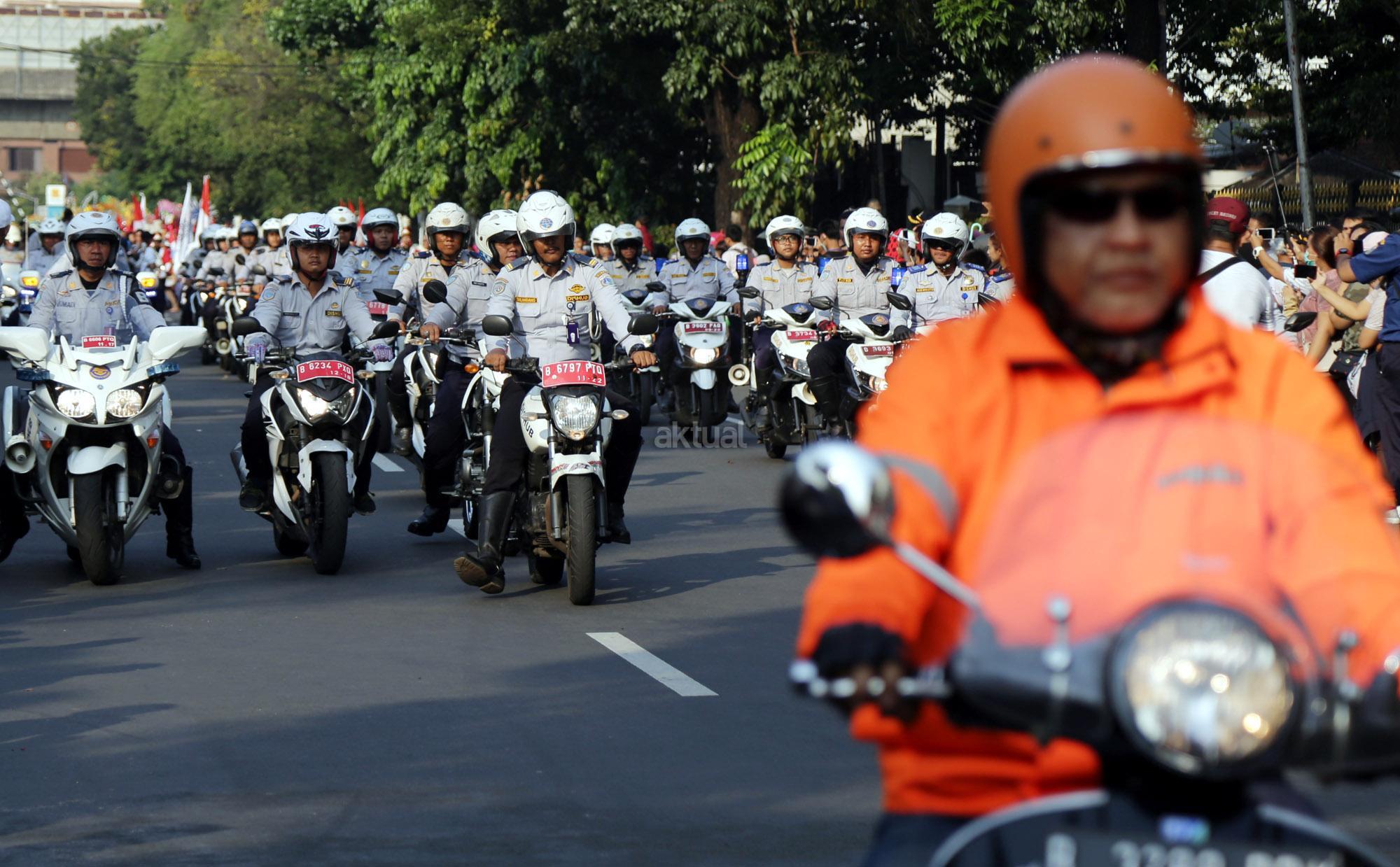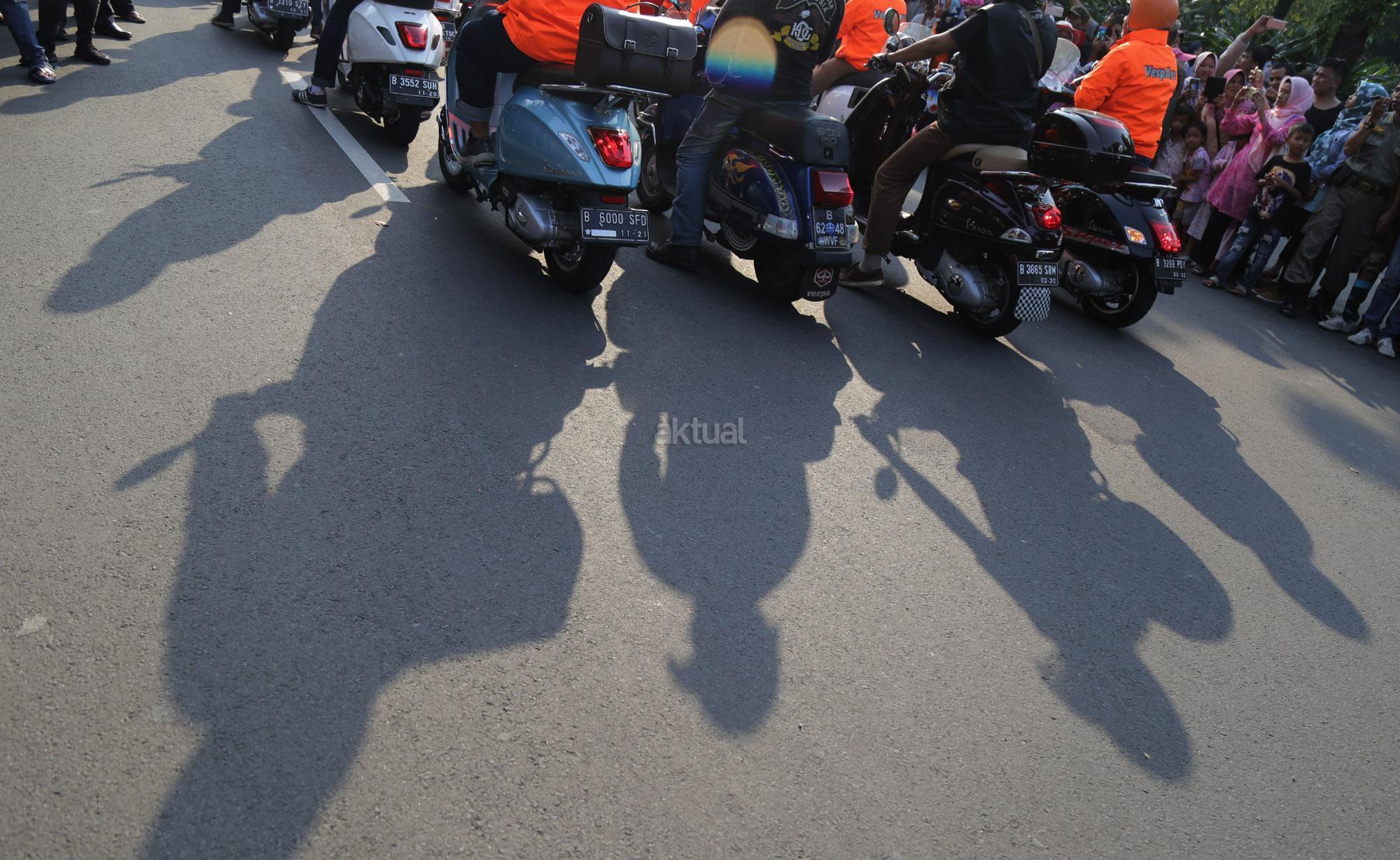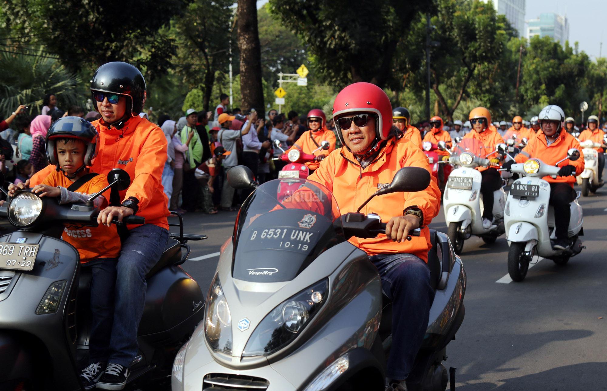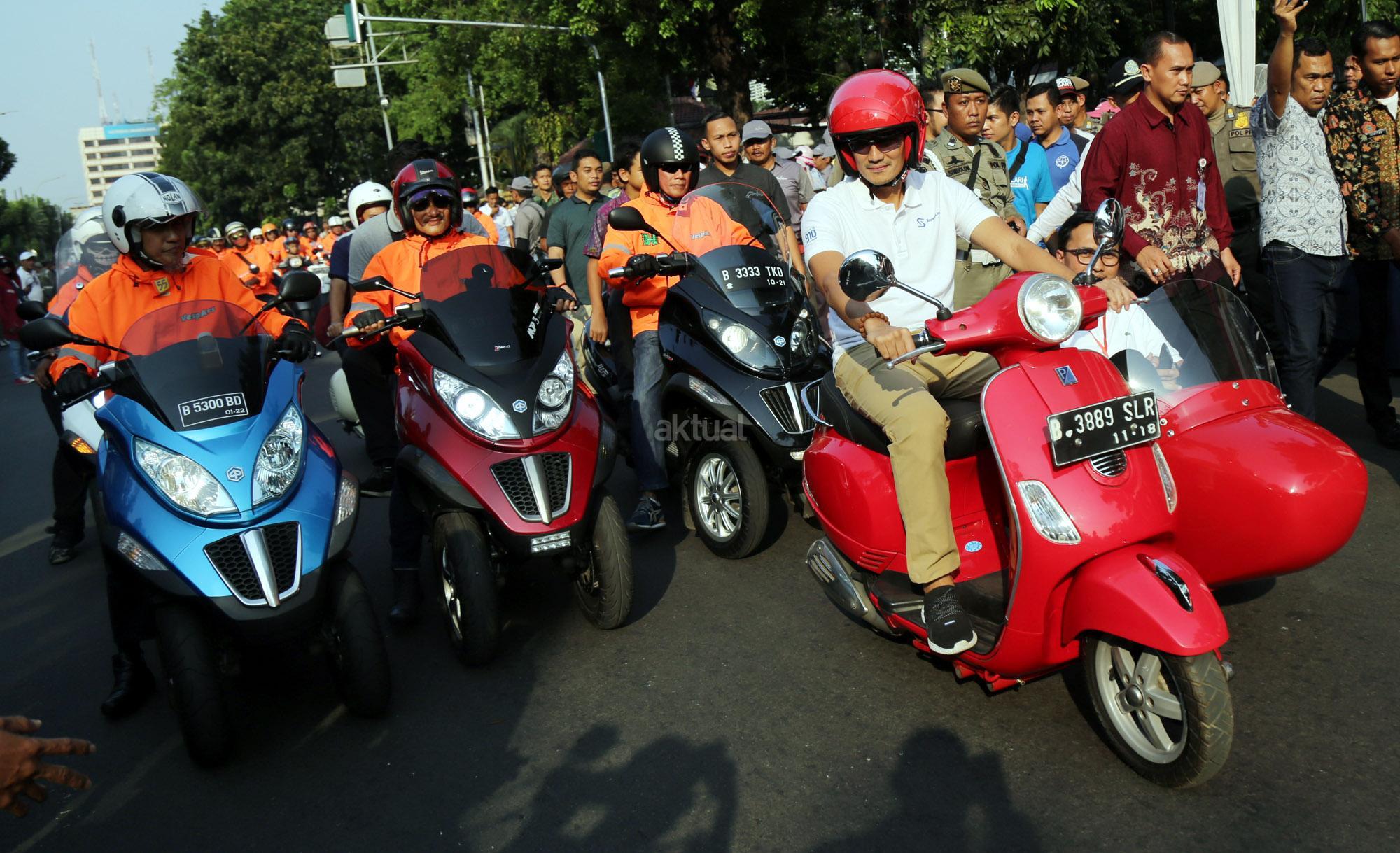 Anies dan Sandiaga berkonvoi bersama komunitas Vespa dan Patroli Sepeda Motor dari Dinas Perhubungan. AKTUAL/Tino Oktaviano
