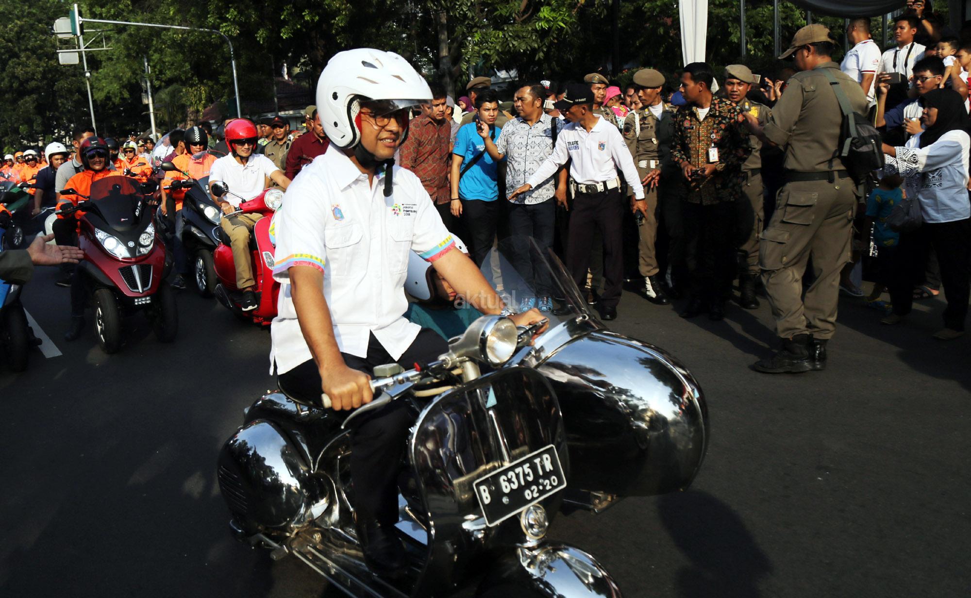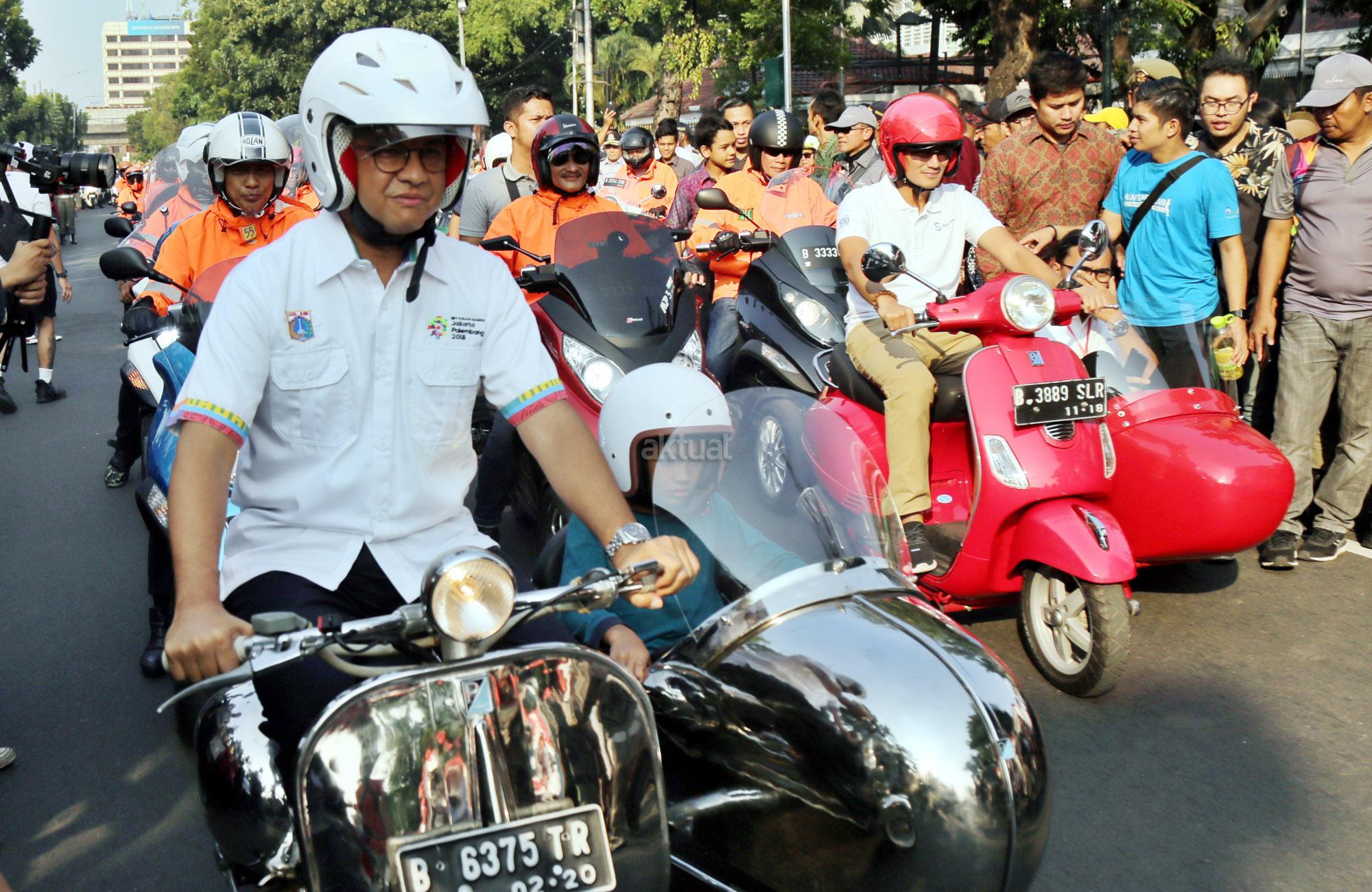 Gubernur DKI Jakarta Anies Baswedan bersama Wakil Gubernur DKI Jakarta Sandiaga Uno melakukan konvoi menggunakan Vespa yang telah dimodifikasi saat meramaikan festival Jakarnaval 2018 dengan berkonvoi di Balai Kota, Jalan Medan Merdeka Selatan, Jakarta Pusat, Minggu (8/7/2018). Anies dan Sandiaga berkonvoi bersama komunitas Vespa dan Patroli Sepeda Motor dari Dinas Perhubungan. AKTUAL/Tino Oktaviano