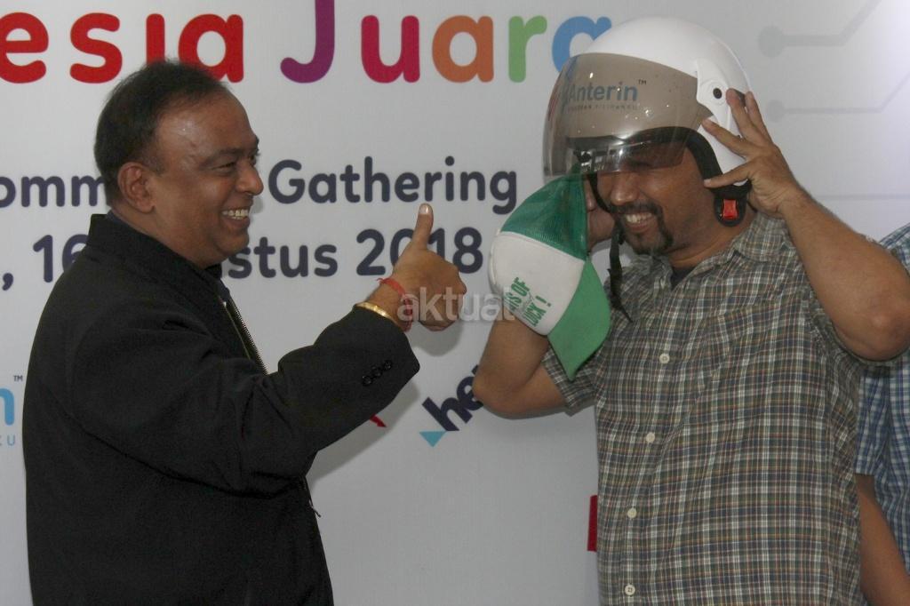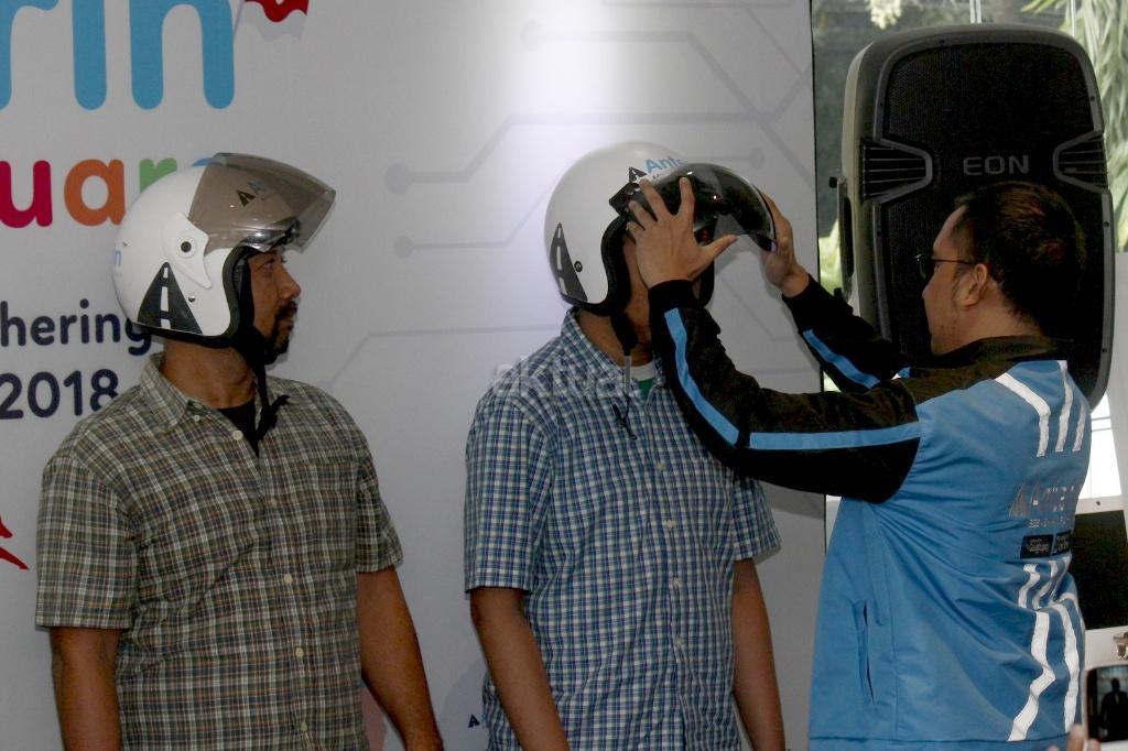 CEO anterin.id Imron Hamzah (kanan) memberikan helm kepda pengendra transportasi online usai penandatanganan kerjasama dan peluncuran layanan city tranporting network (Market Place) pertama kali di dunia untuk moda transportasi online di Jakarta, Kamis (16/8/2018). anterin.id merupakan aplikasi lokal untuk transportasi dan pengiriman atau pengantaran barang dengan harga yang bisa dinego. Cara ini diklaim pihaknya pertama di dunia. Melalui metode ini juga, pengguna bisa bebas memilih siapa driver yang memberikan harga terbaik dan terdekat dengan pengguna. AKTUAL/Tino Oktaviano