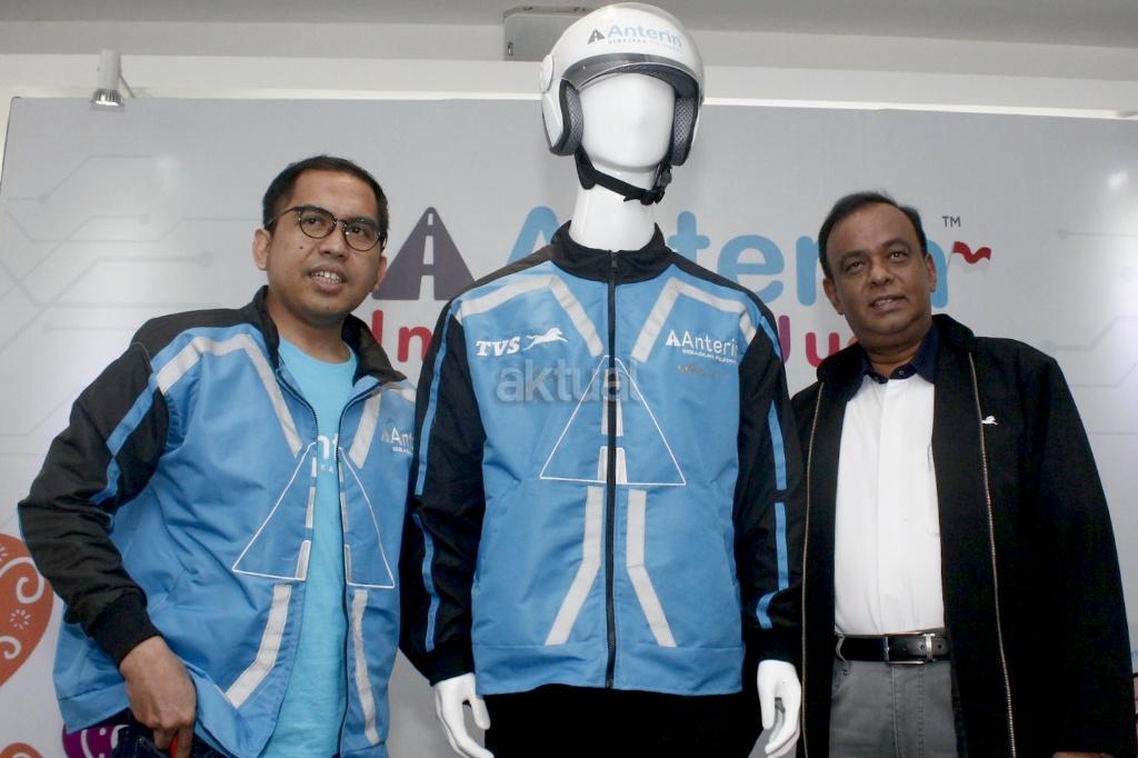 CEO anterin.id Imron Hamzah (kiri), Presdir PT TVS Motor Company Indonesia V Thiyagarajan (kanan) foto dengan kostum pengendra usai penandatanganan kerjasama dan peluncuran layanan city tranporting network (Market Place) pertama kali di dunia untuk moda transportasi online di Jakarta, Kamis (16/8/2018). anterin.id merupakan aplikasi lokal untuk transportasi dan pengiriman atau pengantaran barang dengan harga yang bisa dinego. Cara ini diklaim pihaknya pertama di dunia. Melalui metode ini juga, pengguna bisa bebas memilih siapa driver yang memberikan harga terbaik dan terdekat dengan pengguna. AKTUAL/Tino Oktaviano