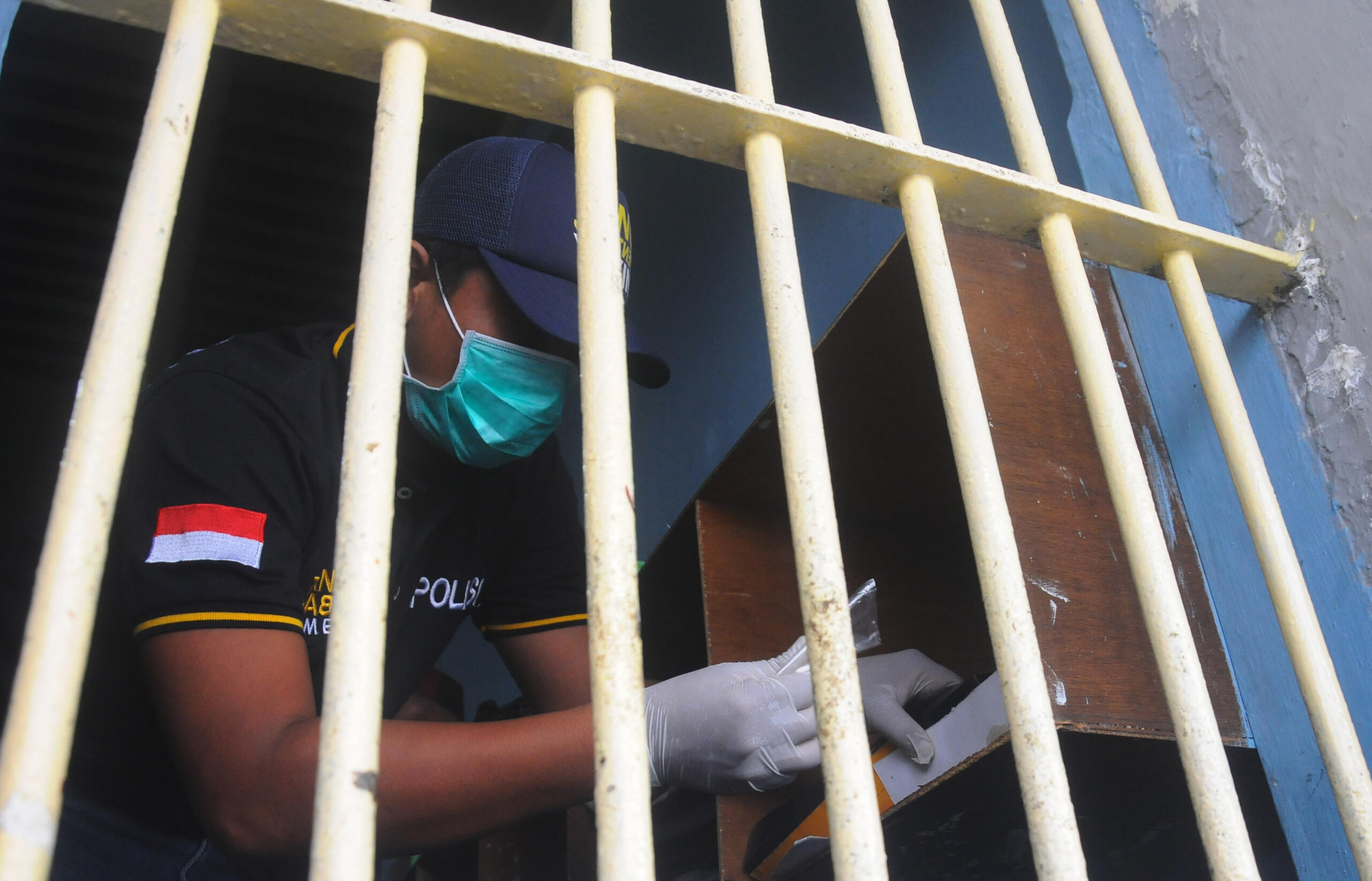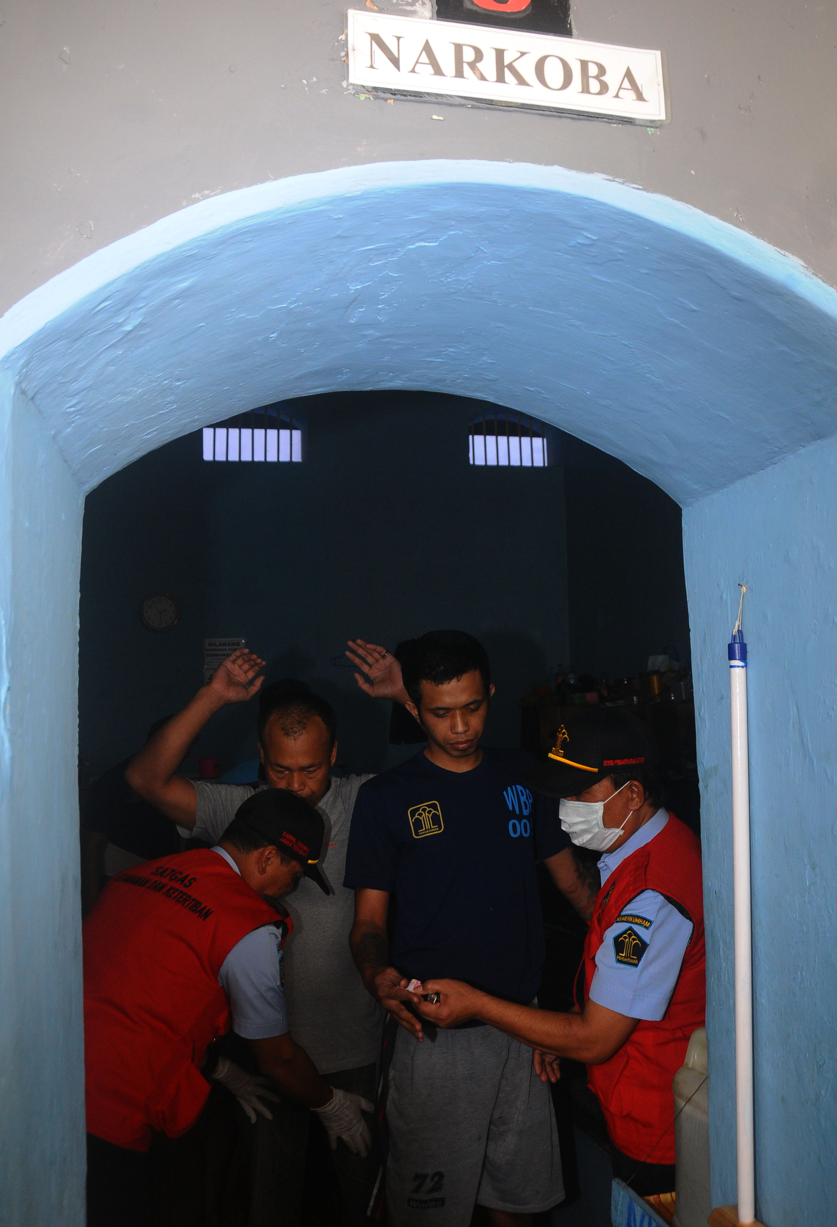 Petugas sipir melakukan razia kepada tahanan di Rumah Tahanan (Rutan) Salatiga, Jawa Tengah, Kamis (28/7). Petugas rutan bekerjasama dengan TNI dan Polri melakukan razia rutin di dalam rumah tahanan untuk mengantisipasi penggunaan telepon seluler dan narkoba. ANTARA FOTO/ Aloysius Jarot Nugroho/pras/16.