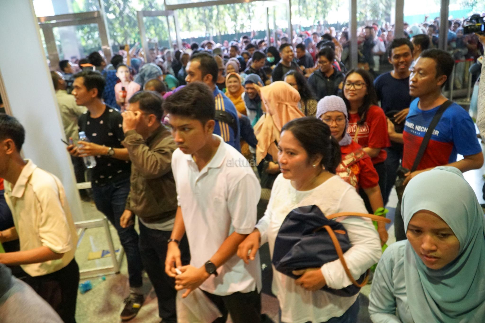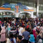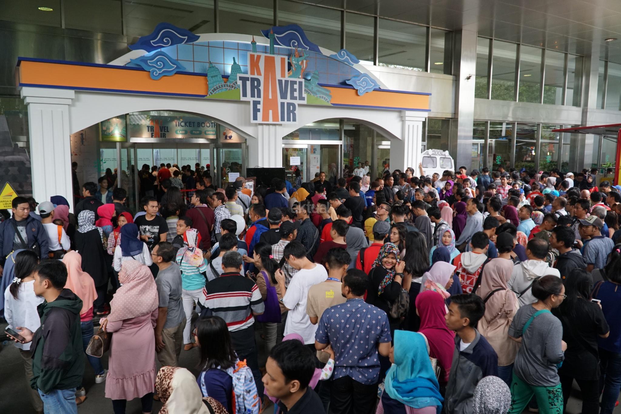 Pengunjung antri memadati pintu masuk penjualan tiket kereta api dalam Kereta Api Travel Fair di Jakarta Convention Center, Jakarta, Sabtu (29/7). KAI Travel Fair menawarkan sebanyak 642 ribu tiket kereta eksekutif dengan diskon harga dari 20 persen-72 persen untuk sejumlah tujuan seperti Yogyakarta, Bandung dan Malang. AKTUAL/Eko S Hilman