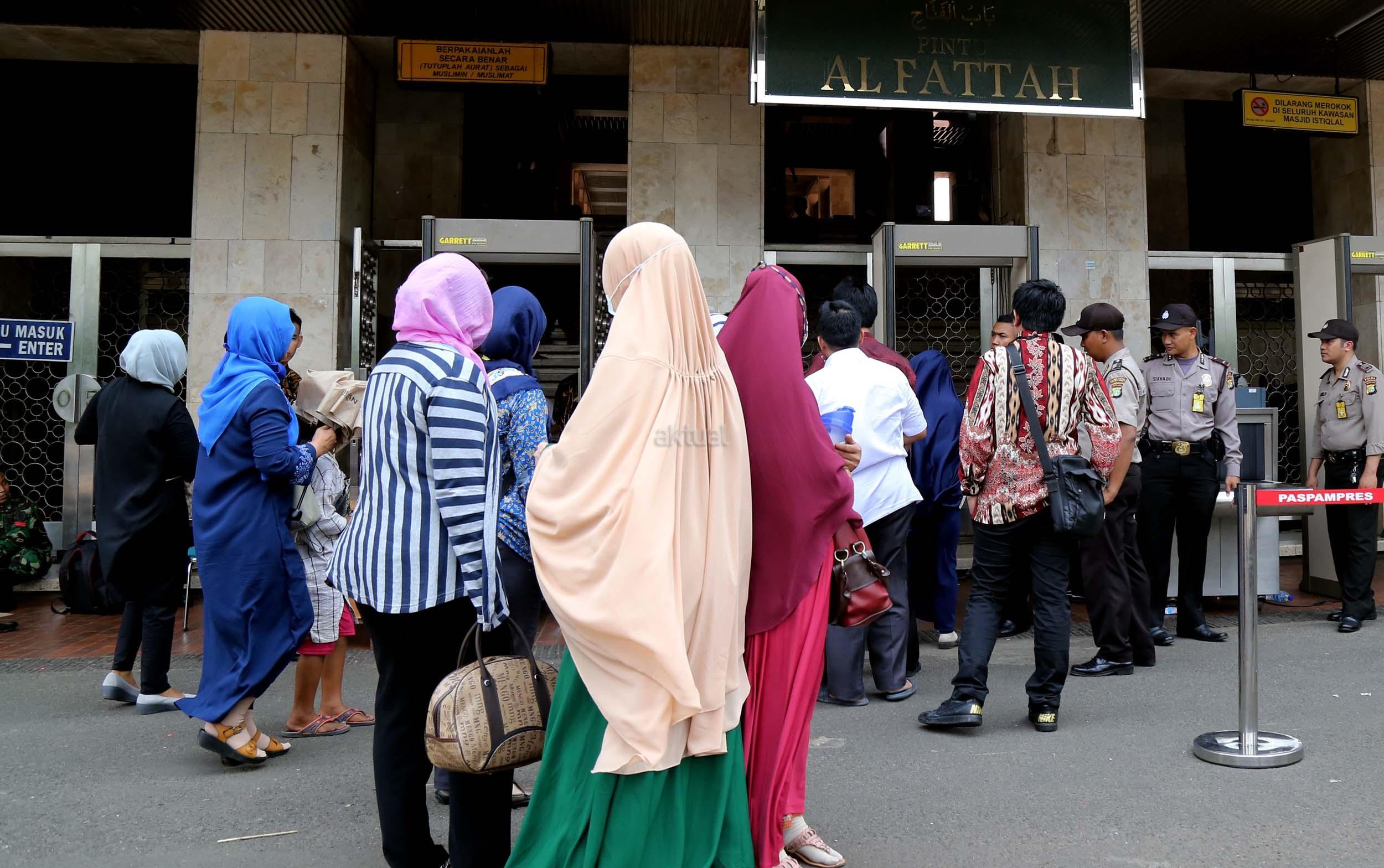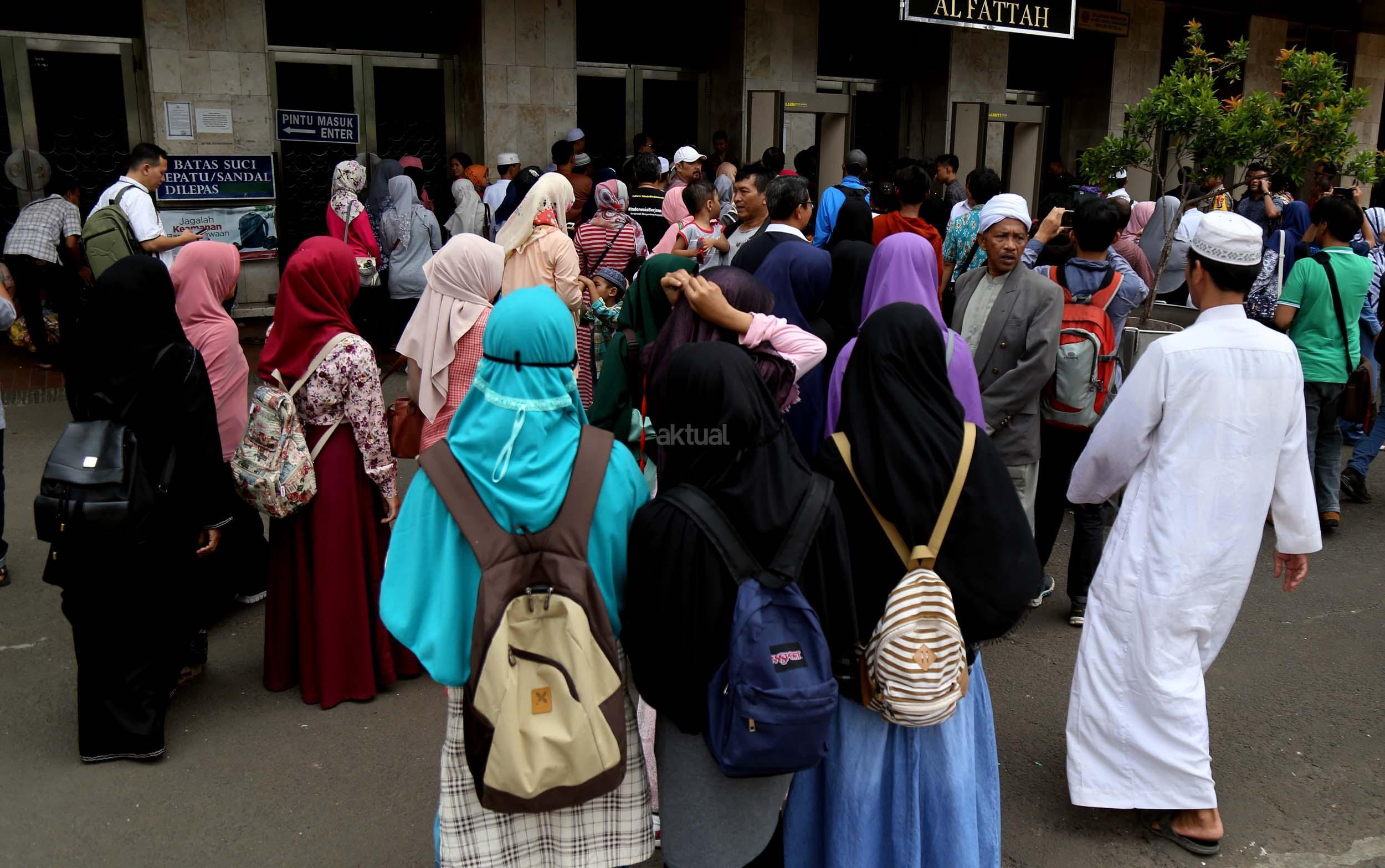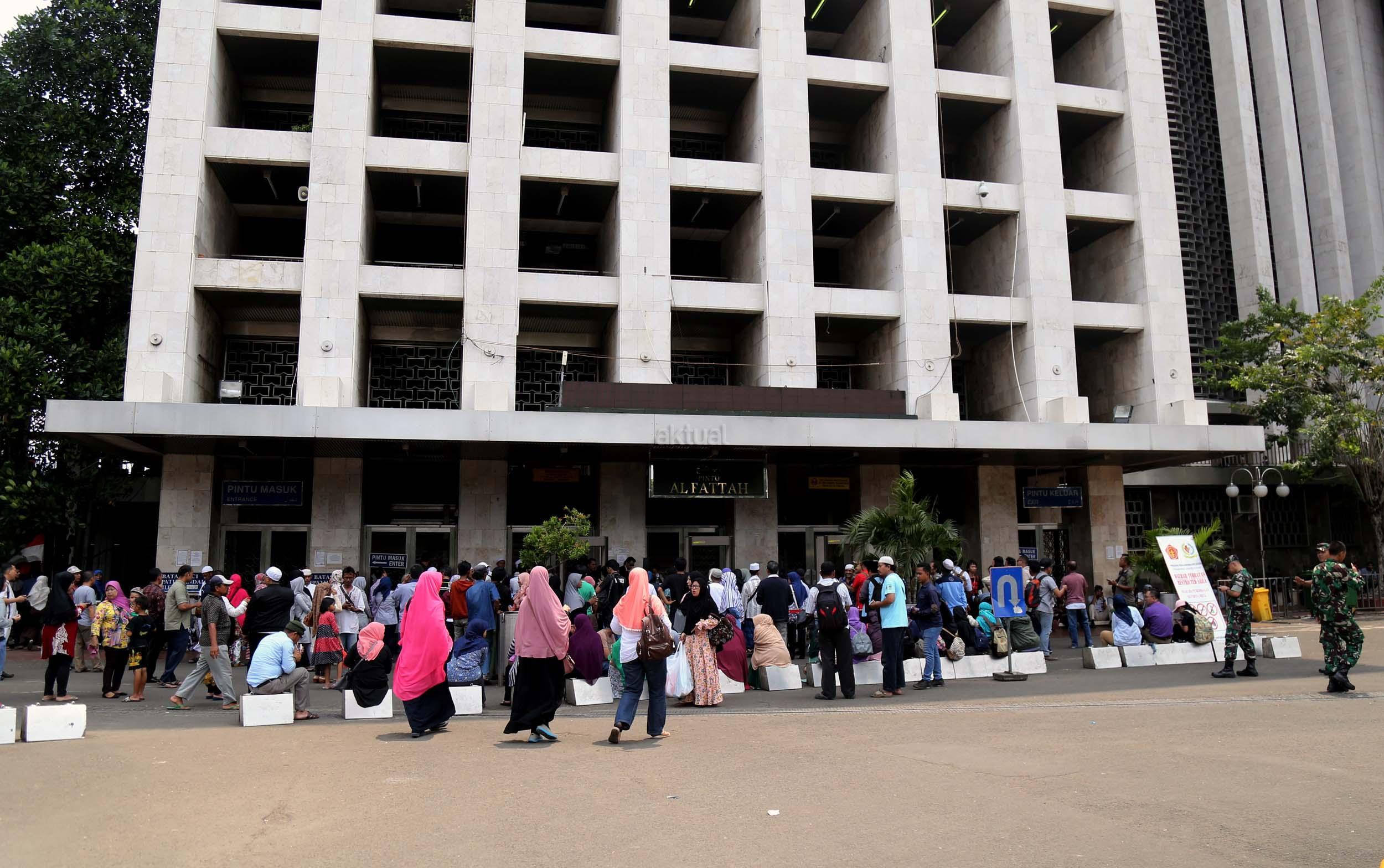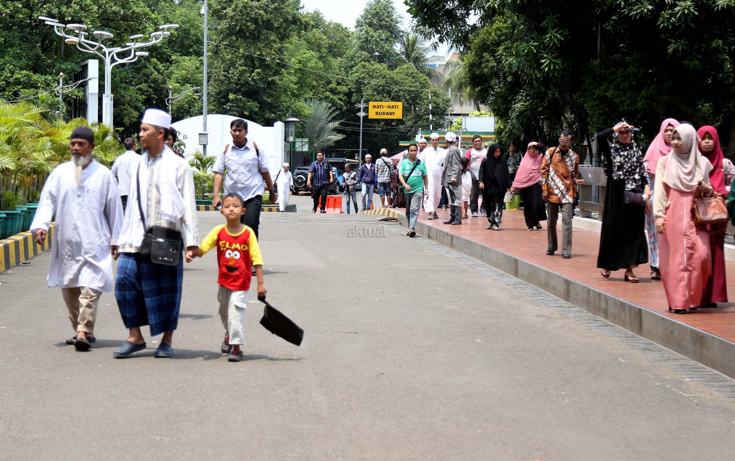 Terlihat masyarakat berdatangan ke Masjid Istiqlal, Jakarta, Kamis (2/3/2017). Kehadiran mereka ingin melihat secara langsung dari dekat Raja Salman, meski Sang Raja dan Presiden dijadwalkan tiba di Masjid Istiqlal sekitar pukul 13.45 menit.