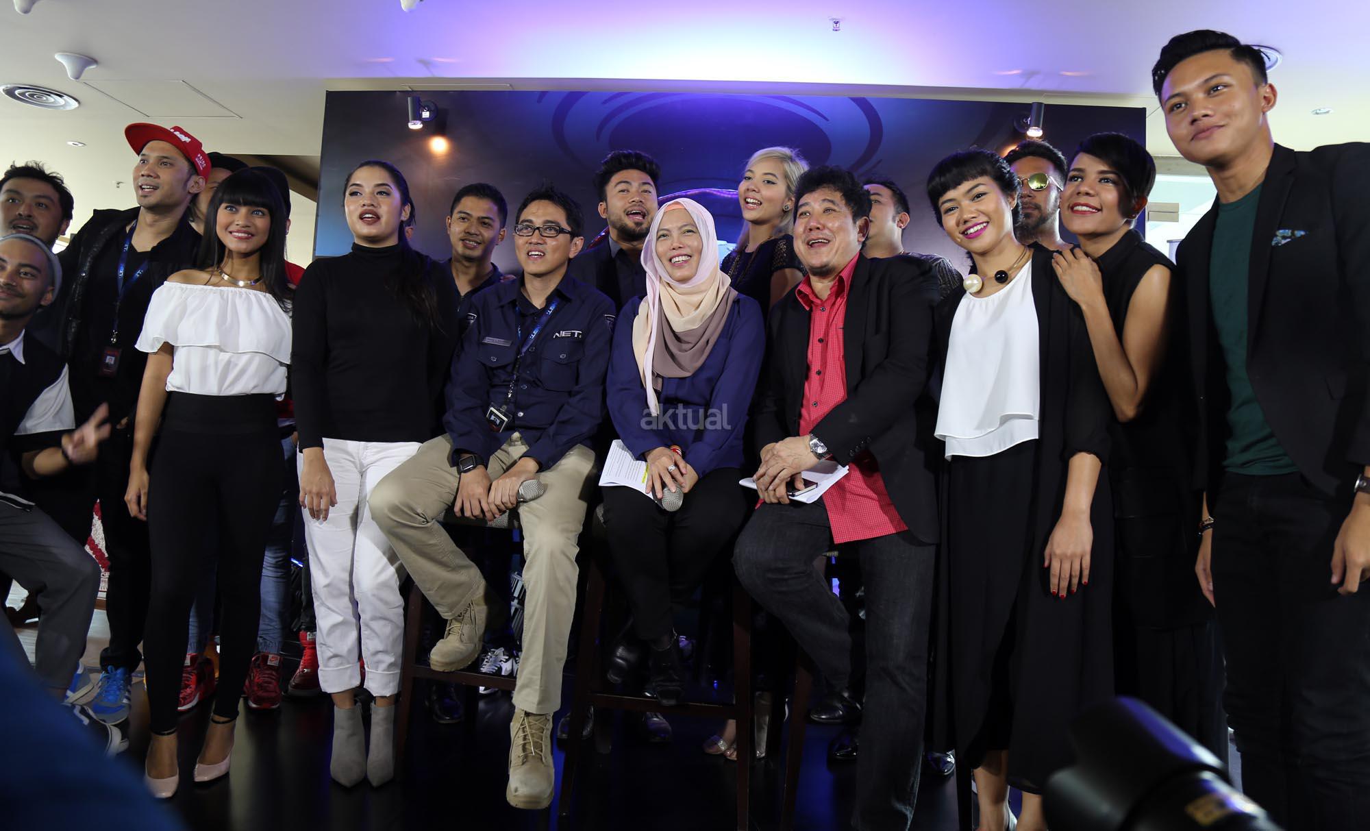 Ketua Penyiaran Melayu Media Corp, Zakiah Halim (tengah) didampingi Assistant Vice President Malaysia Community Mediacorp, Hasan Salleh (kanan) foto bersama artis saat konferensi pers Anugerah Planet Muzik (APM) 2015 di Jakarta, Kamis (17/9). Ajang penghargaan musik Asia Tenggara ini digelar pada 9 Oktober 2015 di Suntec Singapura. Memasuki perhelatan ke-14, ajang yang diselenggarakan oleh Malay Community MediaCorp, bersamaan dengan HUT Emas Kemerdekaan Singapura. Dan tahun ini, sebanyak 21 musisi Indonesia mewarnai berbagai kategori nominasi. Mereka juga bersanding dengan para musisi dari Malaysia dan Singapura. AKTUAL/TINO OKTAVIANO