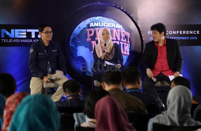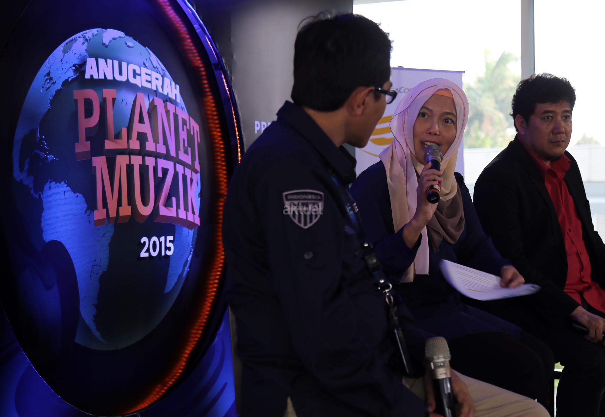 Ketua Penyiaran Melayu Media Corp, Zakiah Halim (tengah) didampingi Assistant Vice President Malaysia Community Mediacorp, Hasan Salleh (kanan) saat konferensi pers Anugerah Planet Muzik (APM) 2015 di Jakarta, Kamis (17/9). Ajang penghargaan musik Asia Tenggara ini digelar pada 9 Oktober 2015 di Suntec Singapura. Memasuki perhelatan ke-14, ajang yang diselenggarakan oleh Malay Community MediaCorp, bersamaan dengan HUT Emas Kemerdekaan Singapura. Dan tahun ini, sebanyak 21 musisi Indonesia mewarnai berbagai kategori nominasi. Mereka juga bersanding dengan para musisi dari Malaysia dan Singapura. AKTUAL/TINO OKTAVIANO