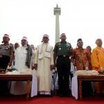 Sejumlah tokoh lintas agama berdoa saat berlangsungnya Apel Nasional Nusantara Bersatu di Silang Monas, Jakarta, Rabu (30/11/2016). Apel Nasional Nusantara Bersatu bertujuan untuk memperkokoh rasa persatuan dan kesatuan bangsa yang diikuti oleh pelajar dari tingkat SMP sampai universitas, tokoh lintas agama, budayawan, pejabat publik, musisi, artis, dan lain sebagainya. AKTUAL/Munzir
