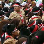 Menteri Sosial (Mensos) Khofifah Indar Parawansa (tengah) menghadiri acara Apel Nasional Nusantara Bersatu di Silang Monas, Jakarta, Rabu (30/11/2016). Apel Nasional Nusantara Bersatu bertujuan untuk memperkokoh rasa persatuan dan kesatuan bangsa yang diikuti oleh pelajar dari tingkat SMP sampai universitas, tokoh lintas agama, budayawan, pejabat publik, musisi, artis, dan lain sebagainya. AKTUAL/Munzir