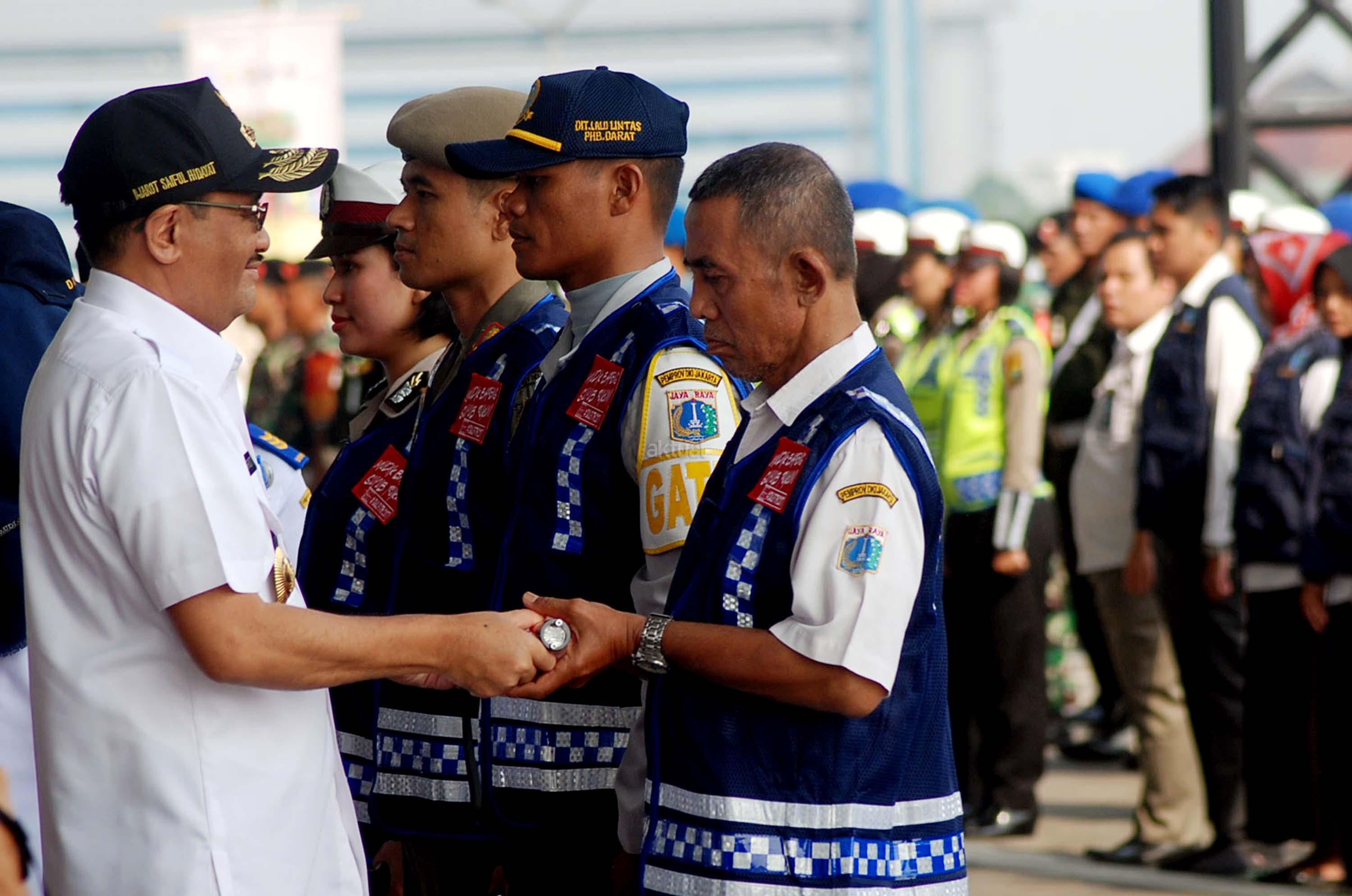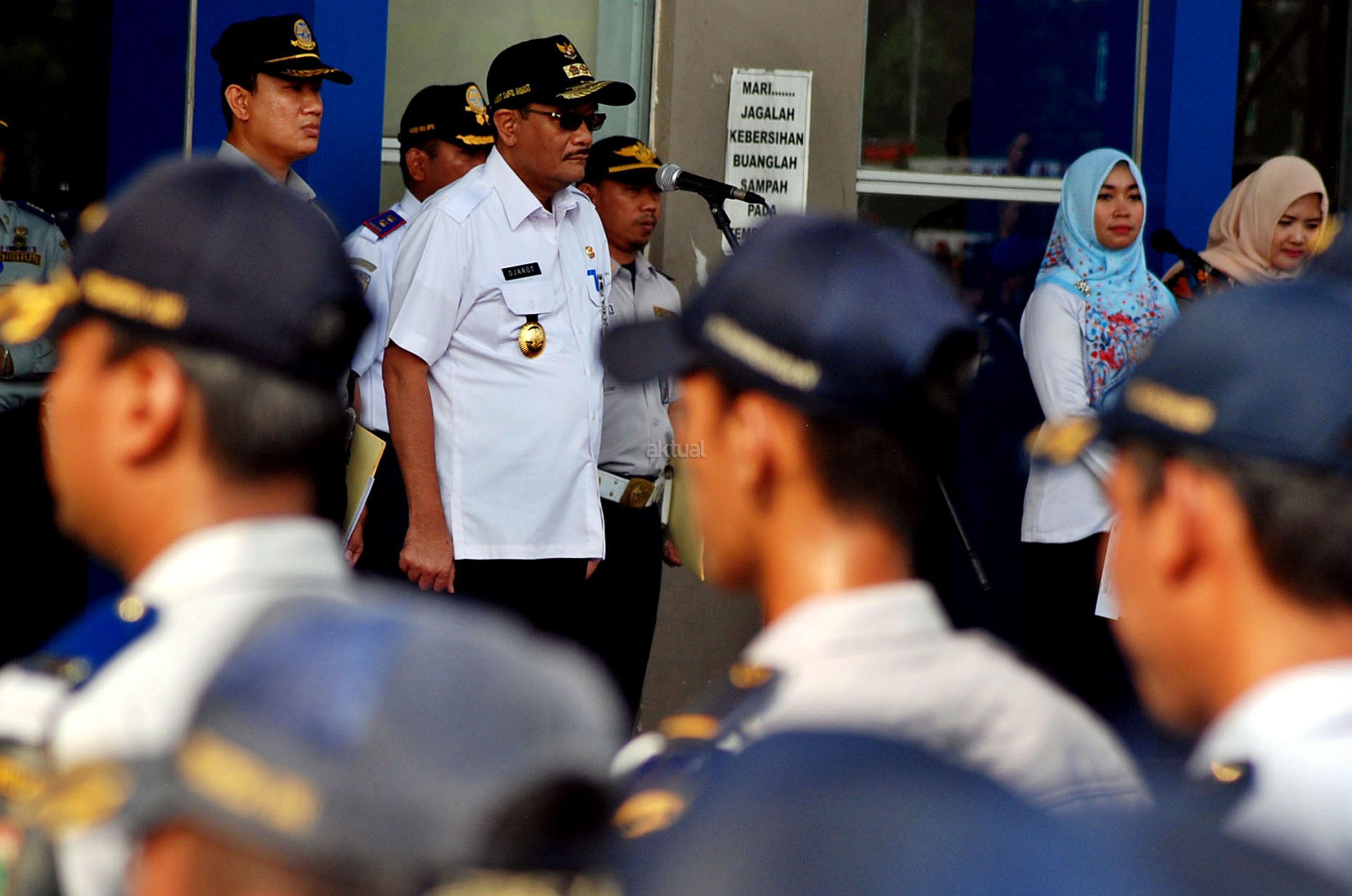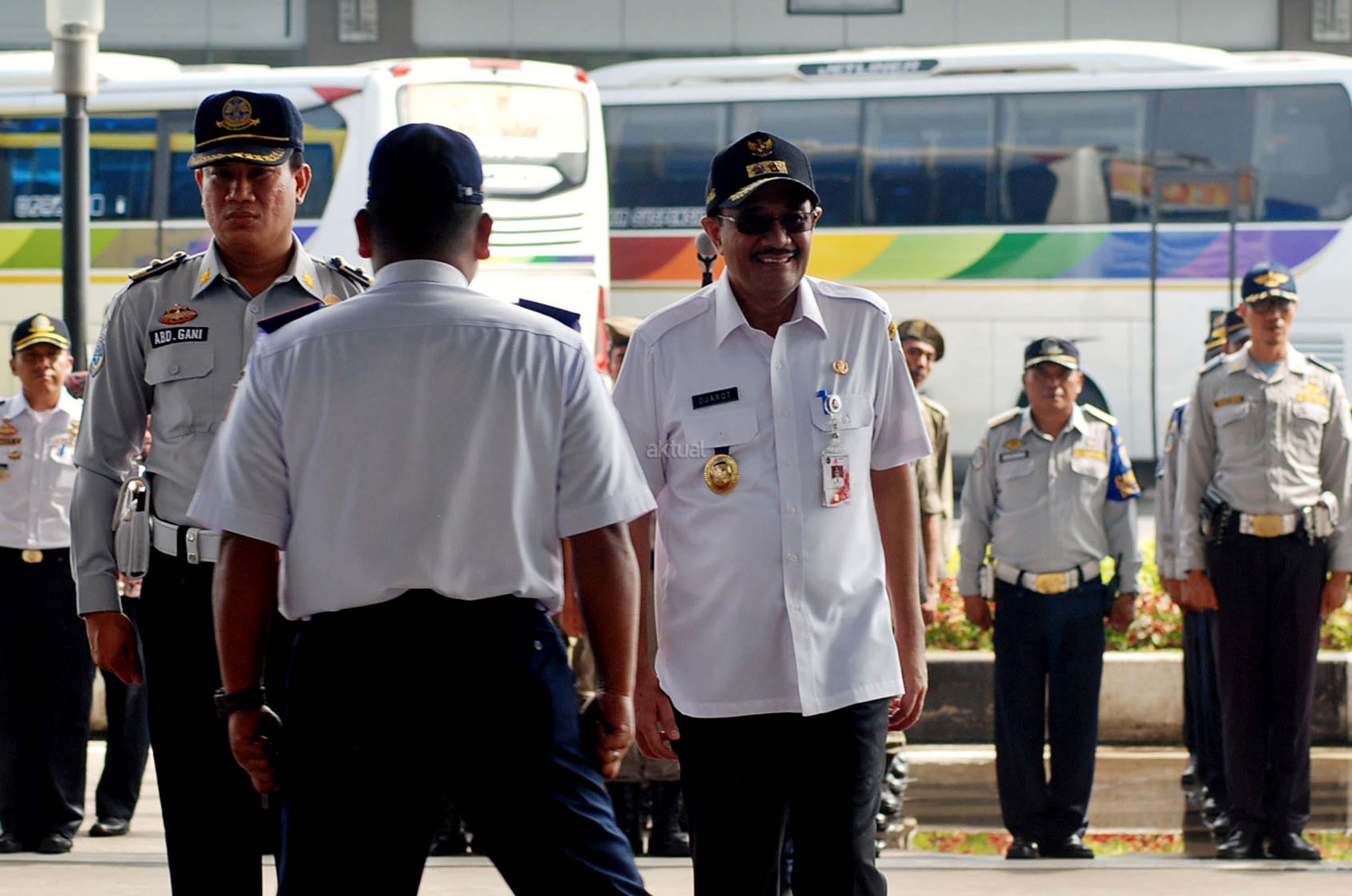 Plt GUbernur DKI Jakarta, Djarot Saiful Hidayat saat menghadiri sekaligus meninjau Apel Siaga Pengendalian Mudik dan Arus Balik dalam rangka Idul Fitri 2017/ 1438 H di Terminal Terpadu Pulo Gebang, Jakarta Timur, Rabu (14/6/2017). Sebanyak 500 personil gabungan baik dari kepolisian, TNI/Polri, Dinas Perhubungan, Satpol PP, Damkar, Pramuka dan Dinas Kebersihan mengikuti Apel Arus Mudik 2017. AKTUAL/Munzir