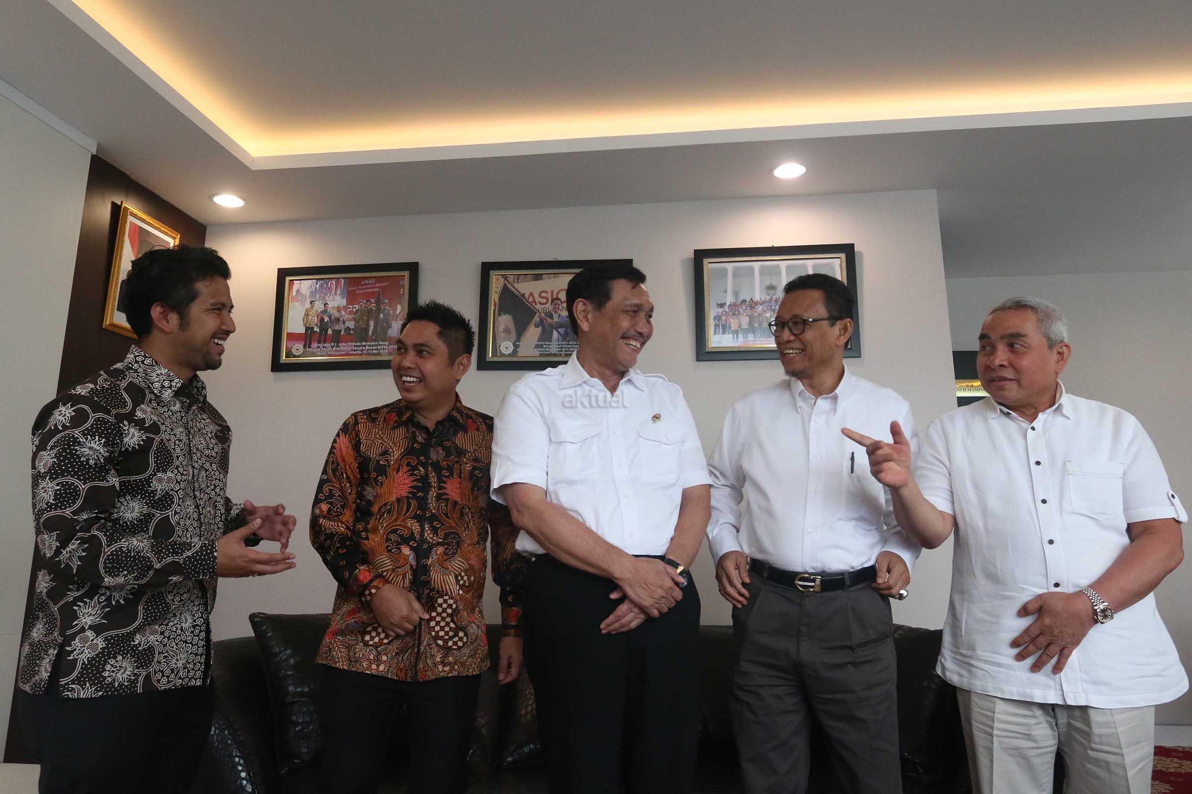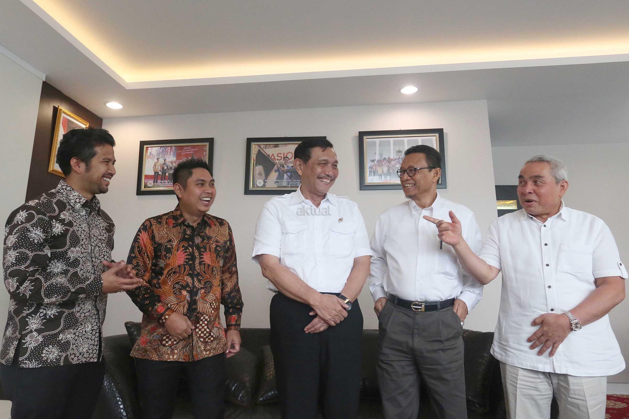Dari kiri ke kanan, Wakil Ketua Umum Asosisi Pemerintah Kabupaten Seluruh Indonesia (APKASI) Emil Dardak, Ketua Umum APKASI Mardani H. Maming, Menko Maritim Luhut B. Pandjaitan dan Penasihat APKASI Prof Ryaas Rasyid berbincang di sela acara dialog interaktif Para Bupati dengan Menko Kemaritimian di Jakarta, Rabu (14/12). Dialog ini membahas Strategi Pembangunan Indonesia untuk Pertumbuhan, Pemerataan dan Sektor Maritim. AKTUAL/Eko S Hilman