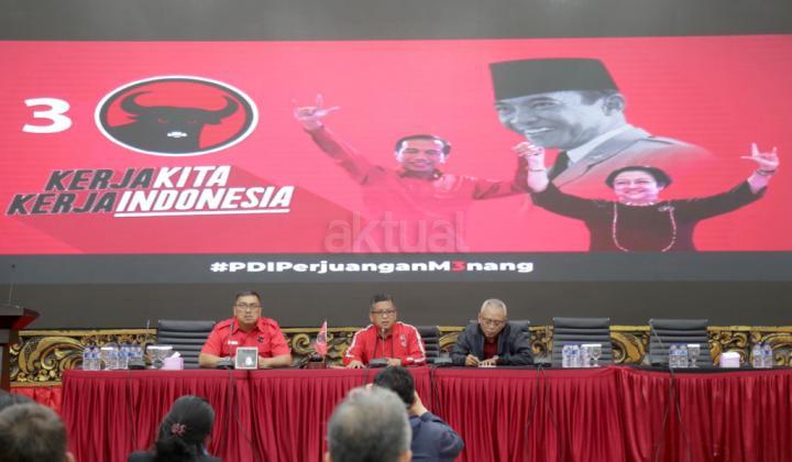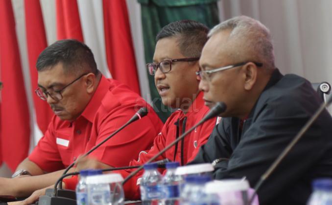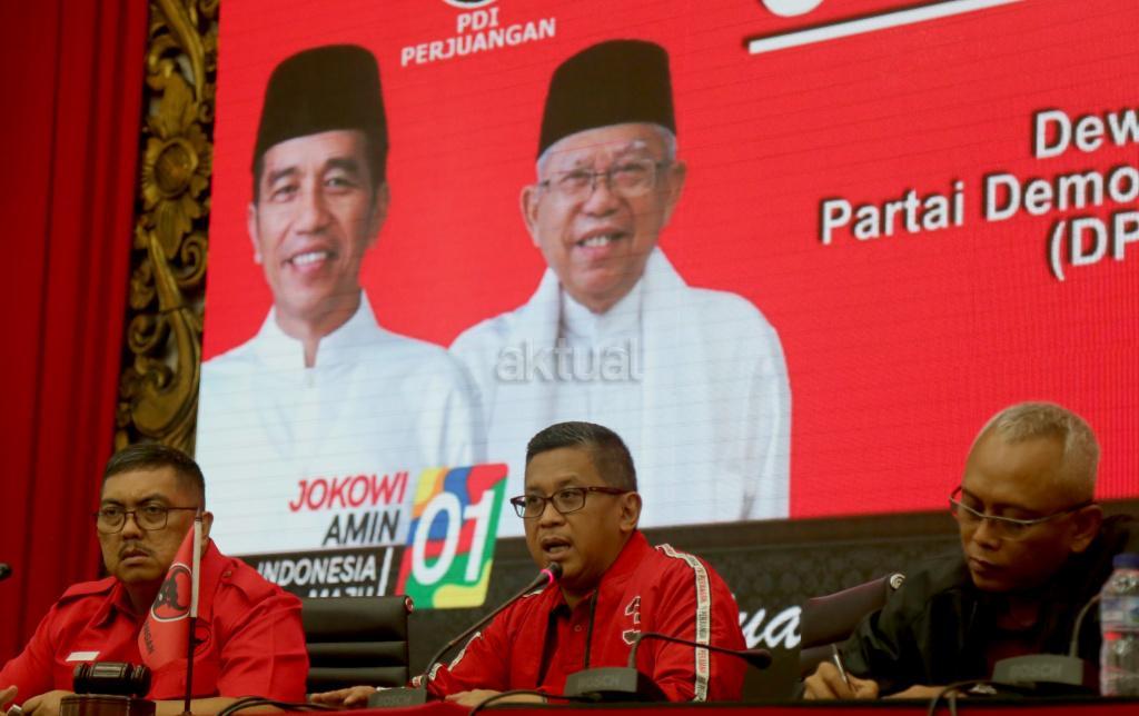 Sekjen DPP PDI Perjuangan Hasto Kristiyanto (tengah) didampingi Wakil Kepala BBHA PDI Perjuangan Yanuar P Wasesa dan anggota Komisi II DPR fraksi PDIP Arif Wibowo (kanan) merespons berbagai isu jelang pelaksanaan Pileg/Pilpres 2019, saat jumpa pers di kantor DPP PDI Perjuangan, Jakarta, Selasa (16/4/2019). AKTUAL/Tino Oktaviano