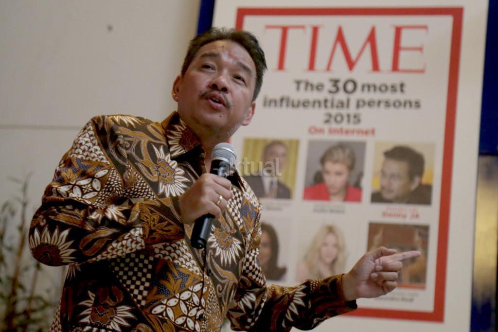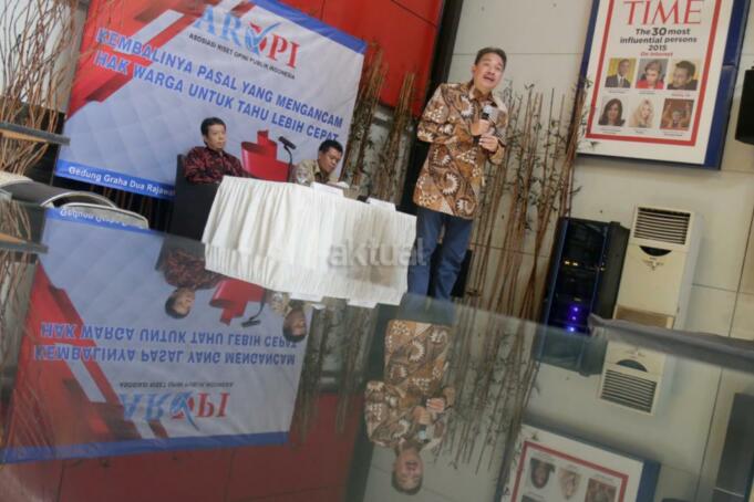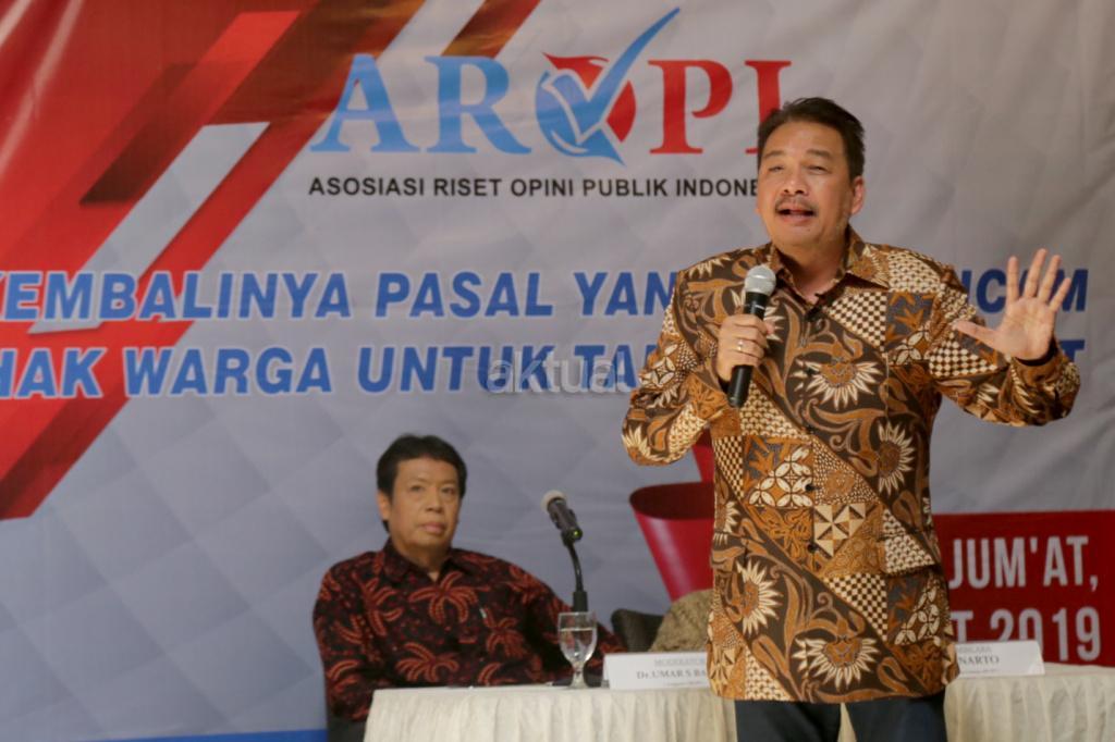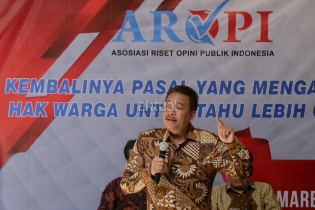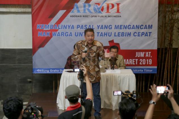 Pendiri Asosiasi Riset Opini Punlik (AROPI), Denny JA mempertanyakan Peraturan Pemilu No 7, Tahun 2017 pasal 449 ayat 2 dan 5 yang melarang Lembaga Survei mengumumkan hasil hitung cepat sebelum dua jam pencoblosan selesai saat jumpa pers di Kantor LSI, Rawamangun, Jakarta, Jumat (15/3/2019). Terkait kembalinya pasal yang memgancam hak warga untuk tahu lebih cepat, maka AROPI mengajukan judicial review ke Mahkamah Konstitusi atas UU tersebut. AKTUAL/Tino Oktaviano