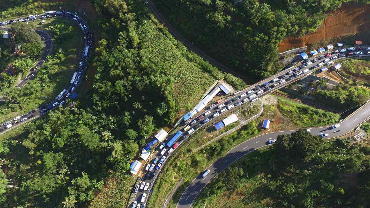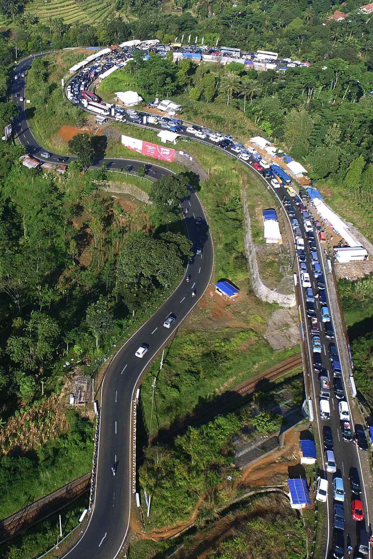 Foto udara antrean kendaraan pemudik di Jalur Selatan Lingkar Gentong, Kabupaten Tasikmalaya, Jawa Barat, Jumat (8/7). Pada H+2 Lebaran volume kendaraan pemudik arus balik yang melintas di jalur selatan mulai meningkat. Diperkirakan puncak arus balik terjadi pada H+3 dan H+4 Lebaran. ANTARA FOTO/Adeng Bustomi/kye/16
