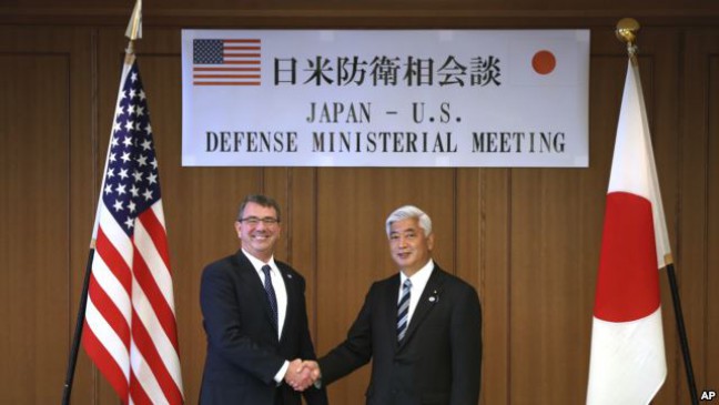 Perdana Menteri Jepang Shinzo Abe, yang menemui Carter, Rabu, telah berpihak untuk meringankan kendala pasifis Jepang, era konstitusi Perang Dunia II. Para pejabat AS telah mendukung upaya Abe untuk menafsirkan konstitusi untuk mengizinkan Jepang hak untuk melakukan “kolektif membela diri.” Para pejabat AS dan Jepang diharapkan untuk menyelesaikan pedoman akhir bulan ini, menjelang kunjungan Abe ke Washington.