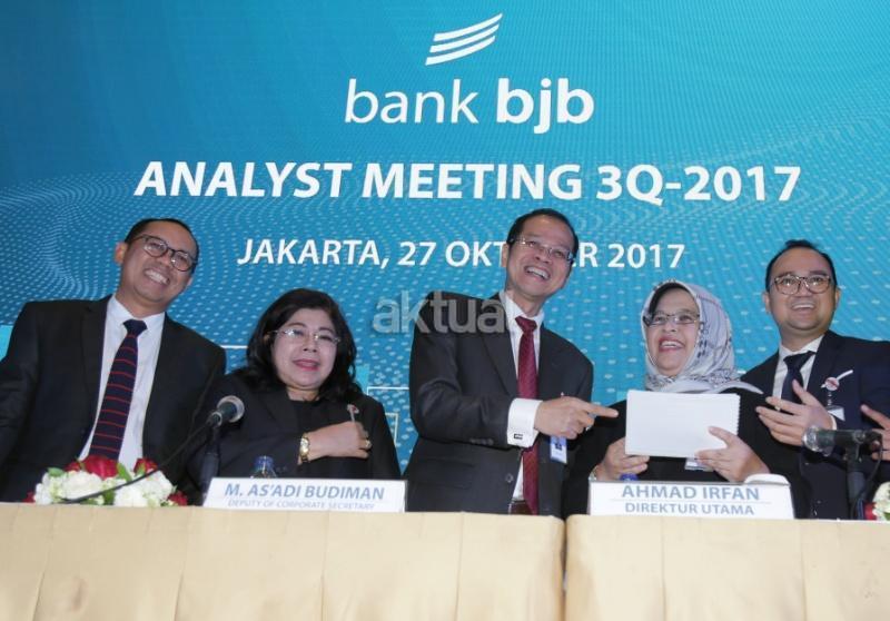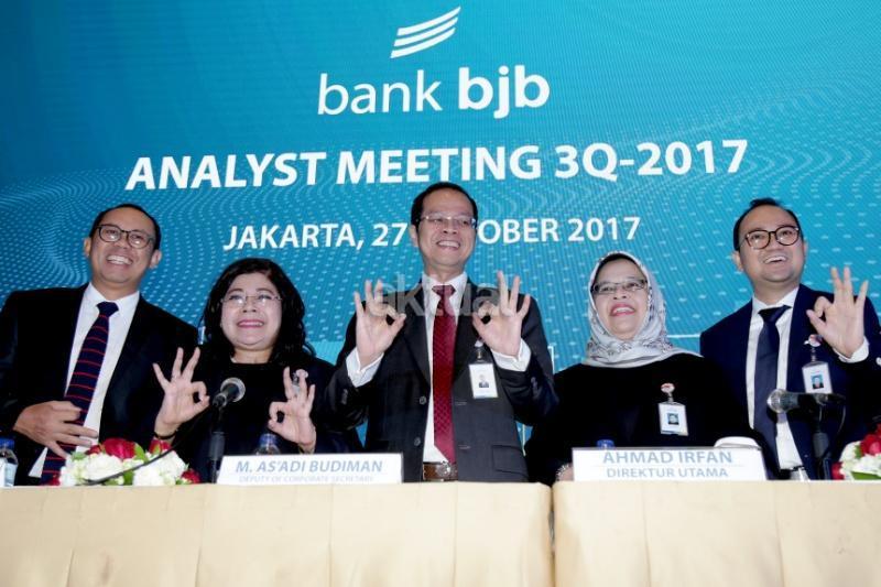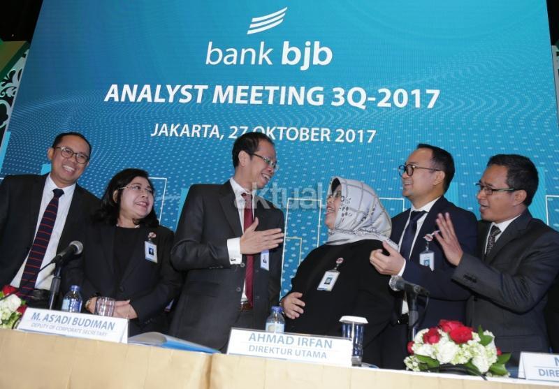 Direktur Utama bank bjb Ahmad Irfan (tengah) didampingi jajaran direksi dan komisaris berbincang usai memaparkan kinerja perusahaan di Jakarta, Jumat (27/10). PT Bank Pembangunan Daerah Jawa Barat dan Banten Tbk. (IDX: BJBR) mencatat total aset sebesar Rp114,2 triliun atau tumbuh 12,5 persen year on year (y-o-y) hingga triwulan III tahun 2017. AKTUAL/Tino Oktaviano